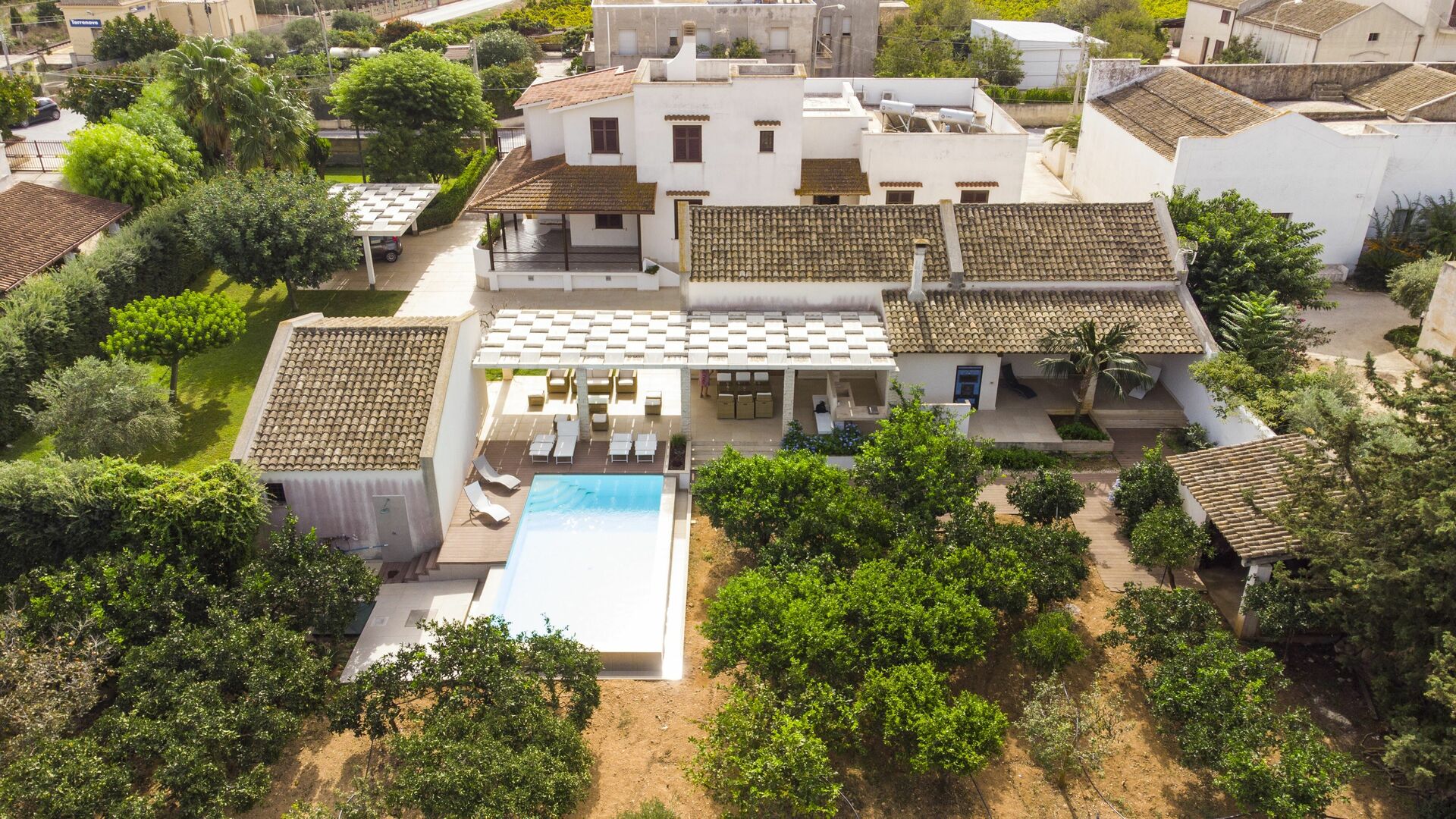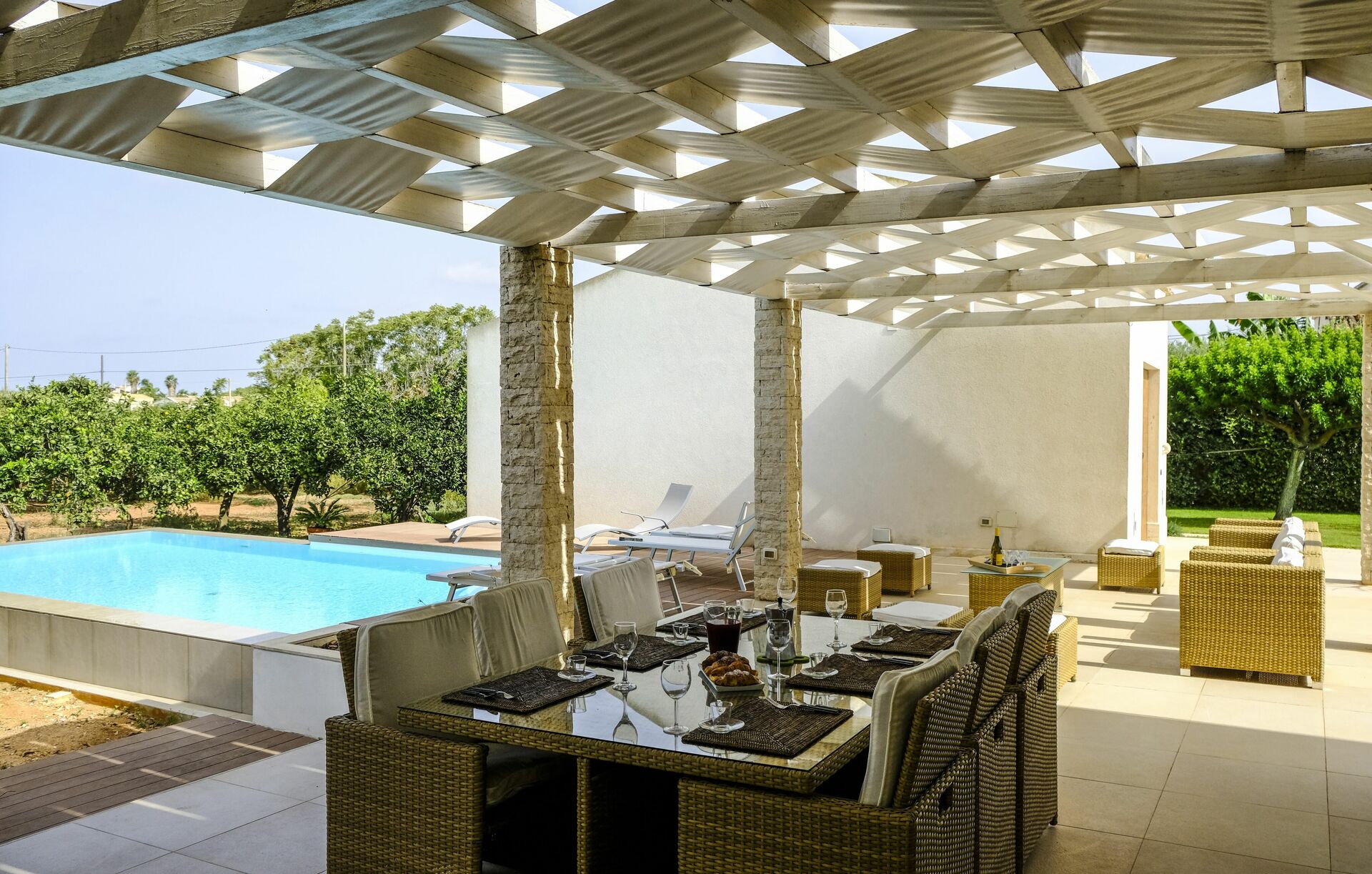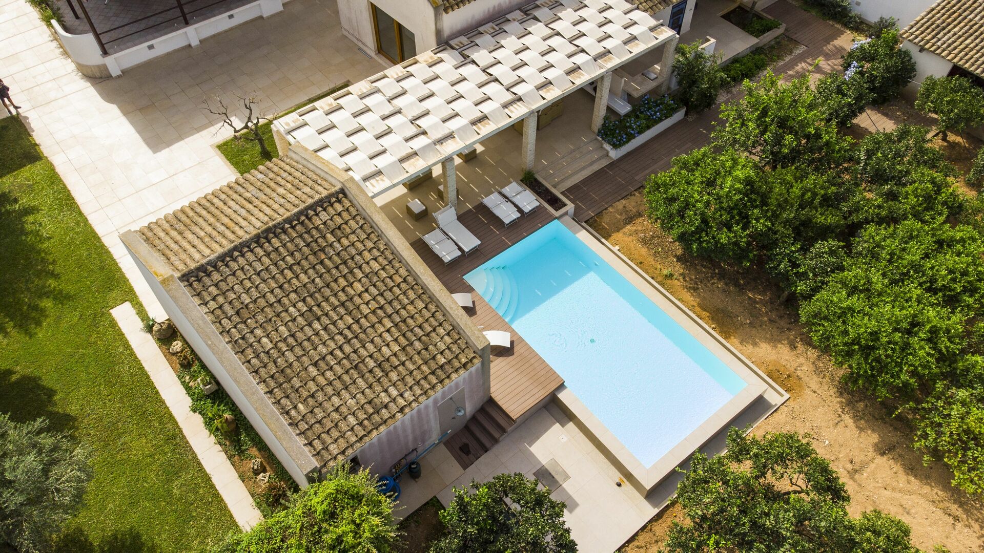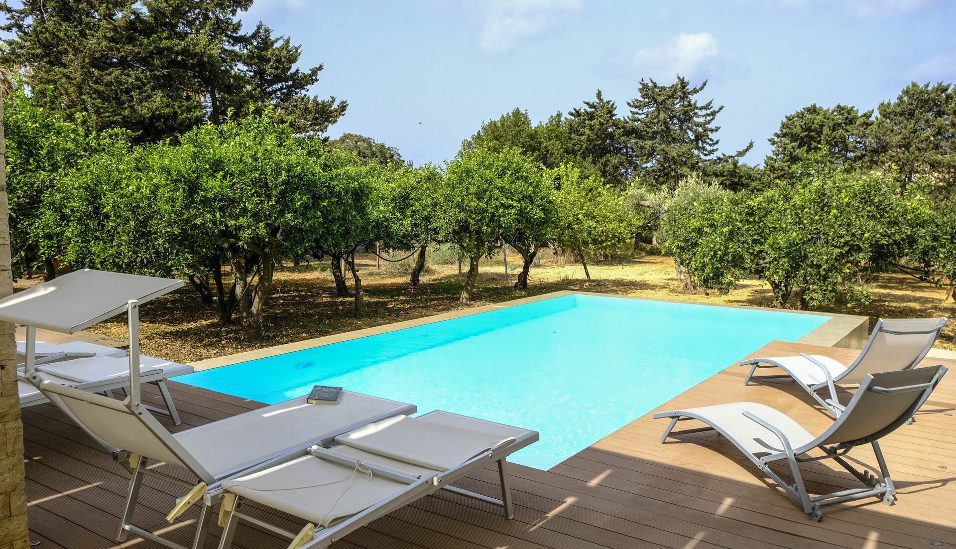 Huset er omgivet af en duftende citruslund. Poolen og terrassen er perfekte til at tilbringe behagelige afslappende stunder udendørs.