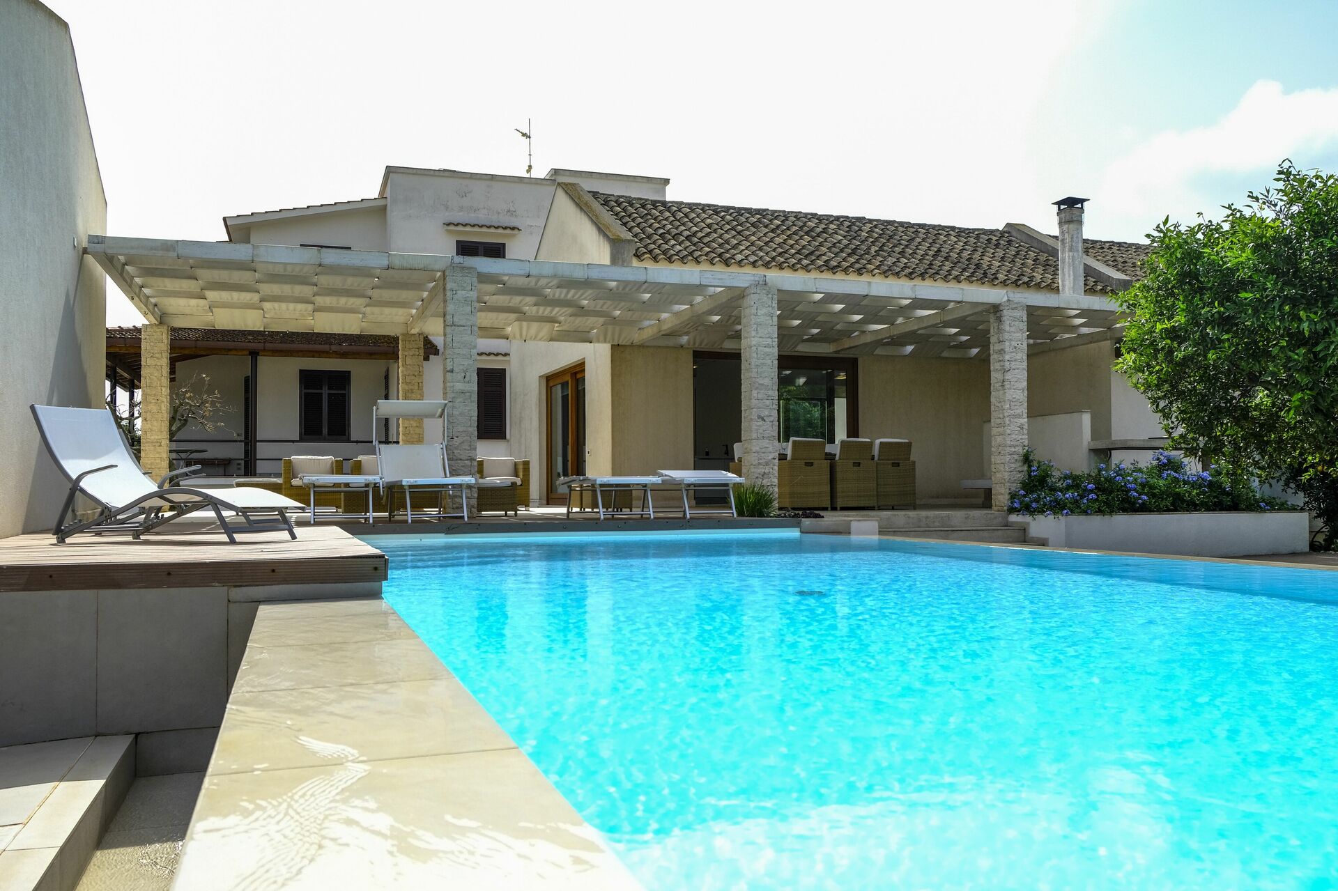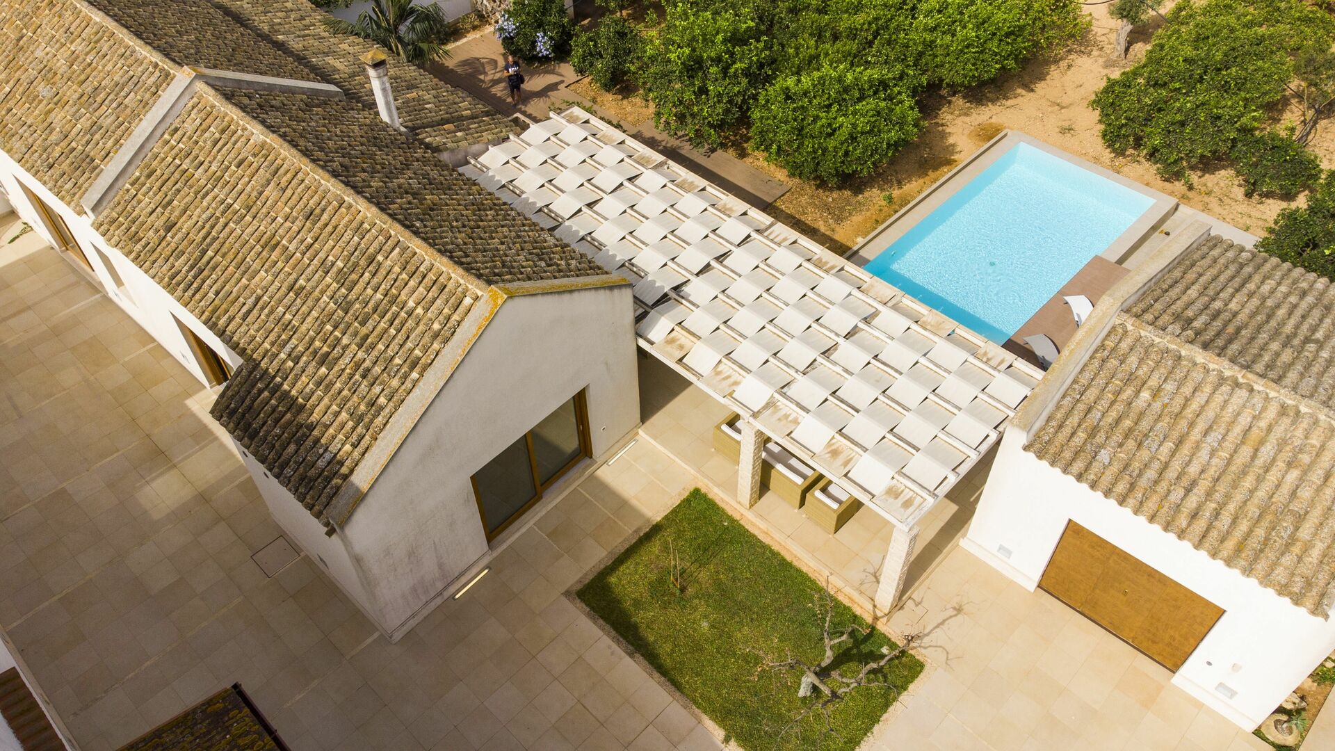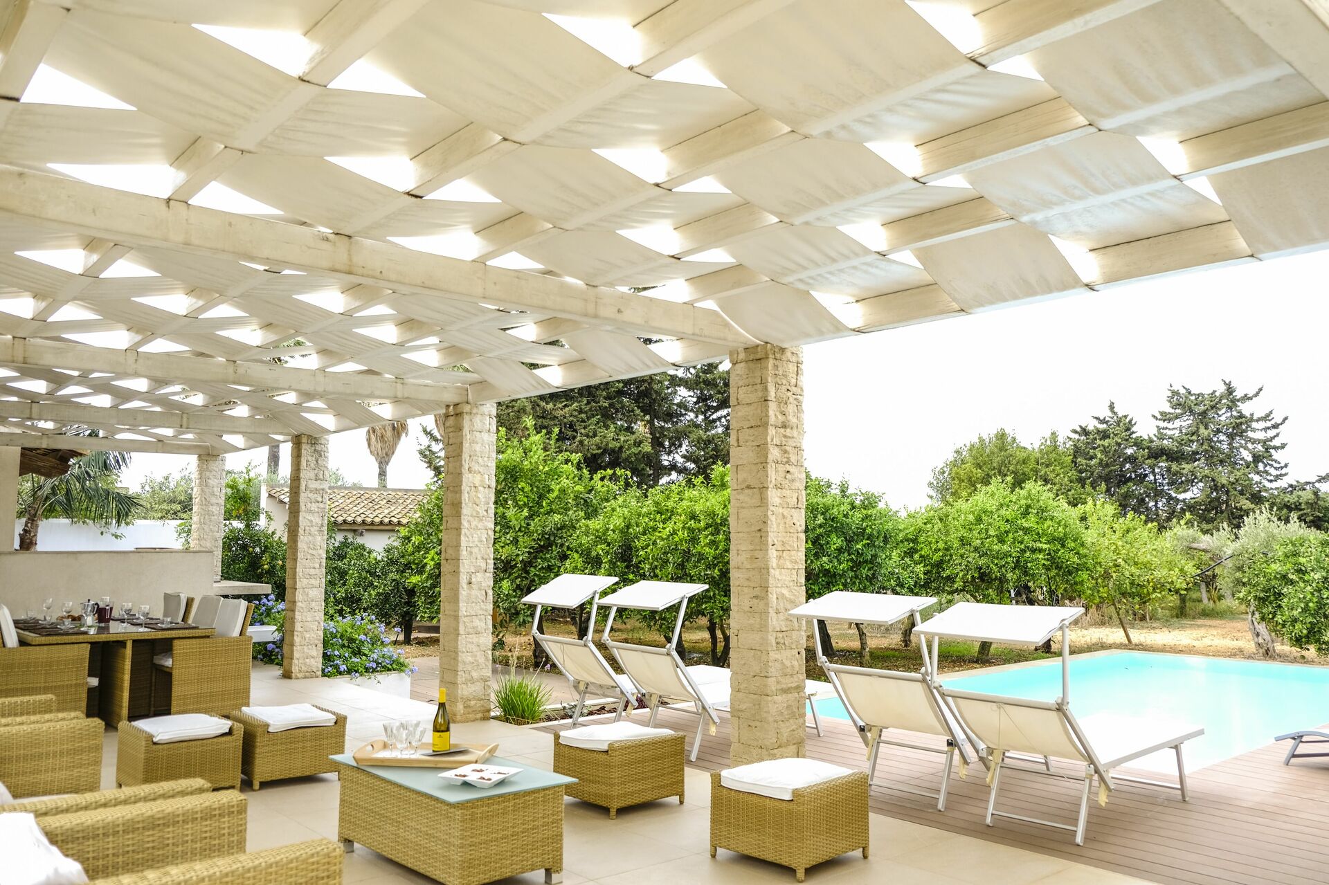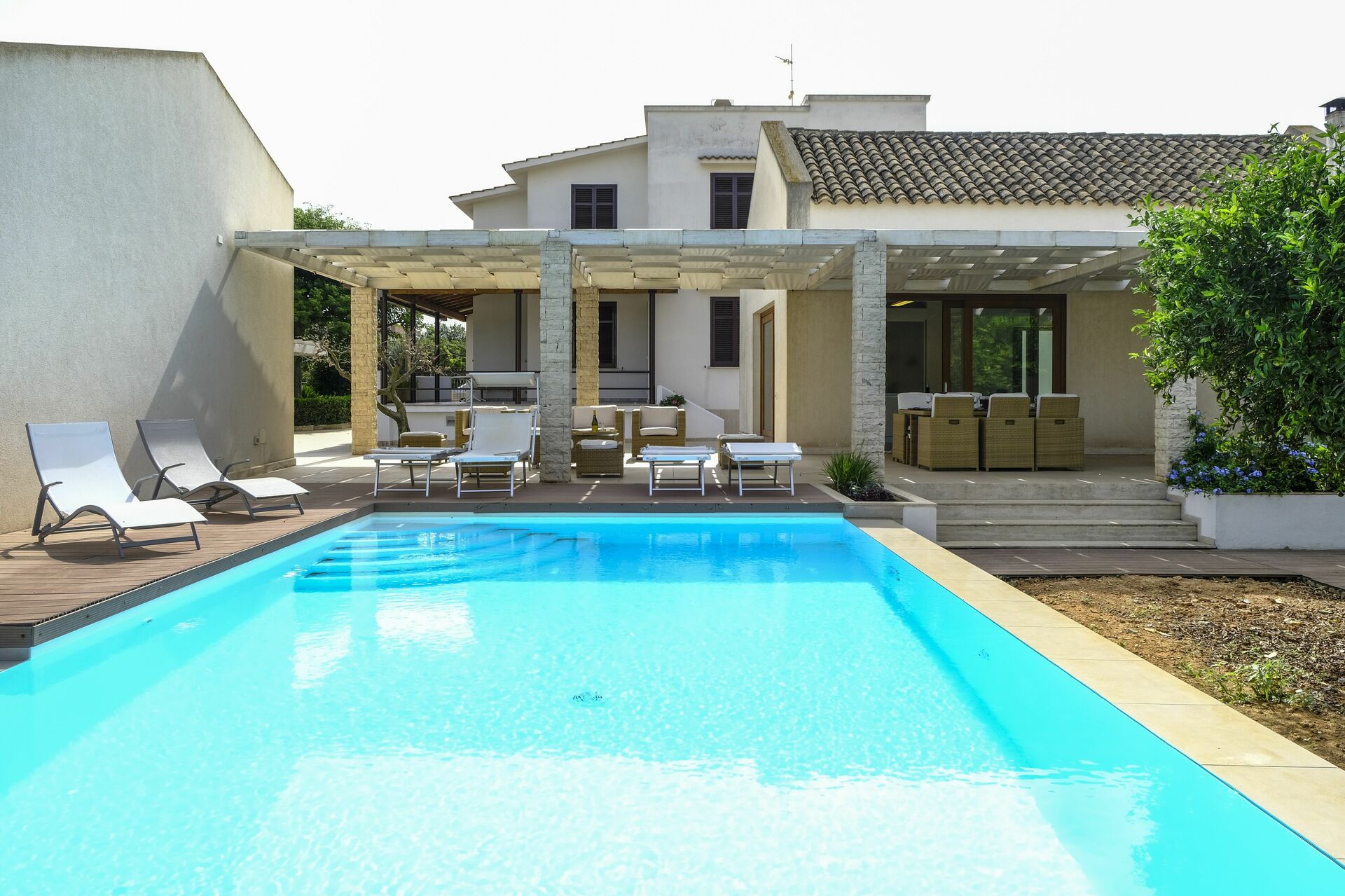 Huset er omgivet af en duftende citruslund. Poolen og terrassen er perfekte til at tilbringe behagelige afslappende stunder udendørs.