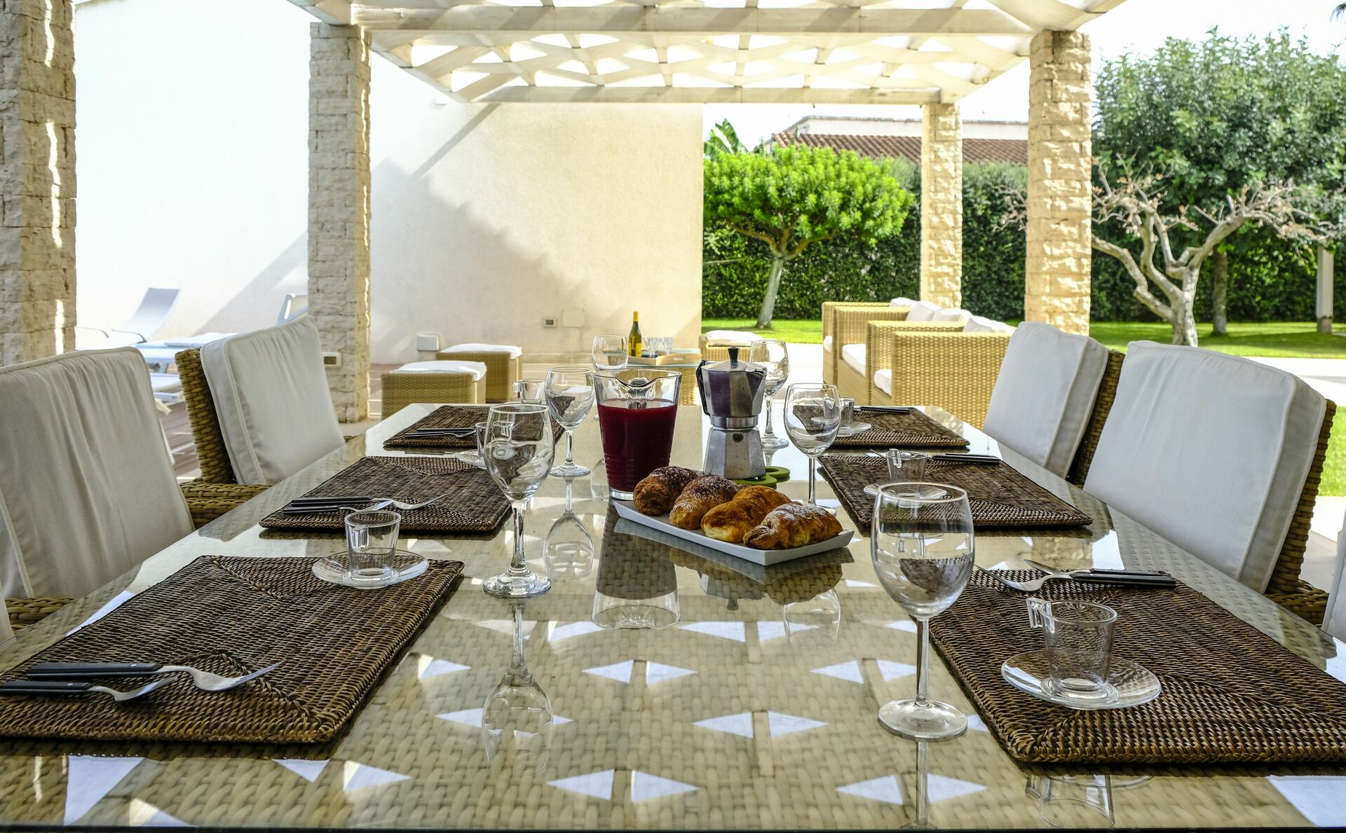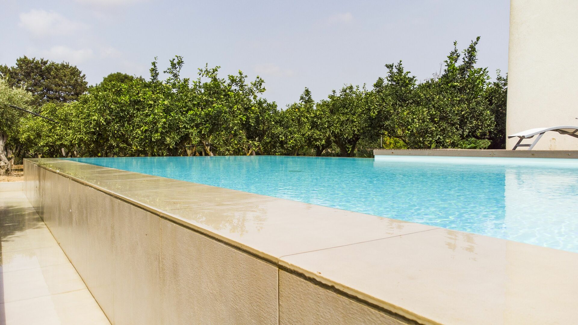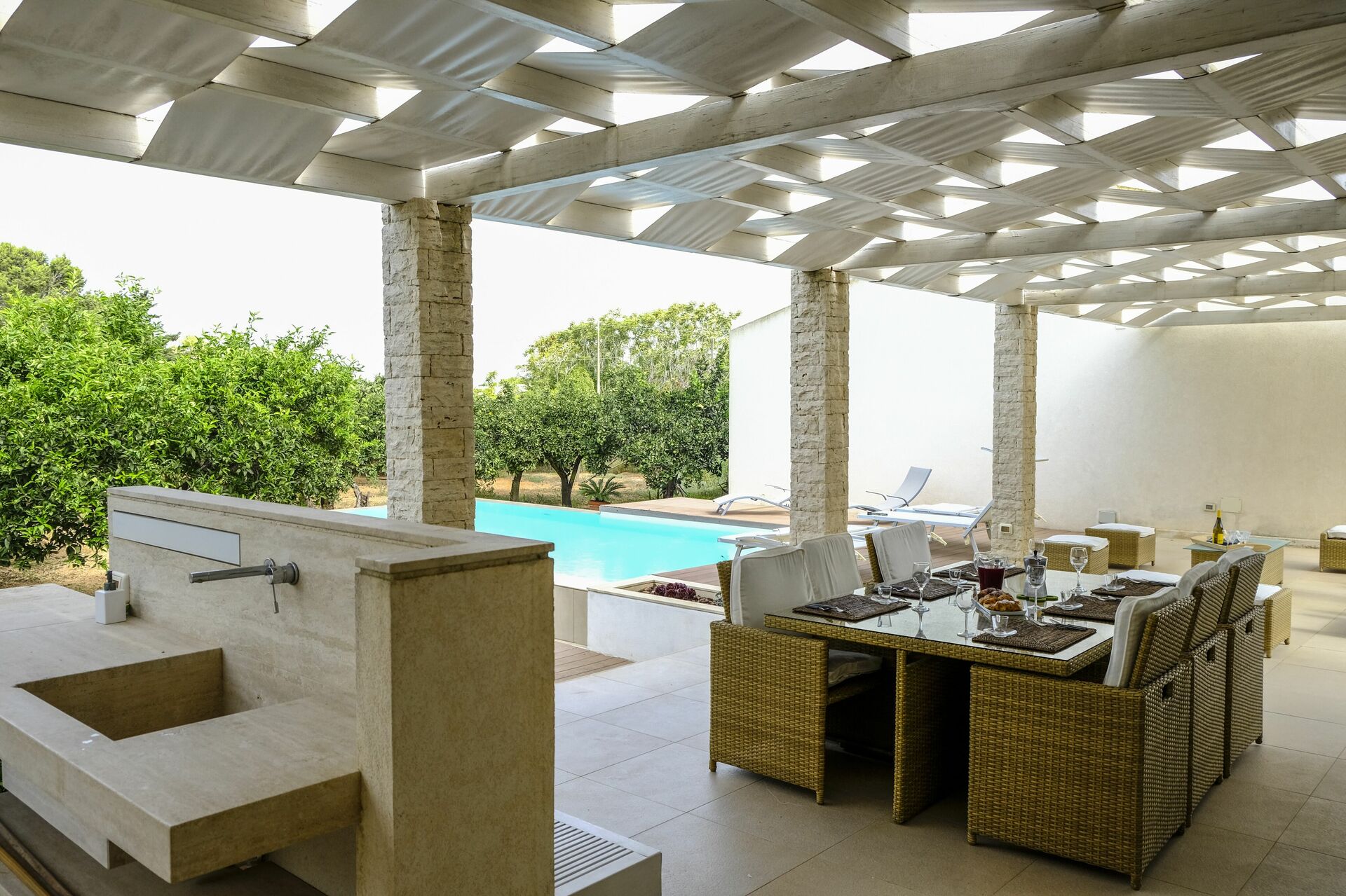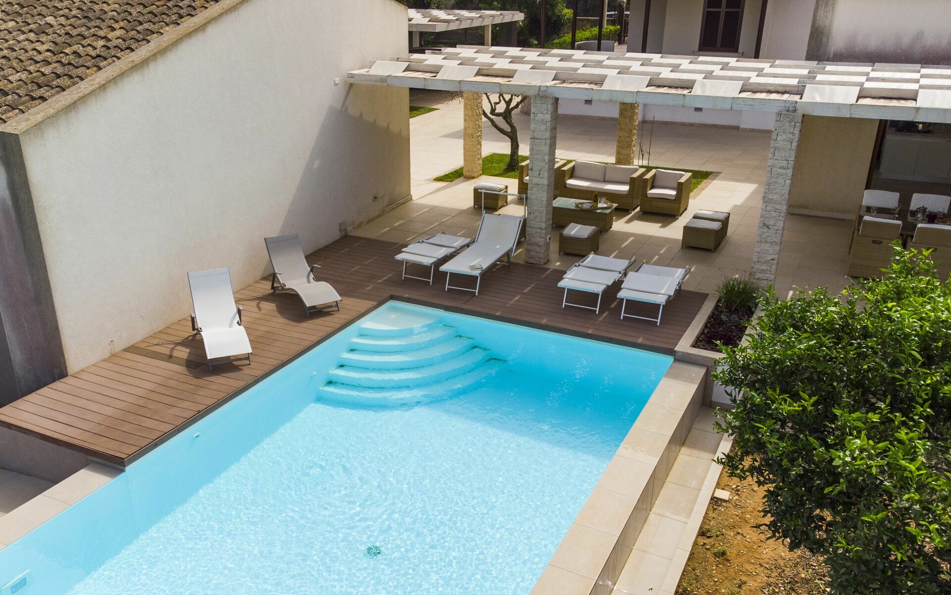 Huset er omgivet af en duftende citruslund. Poolen og terrassen er perfekte til at tilbringe behagelige afslappende stunder udendørs.
