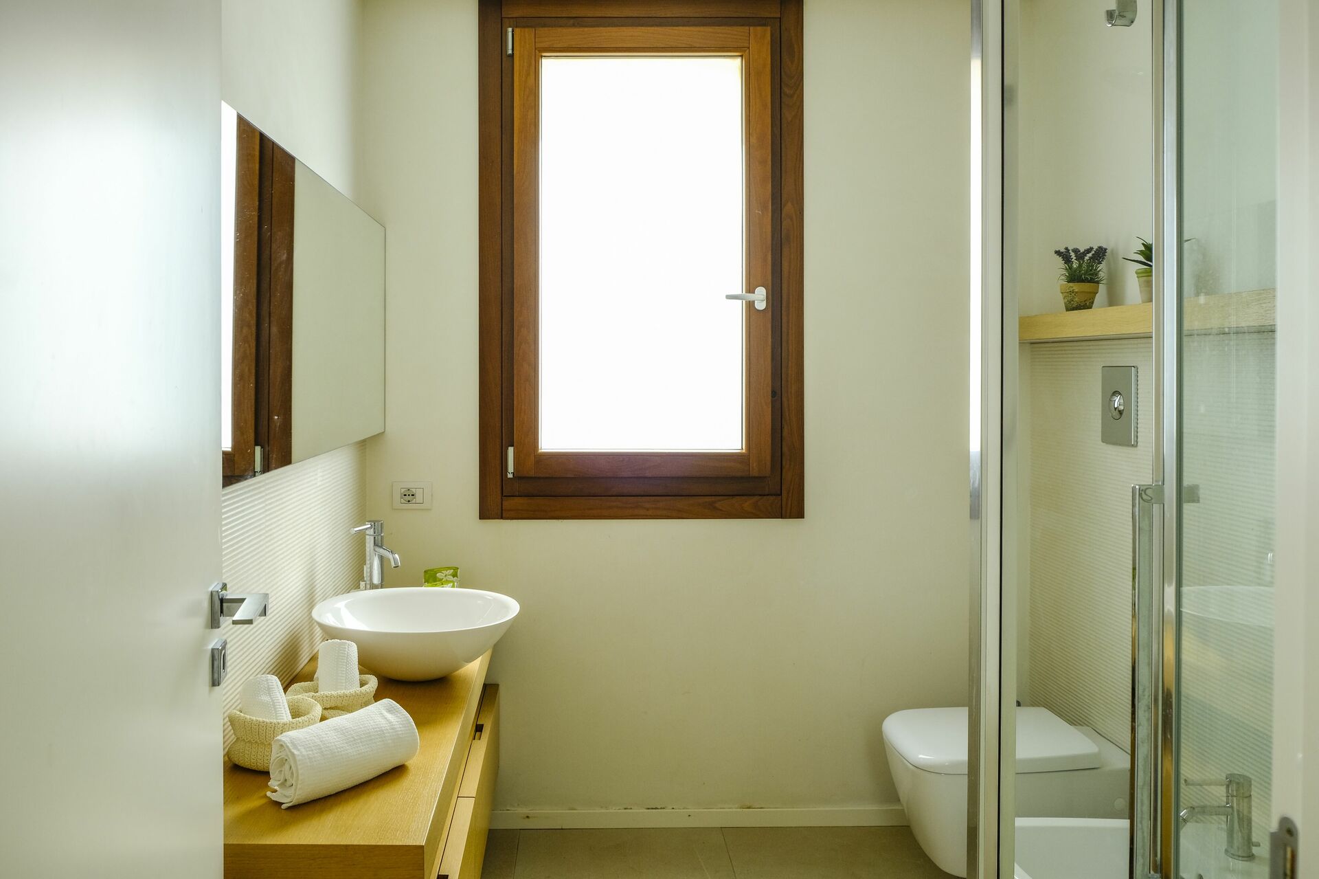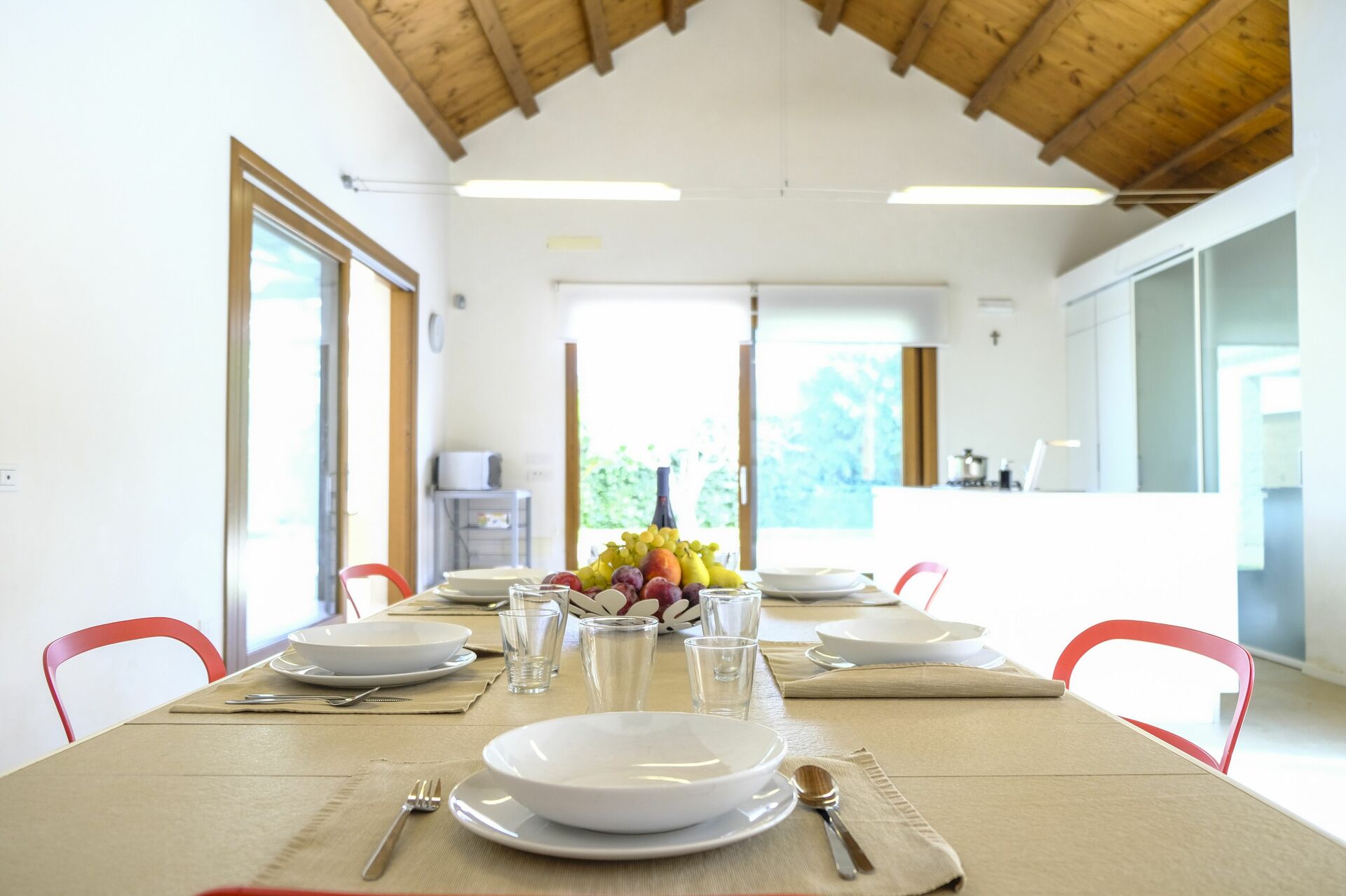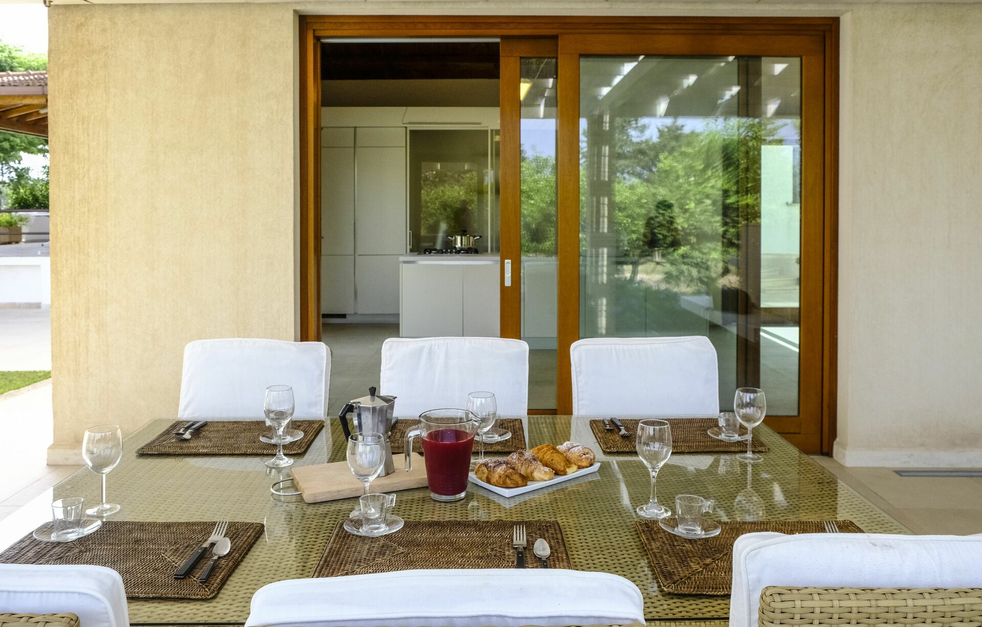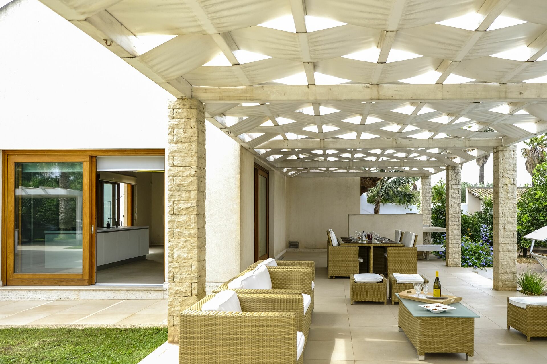 Villaen er i ét plan og består af to dele: I hovedhuset er der 4 soveværelser, mens en stue med et femte værelse er på loftet, som ejerne har restaureret på en måde der har bevaret den oprindelige struktur. Møblerne er raffinerede og skaber en varm og behagelig atmosfære.