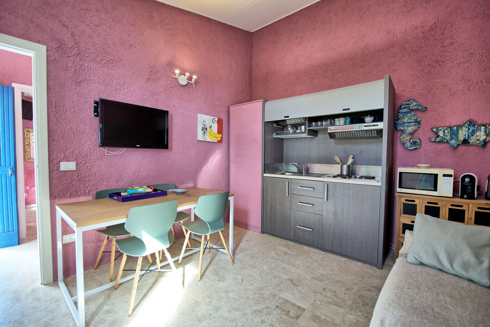 Stue med dobbelt sovesofa og spiseområde med køkkenhjørne (kogeplade, ovn, køleskab, fryser), 1 dobbeltværelse (aircondition), badeværelse med bruser med kromoterapi
