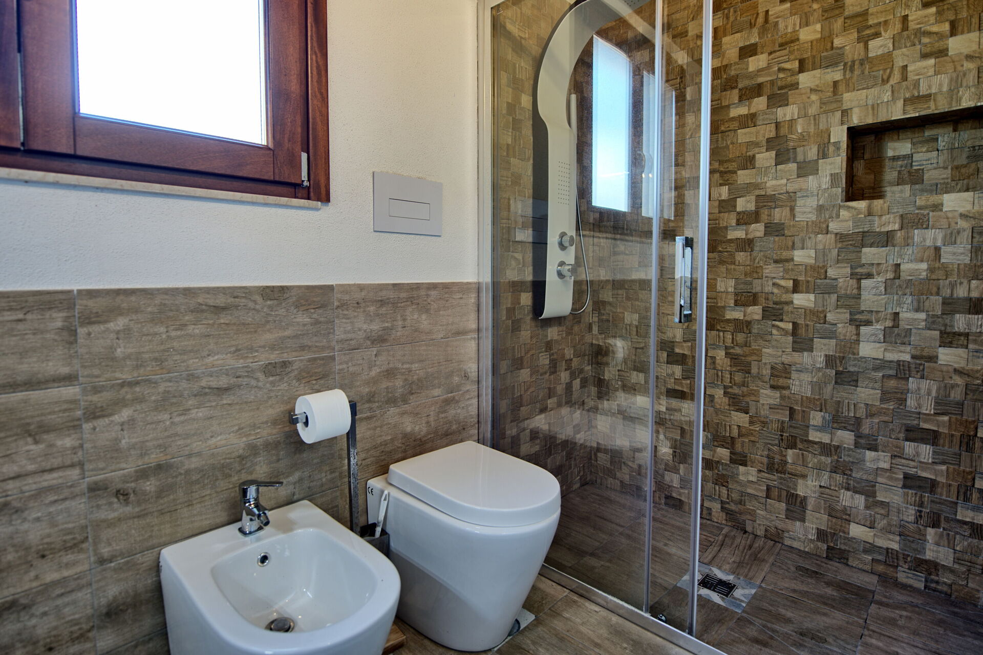 Indgang til spisestue (satellit-tv) med køkkenhjørne (kogeplade, ovn, køleskab, fryser, opvaskemaskine, mikroovn, brødrister, espressomaskine), 3 dobbeltværelser (aircondition), 2 badeværelser med bruser med kromoterapi