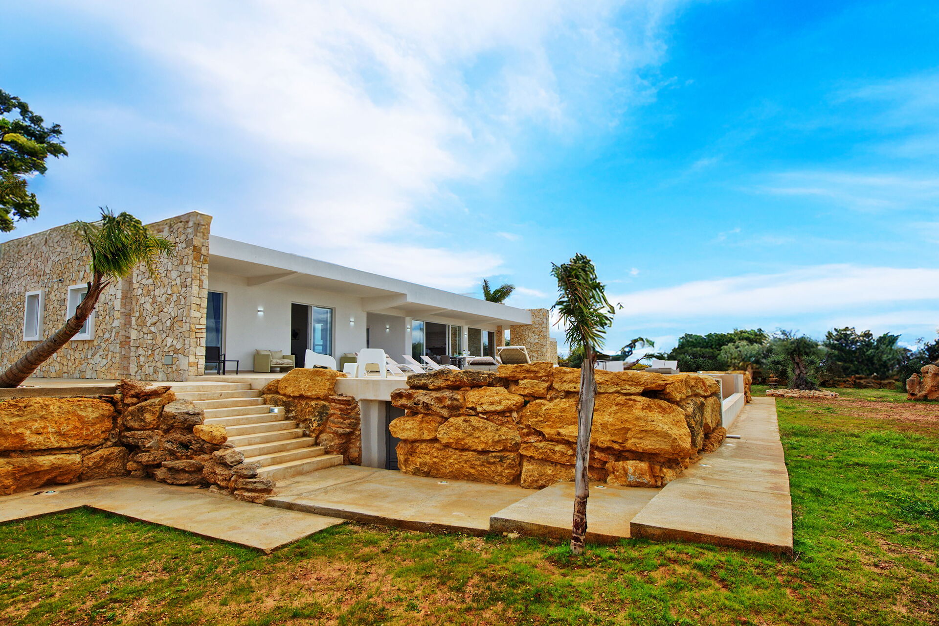 Upon approaching the villa, the border of this property is lined with huge impressive boulders, then you reach a white electric gate, to welcome you into this magnificent, architecturally perfect villa! The online photos are good, but seeing it in person, is visually stunning. It exceeded our expectations. The pool overlooking the countryside -to the ocean-is serene and beautiful. There’s a small garden with fresh vegetables, to be enjoyed by all. It’s in a very private area, quiet location, surrounded by vineyards and olive trees. Plenty of outdoor seating areas to lounge around….