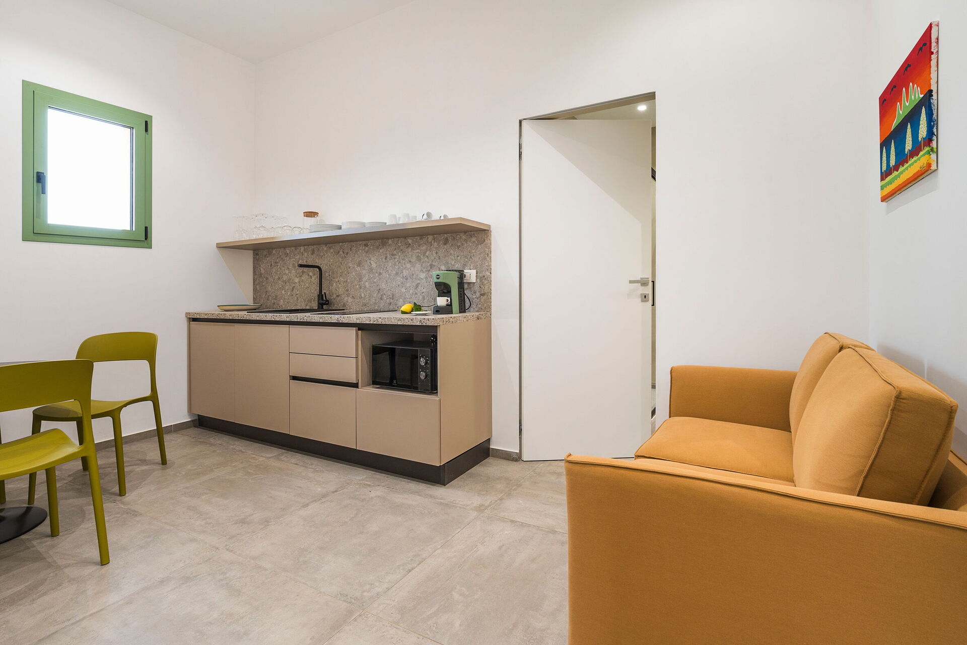 Stueetage: stue med tekøkken (induktionskogeplade, køleskab, mikrobølgeovn, espressomaskine), dobbeltværelse (aircondition) med eget badeværelse med bruser.