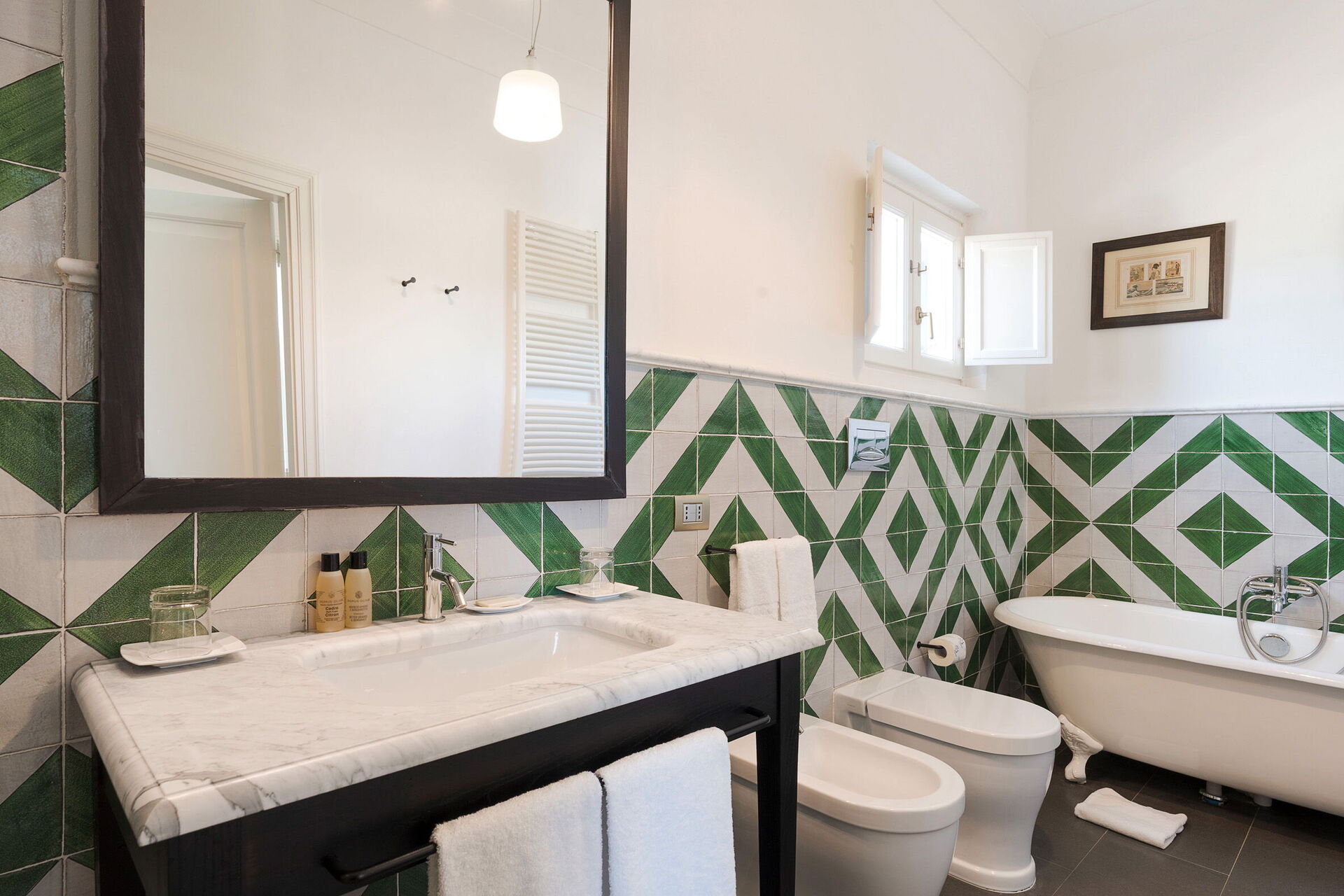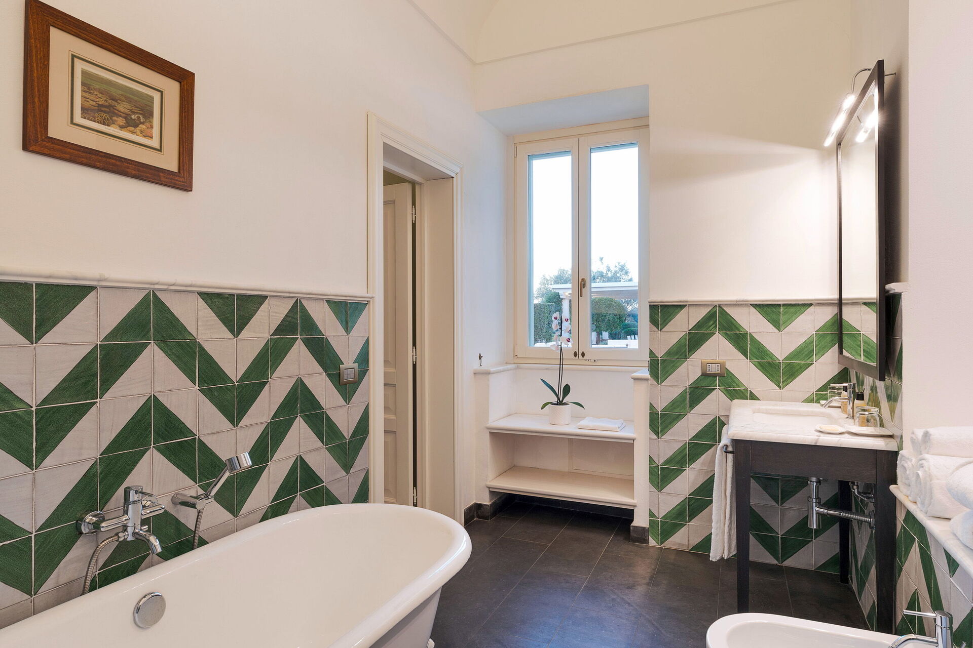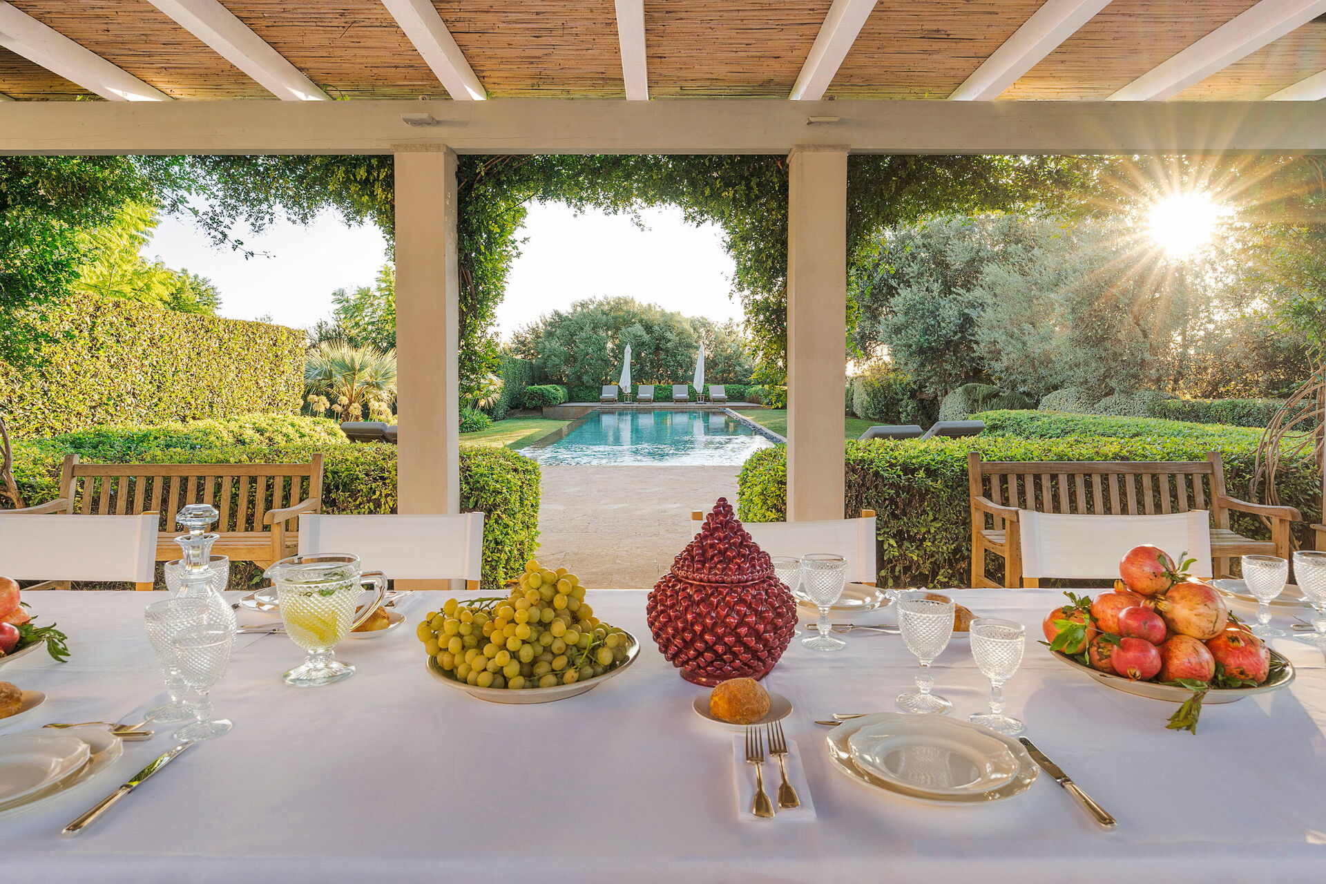 Domus Olivae er omgivet af en stor velholdt have og byder på en smuk pool omgivet af store solrige terrasser, samt en loggia med bord og stole, hvor du kan nyde morgenmad, frokost og middag udendørs.