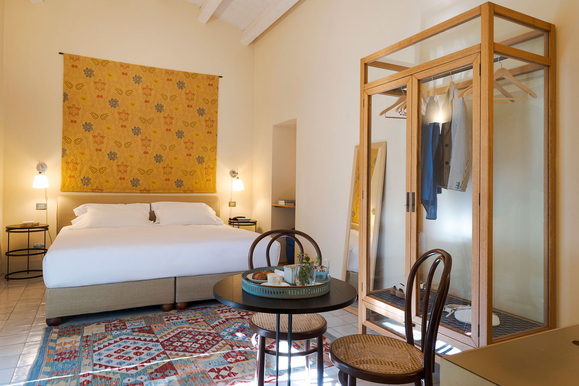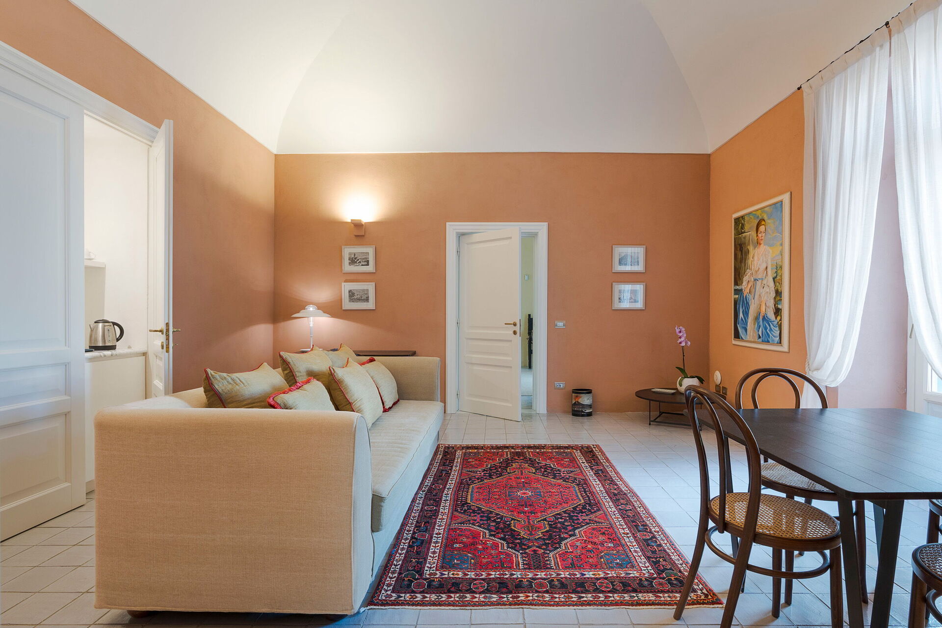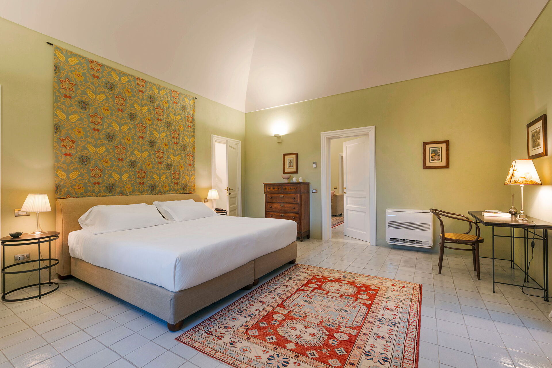 Første sal (indvendige trapper og elevator): dobbeltsuite med opholdsstue, tekøkken med lille køleskab, privat badeværelse med bruser (sengemål: 200 x 200 cm).