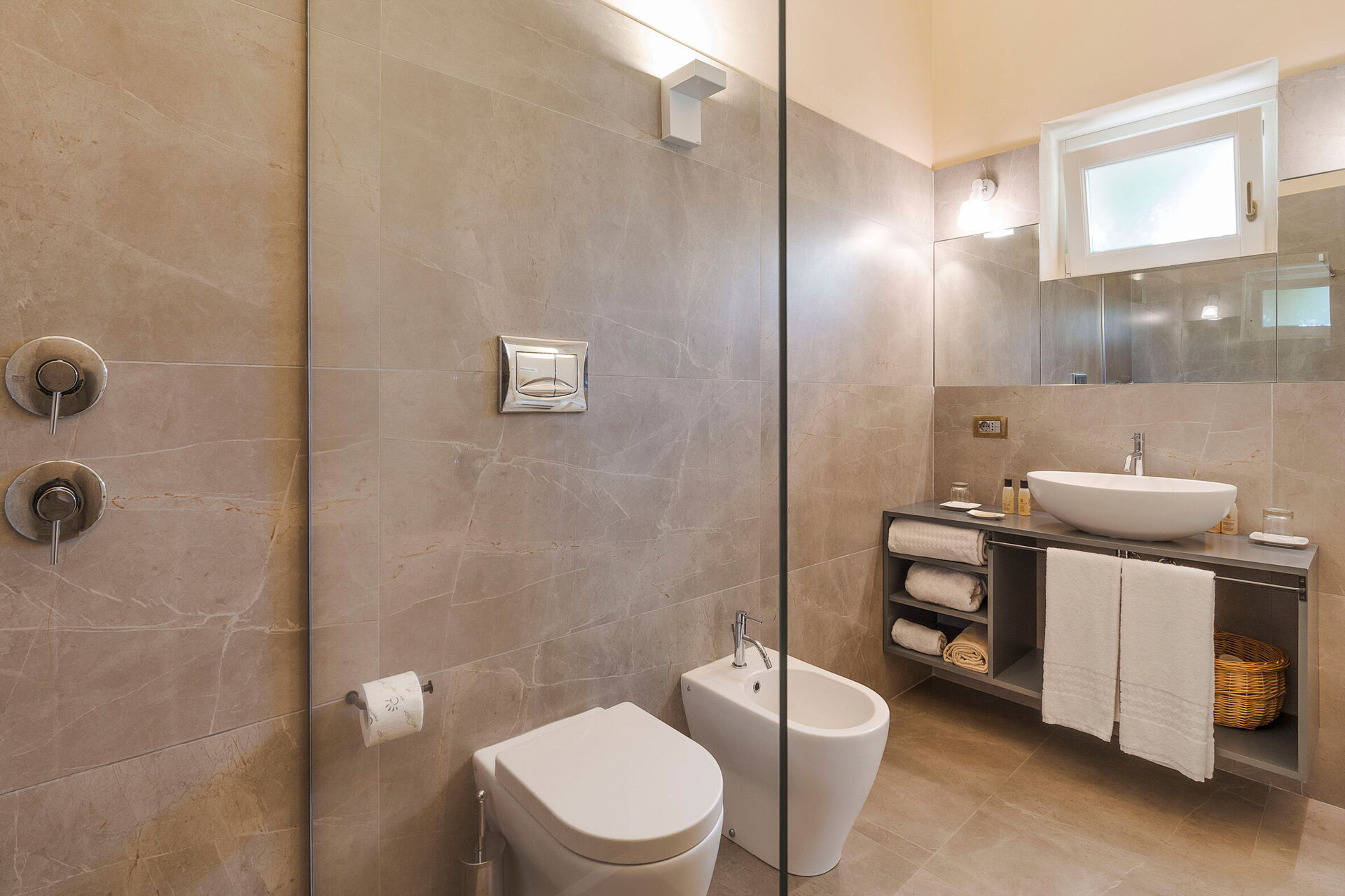 Ejendommen byder på store udendørs og indendørs arealer, perfekt for større grupper som ønsker at holde ferie sammen: med en veludstyret og komfortabel indretning, 4 suiter, 2 soveværelser og to etager (forbundet med elevator) kan ejendommen rumme op til 12 personer. Huset er smagfuldt indrettet med flotte detaljer og designmøbler.