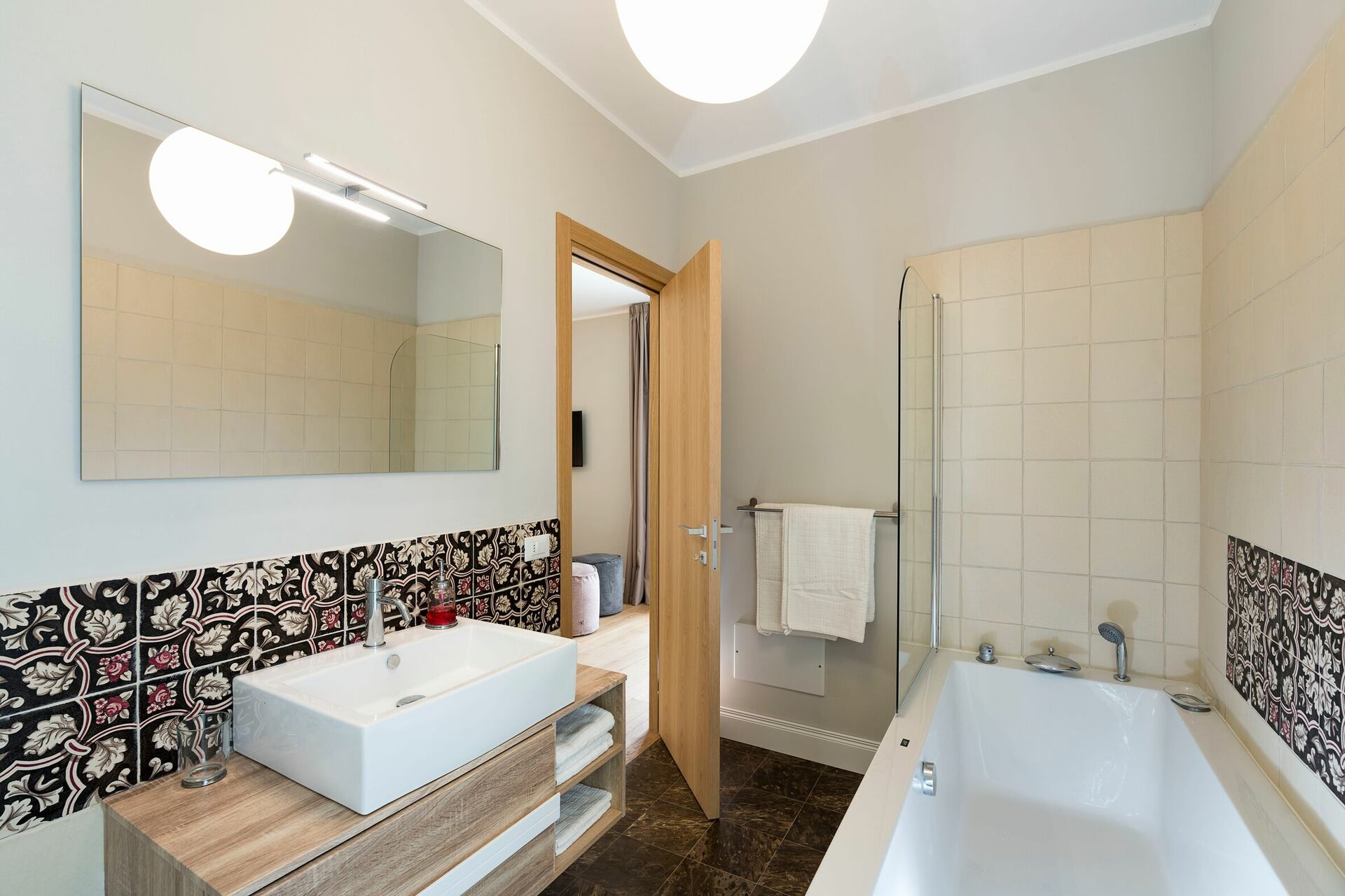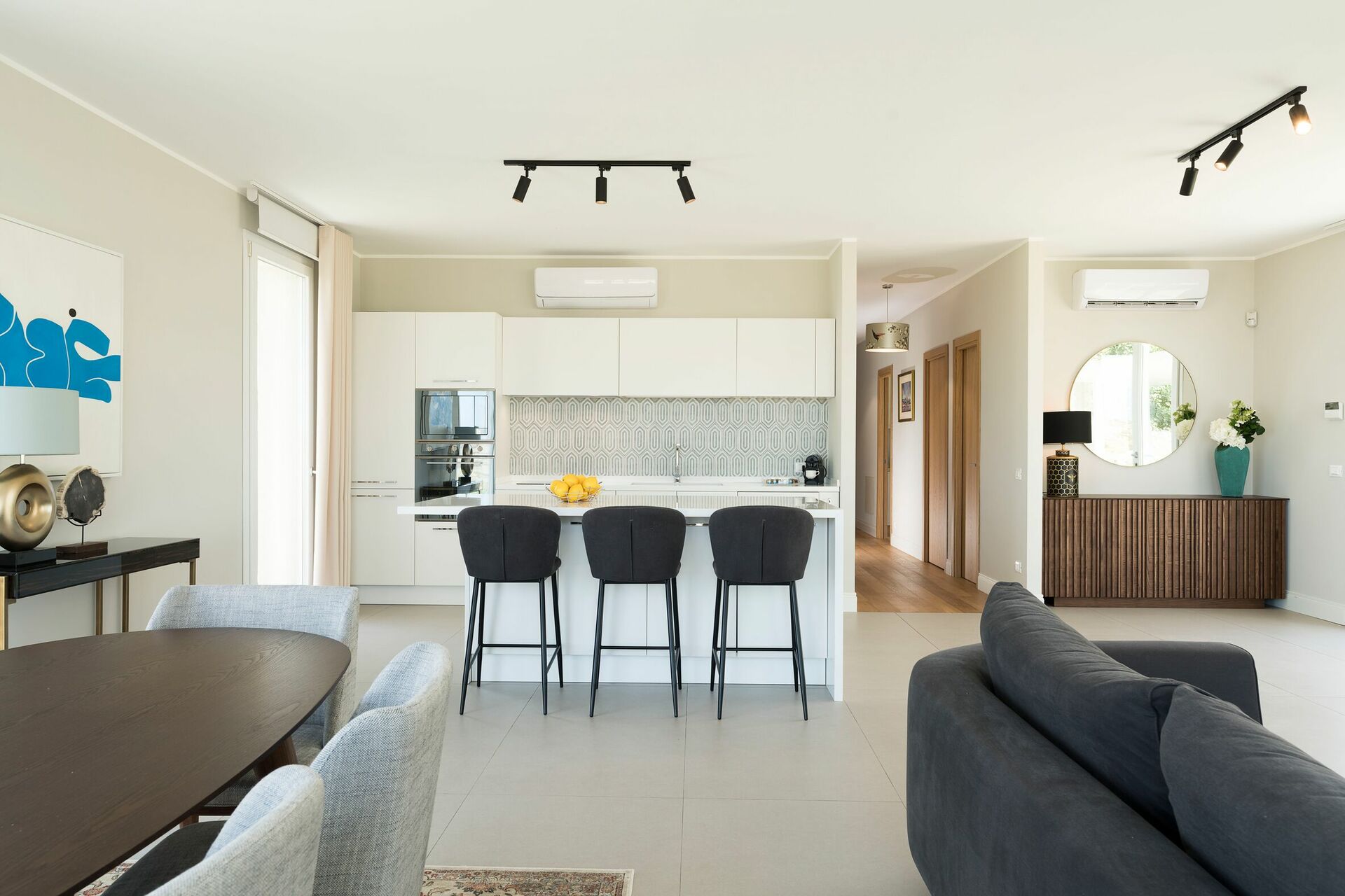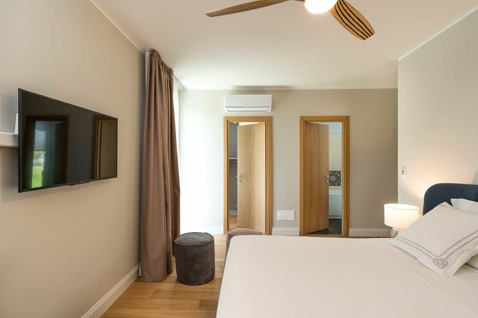 Stue med spiseplads og køkken (ovn, fryser, mikroovn, kaffemaskiner, opvaskemaskine), vaskerum, 1 badeværelse (vask og toilet), 1 soveværelse med dobbeltseng (kingsize seng) med privat badeværelse med badekar, 2 soveværelser med dobbeltsenge hver med eget badeværelse med bruser.