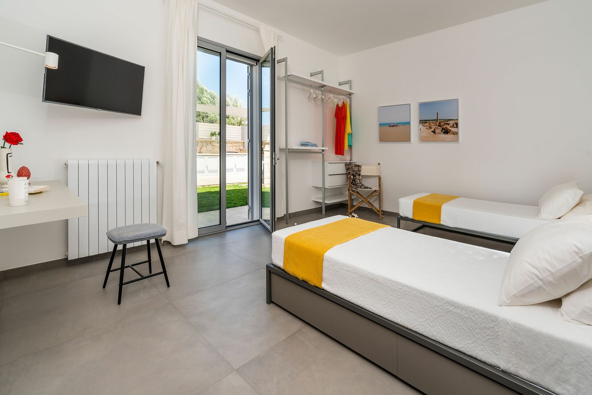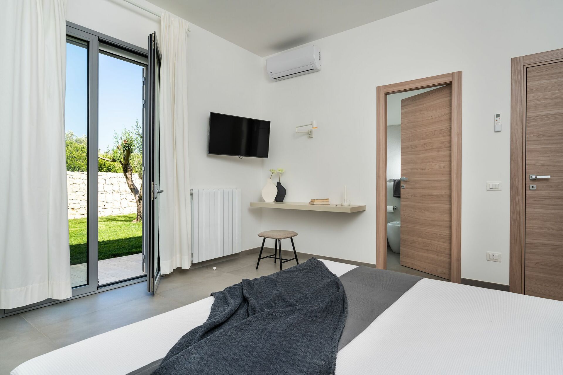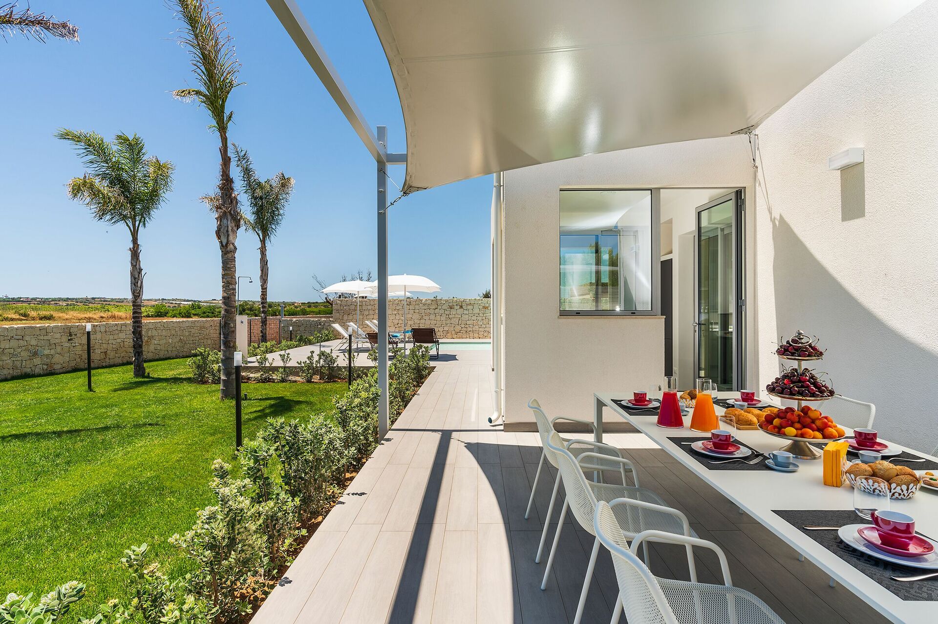 Villa Nica er nybygget med lyse overflader, en indbydende indretning og værelser der åbner ud til udearealet.