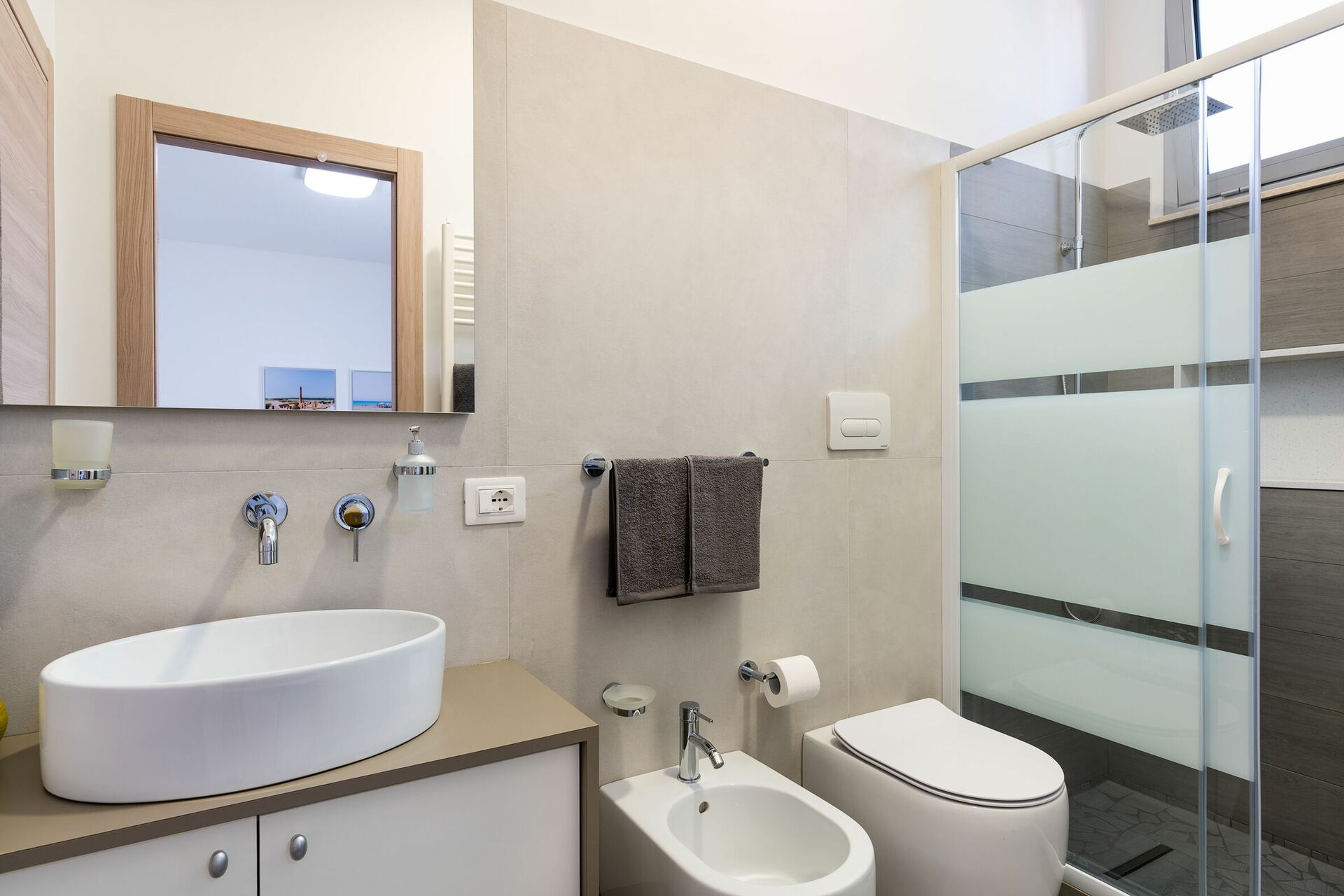 Stueetagen: stue med spiseplads; køkken (ovn, fryser, opvaskemaskine, kaffemaskine, mikroovn); 1 soveværelse med dobbeltseng med privat badeværelse med bruser; 1 soveværelse med dobbeltseng + 1 enkeltseng med eget badeværelse med bruser, 1 soveværelse med en dobbeltseng eller to enkeltsenge, 1 badeværelse med bruser.