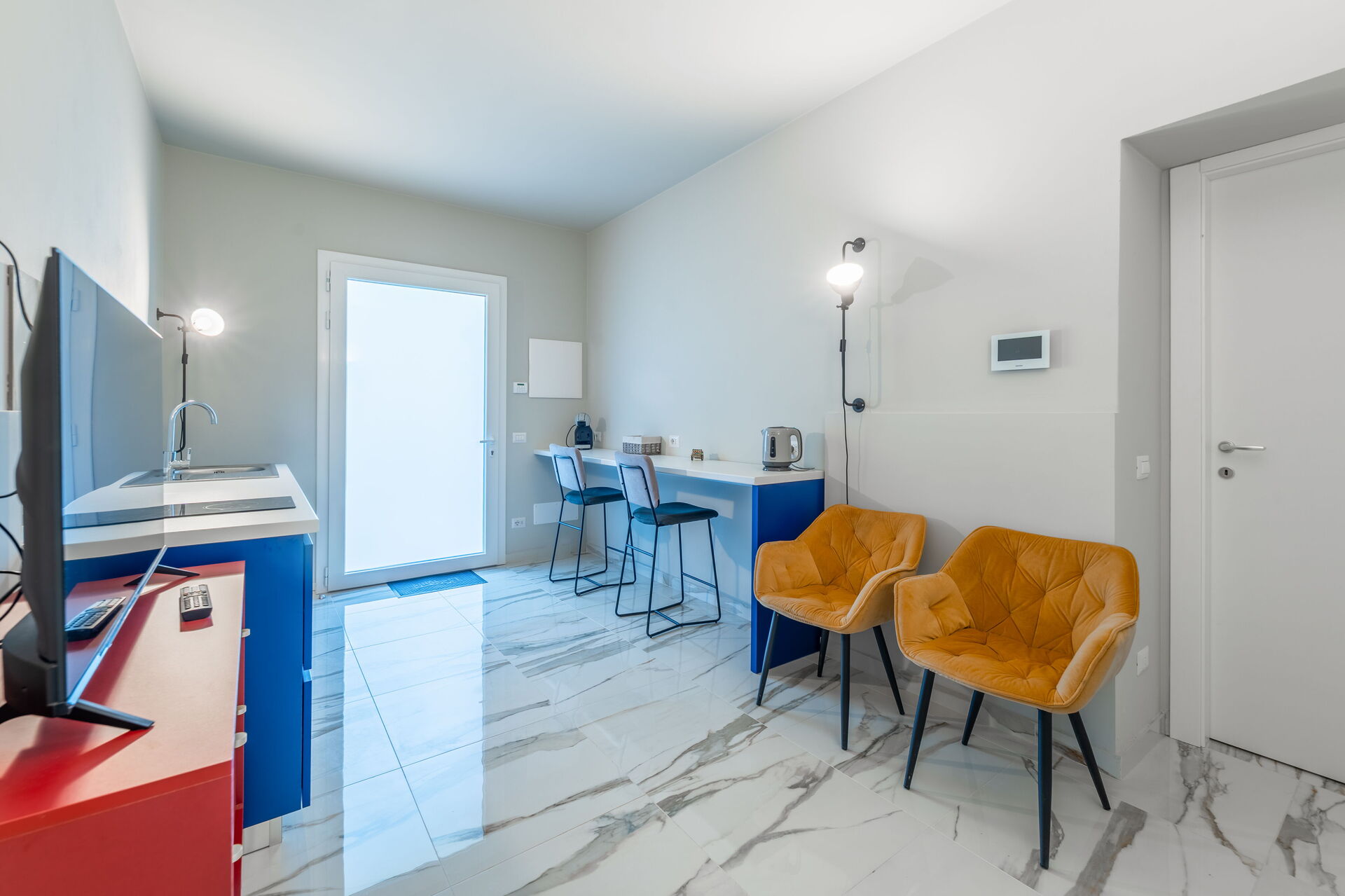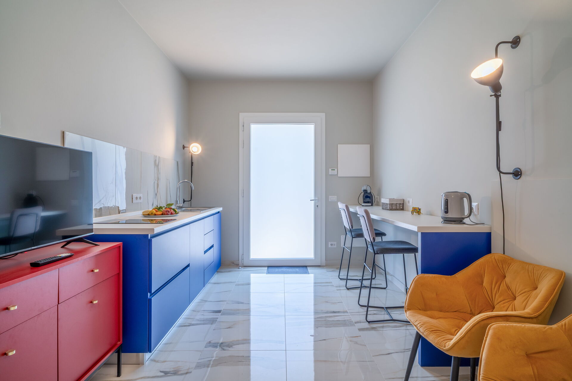 Stor stue med stue, spisestue og køkken (ovn, fryser, opvaskemaskine, mikroovn, espressomaskine); WC med vaskemaskine; 2 soveværelser med dobbeltsenge, hver med eget badeværelse med bruser