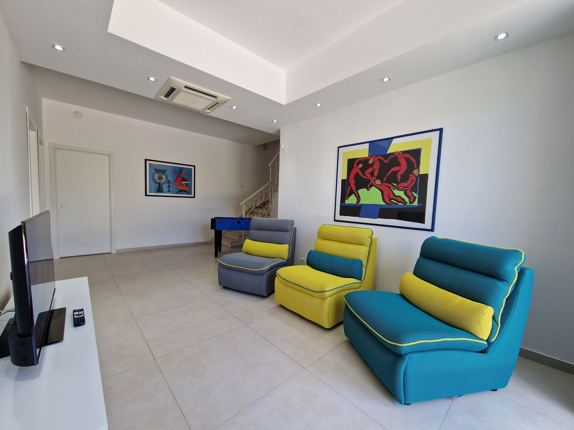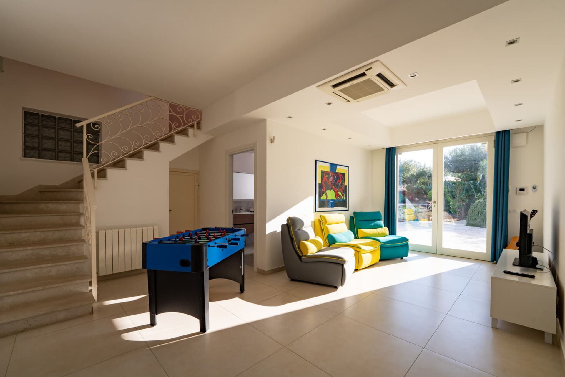 Nedre etage: opholdsstue med afslapningsområde (aircondition, TV, bordfodbold) med adgang til terrasse, 2 dobbeltværelser (aircondition), værelse med 2 enkeltsenge, badeværelse med bruser.