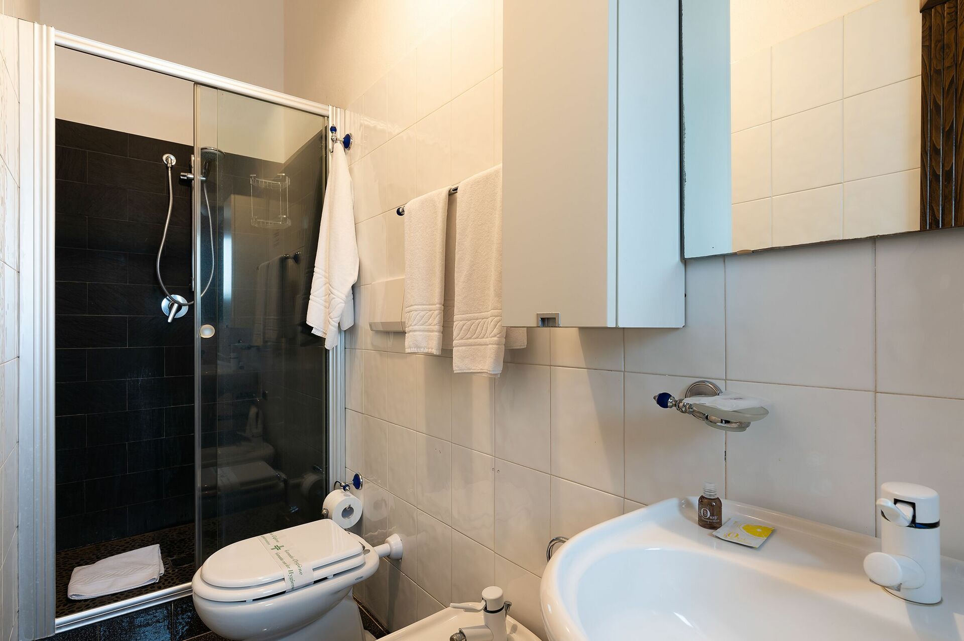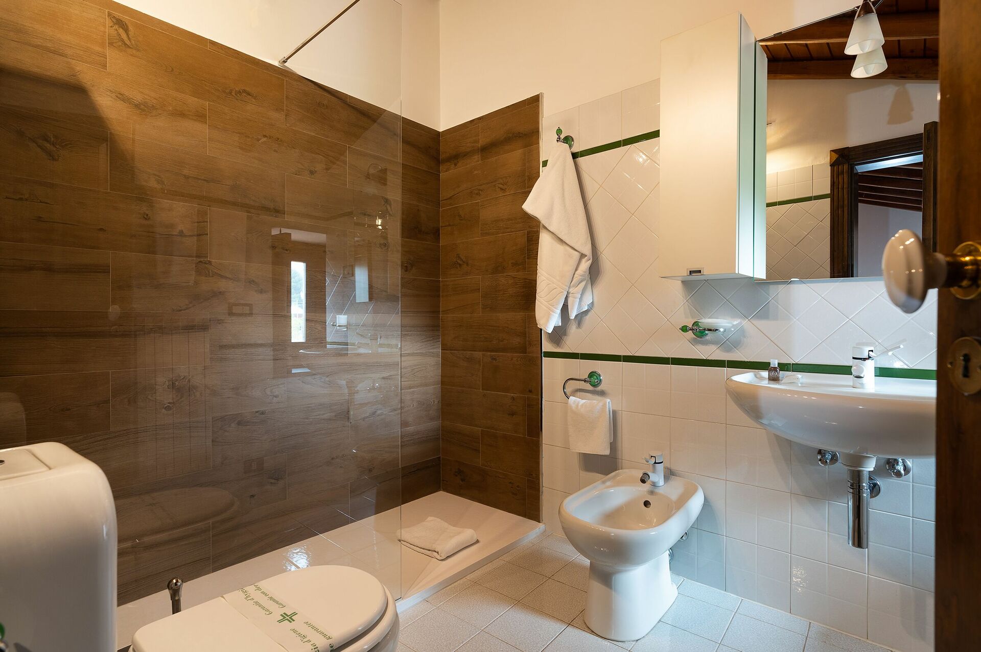 2 soveværelser med dobbeltsenge, hver med sit eget badeværelse med bruser.