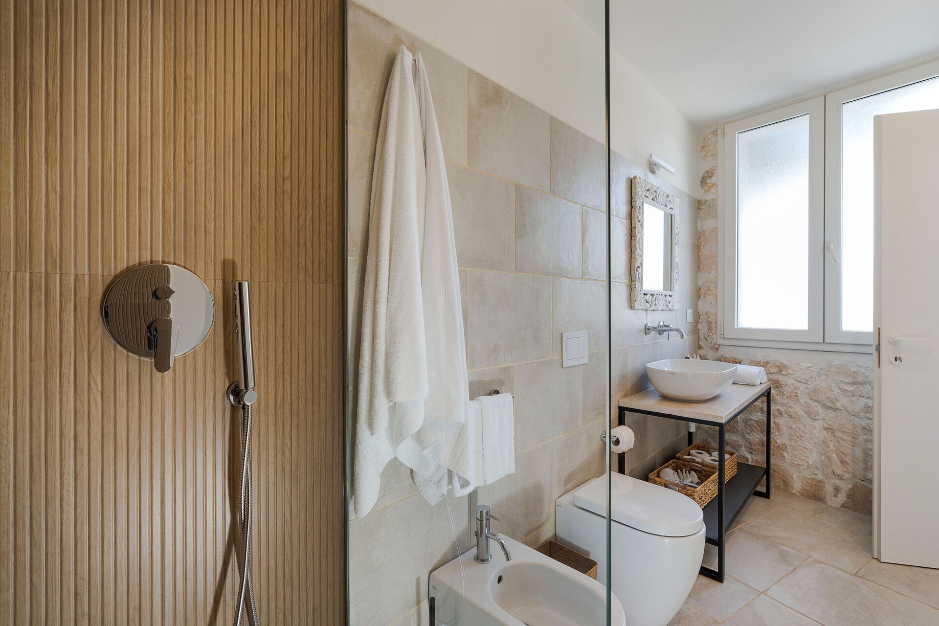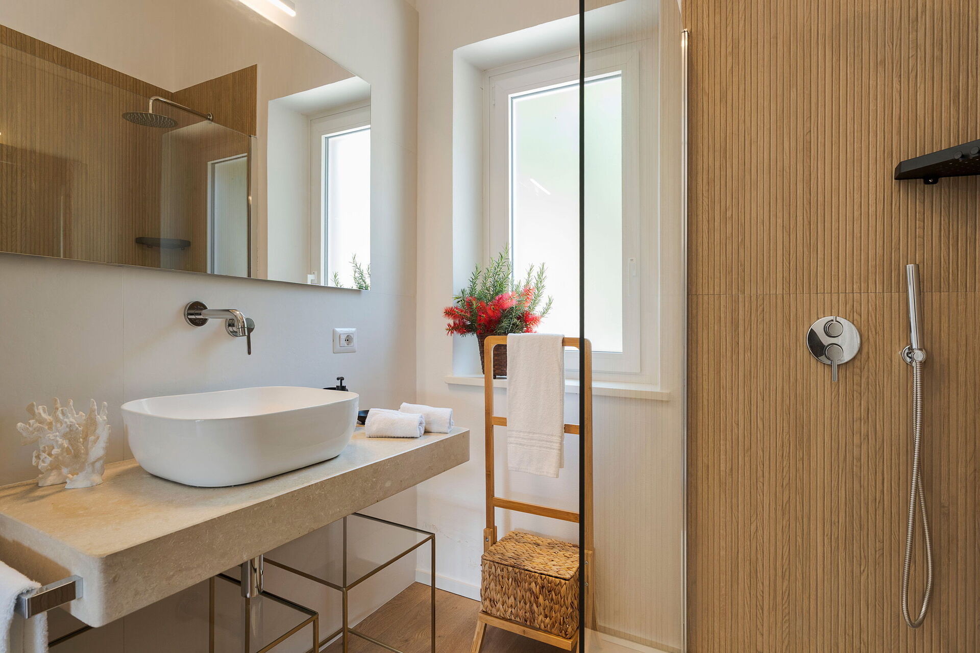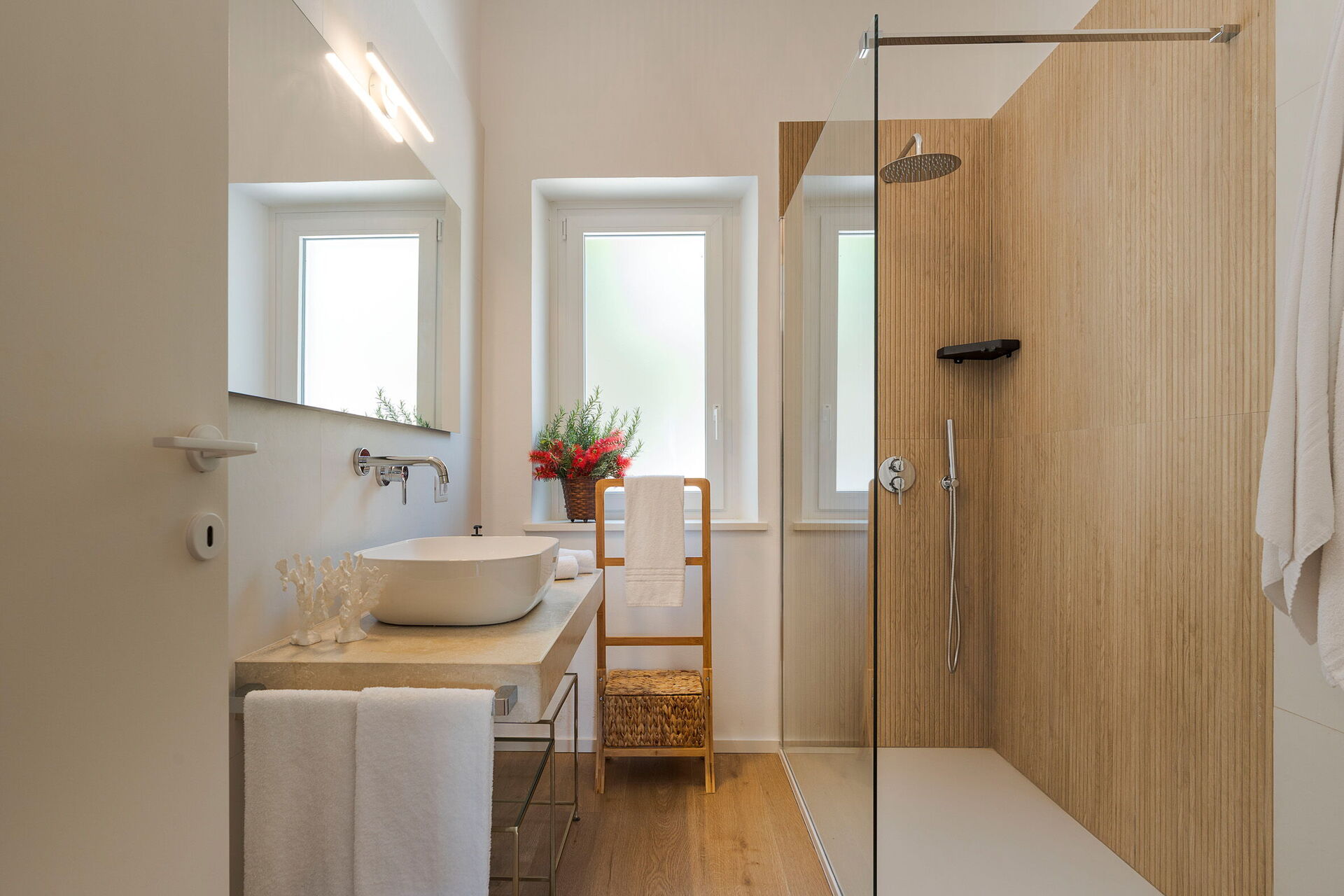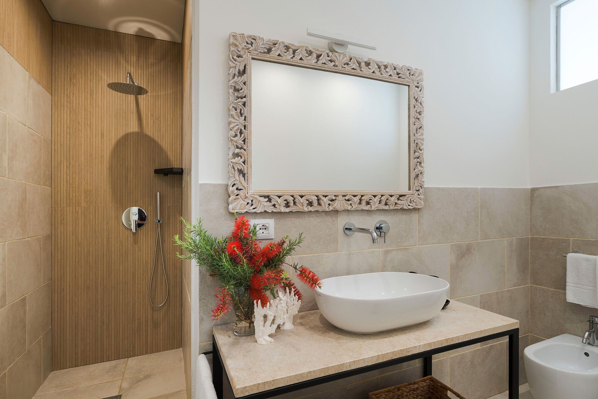 1 dobbeltværelse (aircondition) med badeværelse med bruser og udgang til verandaen, 1 dobbeltværelse (aircondition) med badeværelse med bruser