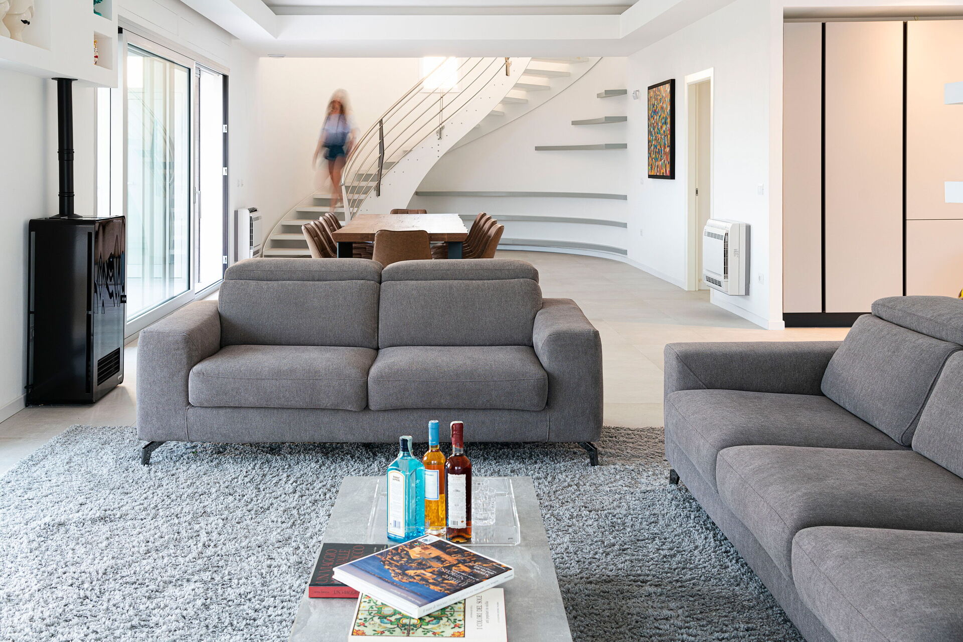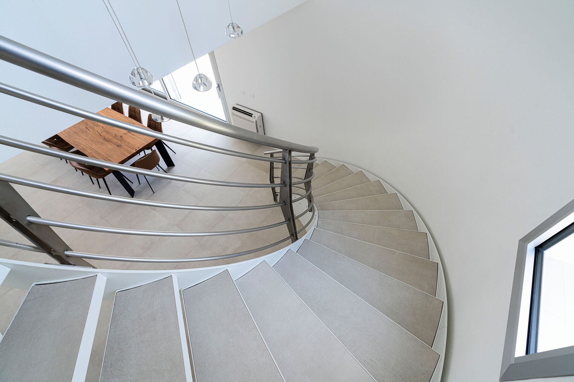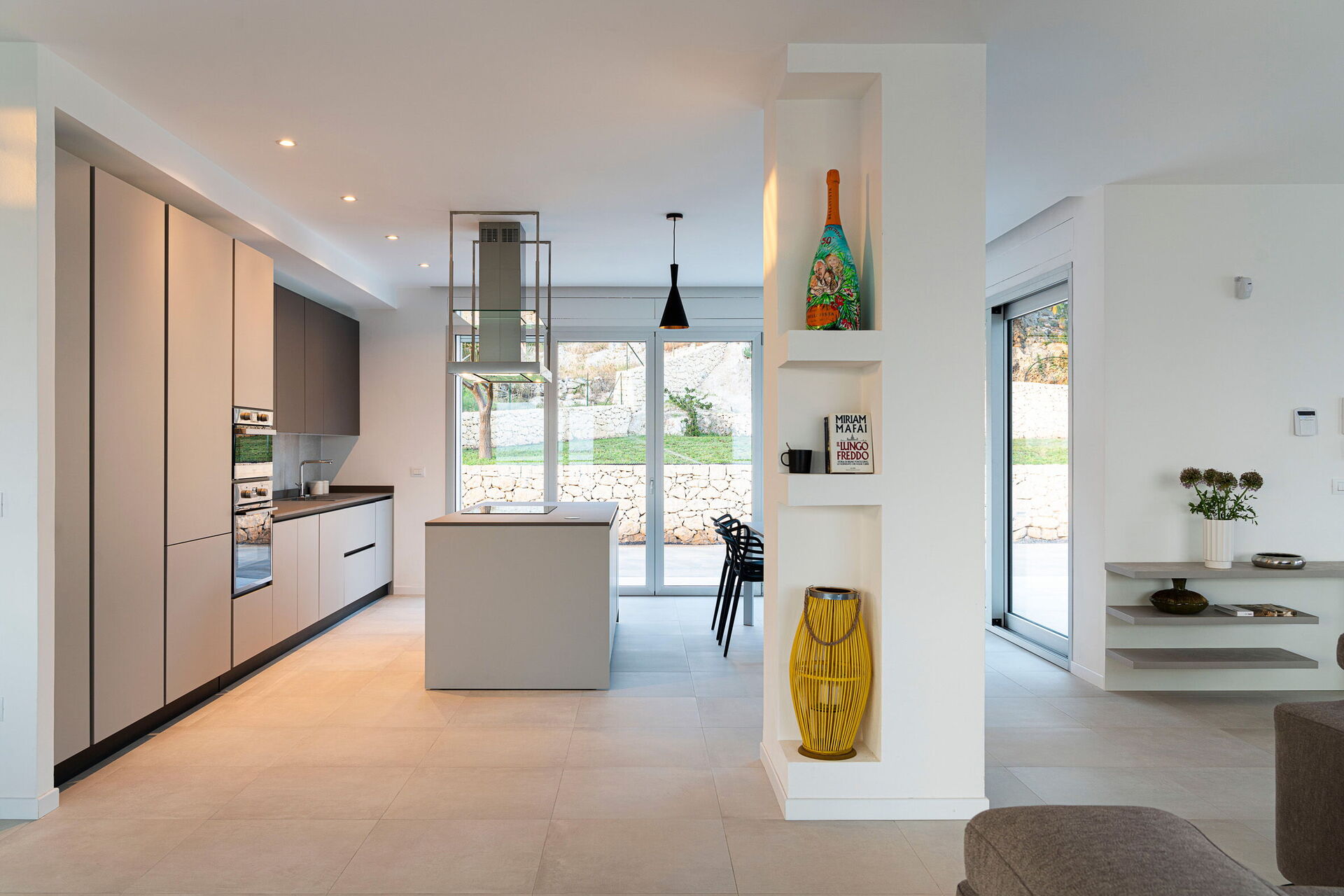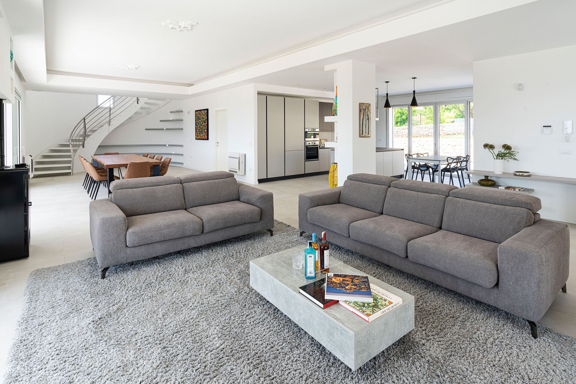 Ejendommen består af et hovedhus i tre etager og to annekser, med moderne møbler og i alt 6 soveværelser og 6 badeværelser. Store vinduespartier slipper meget lys ind og giver en dejlig panoramaudsigt.