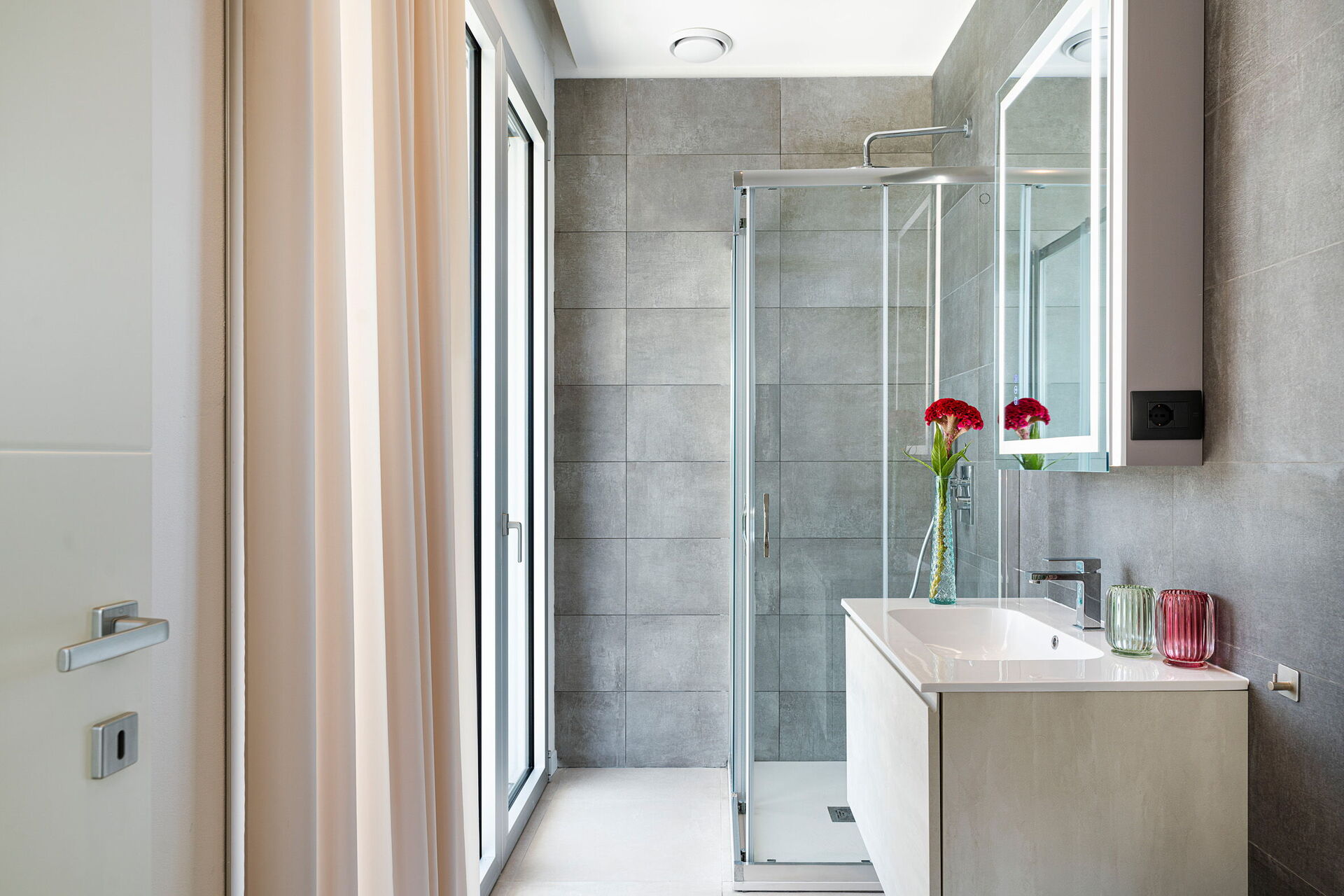 Stor stue (aircondition, TV), køkken (kogeplader, ovn, køleskab, fryser, opvaskemaskine, mikroovn, brødrister, espressomaskine, kaffemaskine) med spiseplads, badeværelse med bruser, vaskerum