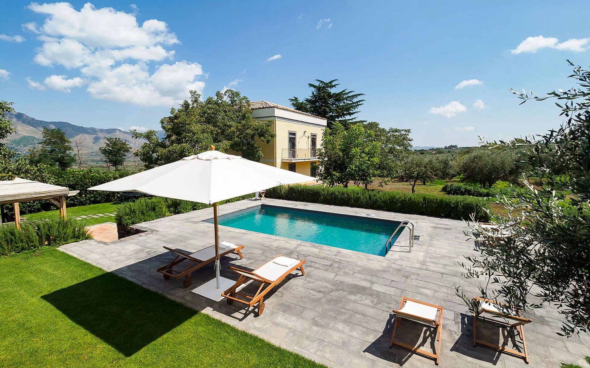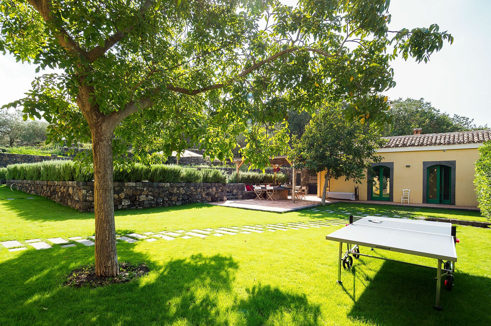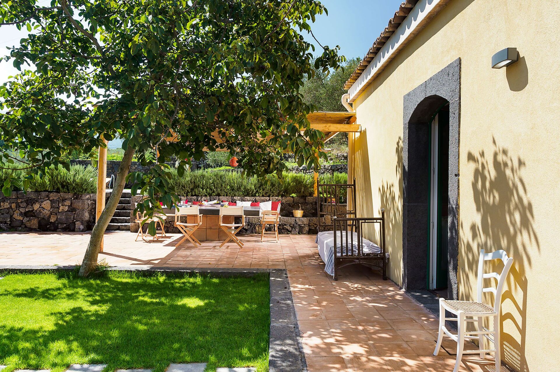 Feriehuset ligger på de maleriske bakker omkring Etna, og er omgivet af en frodig velholdt have indrammet af karakteristiske stengærder. Der er også store terrasser og en lille opvarmet pool med solterrasse til at kunne slappe af eller køle af på varme sommerdage.