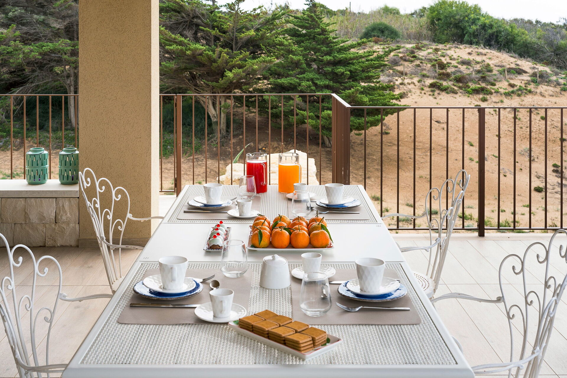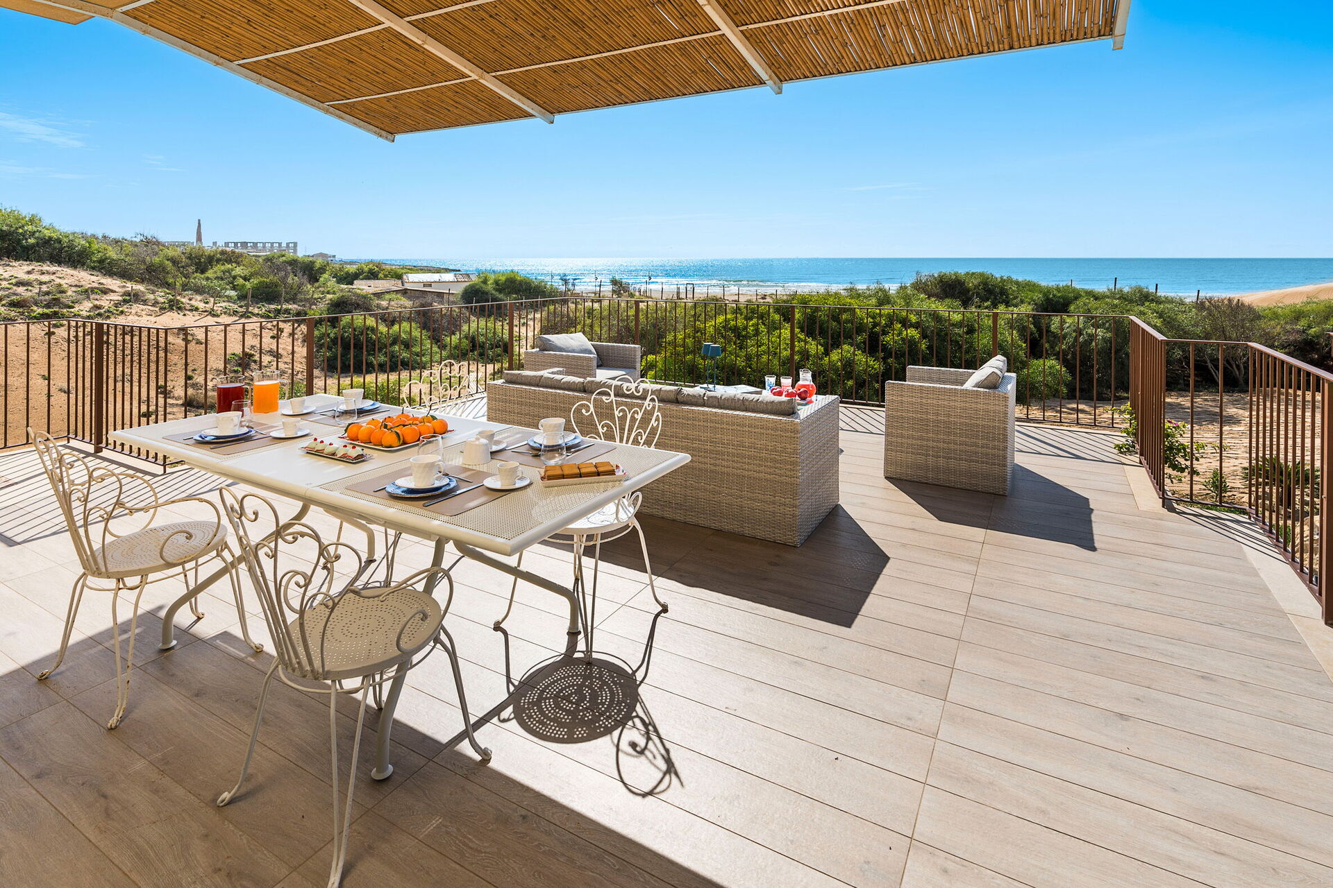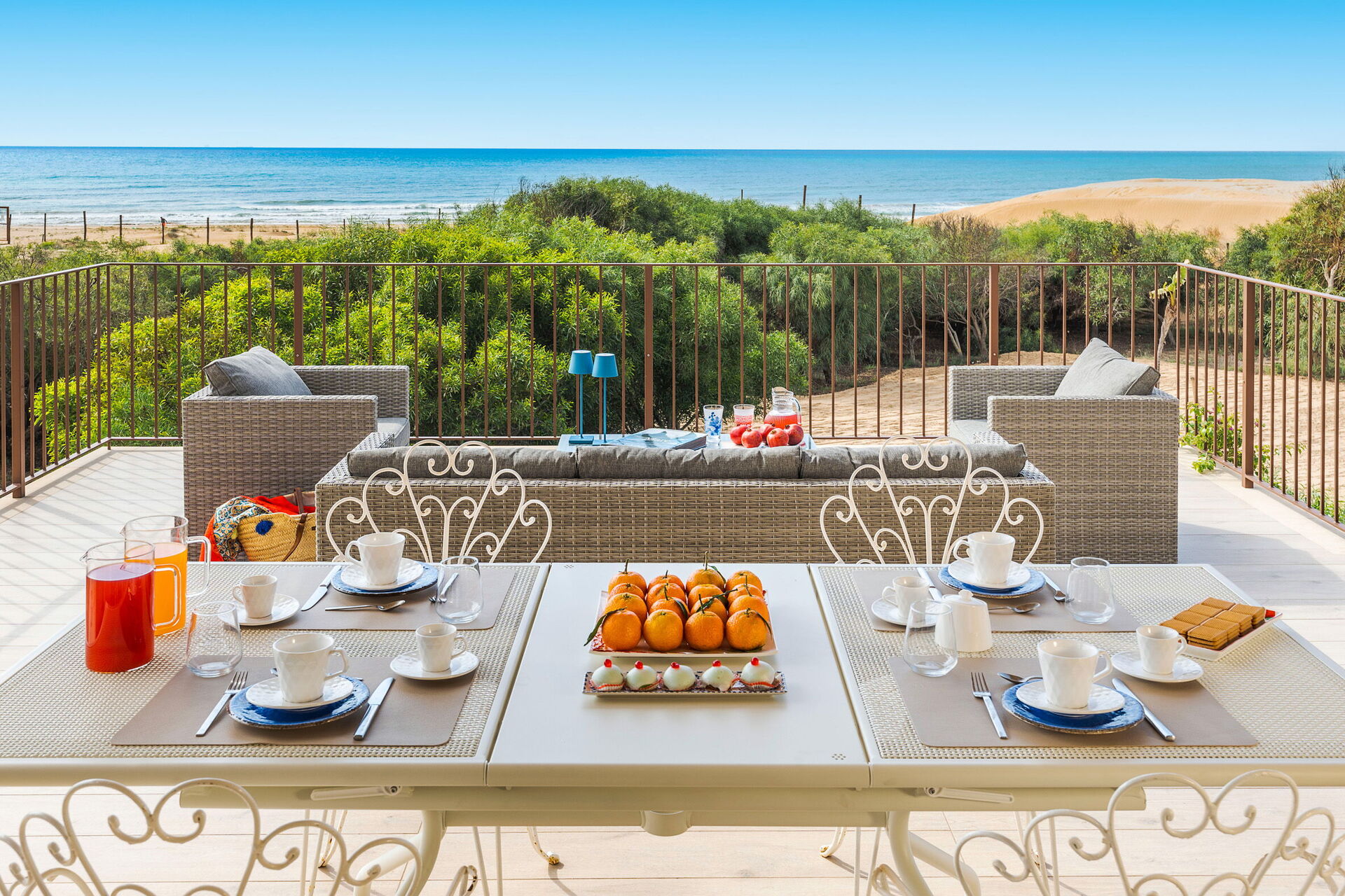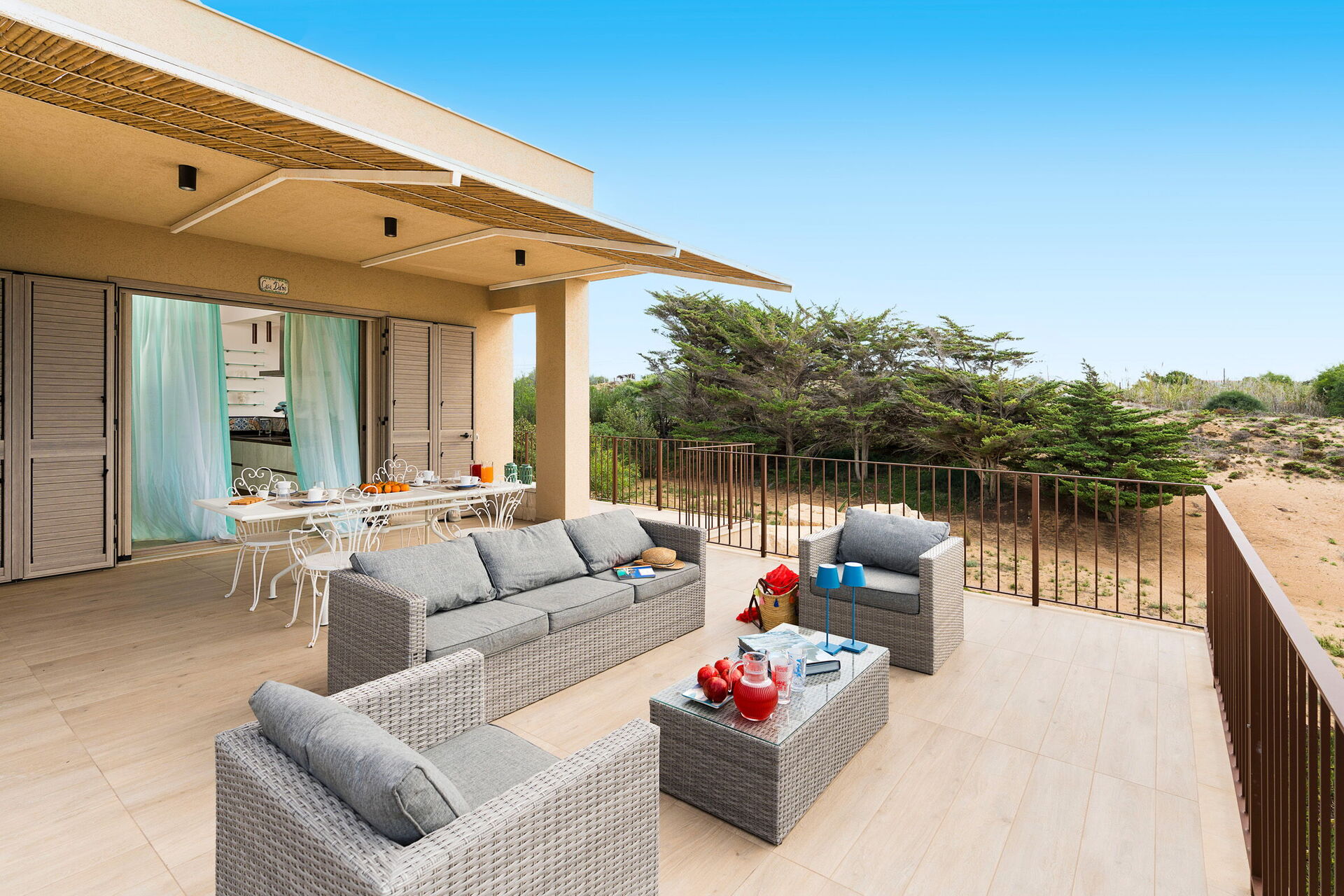 Den store terrasse med udsigt over havet er indrettet til at kunne spise udenfor; her kan du slappe af og nyde en fantastisk panoramaudsigt over landsbyen Sampieri og havet.