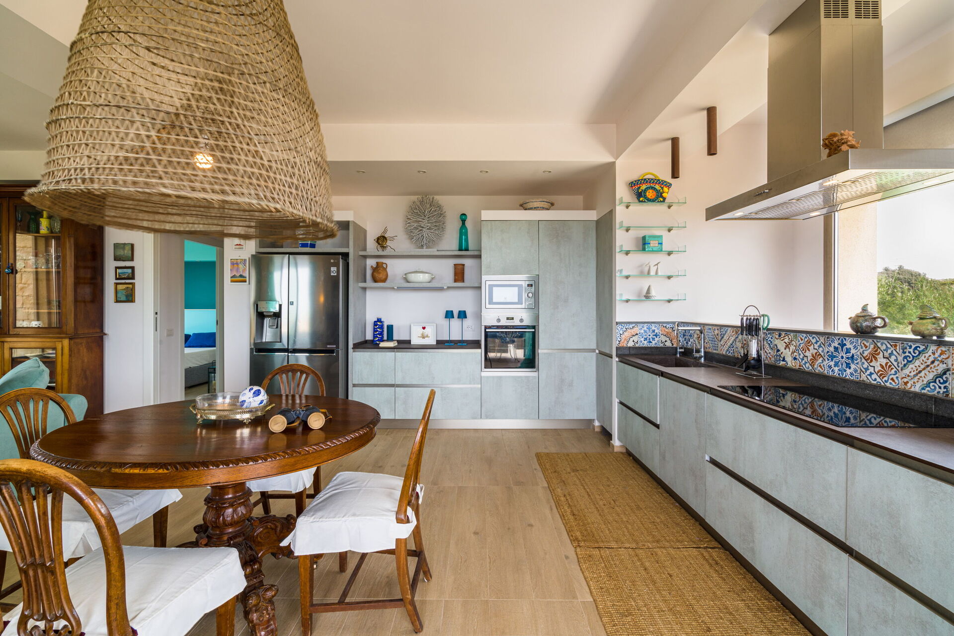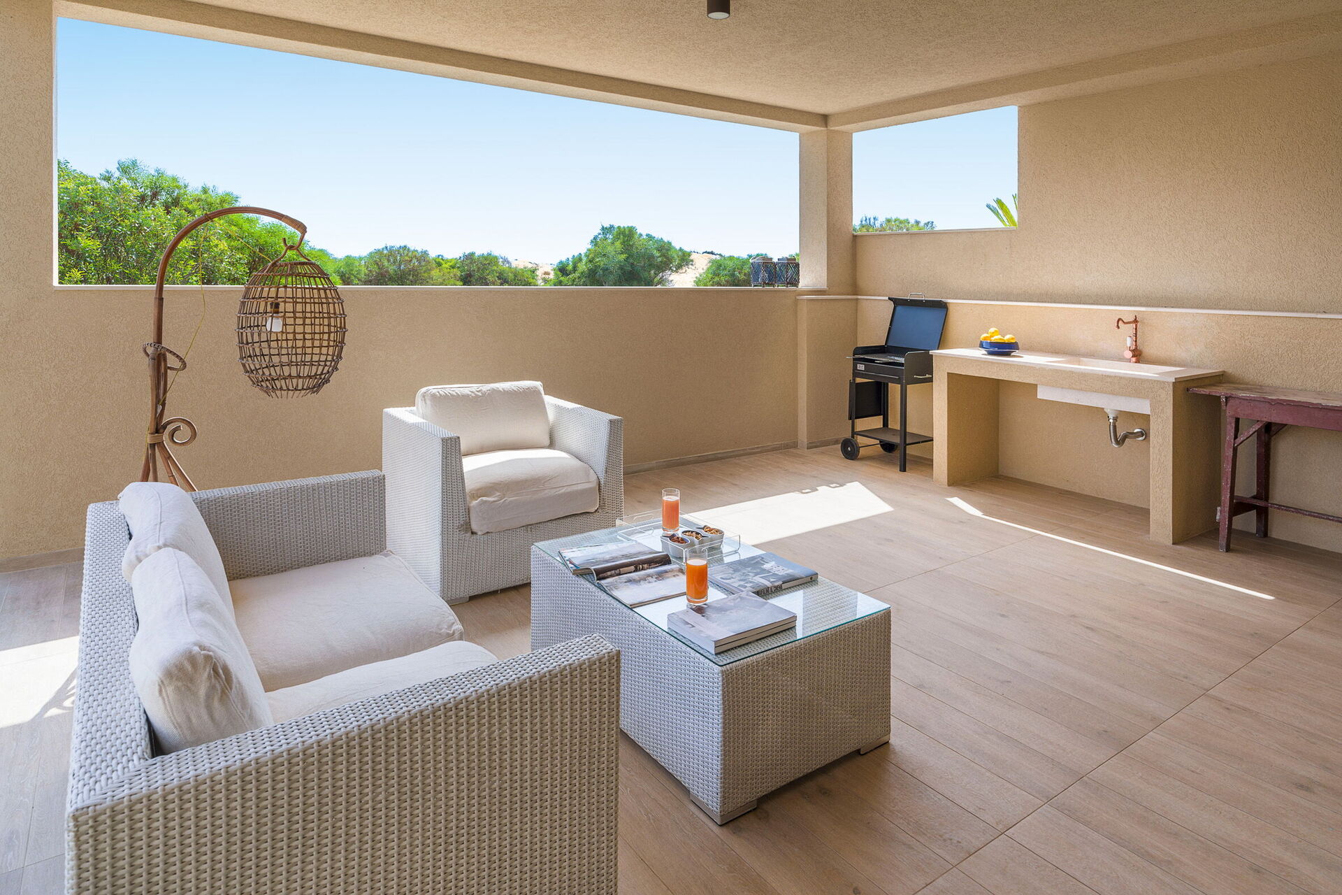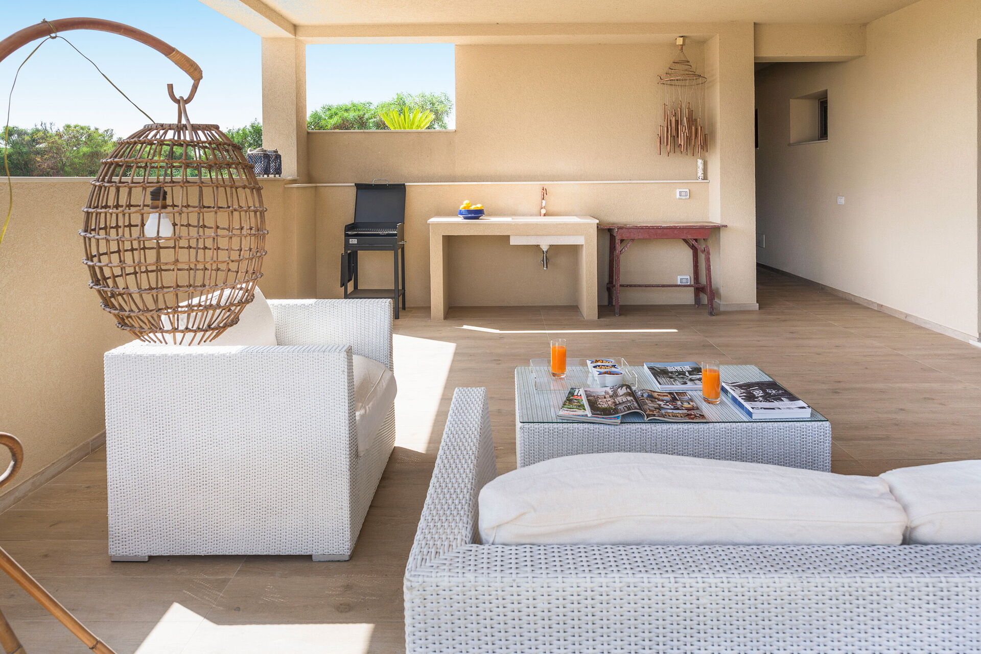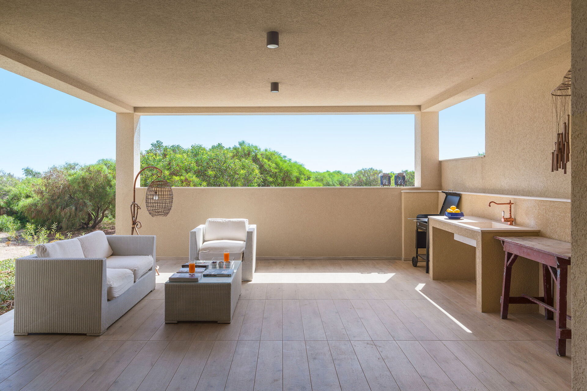 Den store terrasse med udsigt over havet er indrettet til at kunne spise udenfor; her kan du slappe af og nyde en fantastisk panoramaudsigt over landsbyen Sampieri og havet.