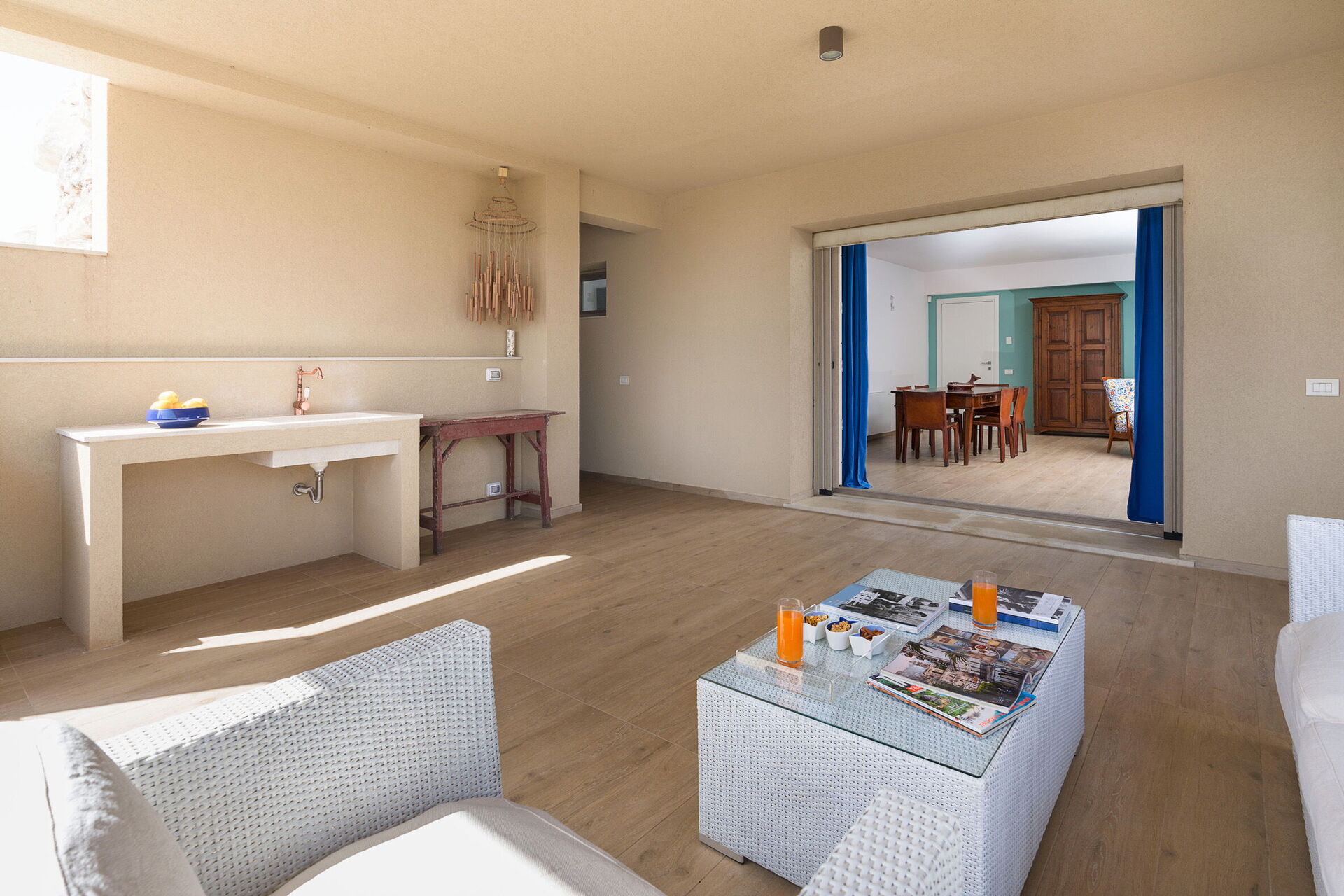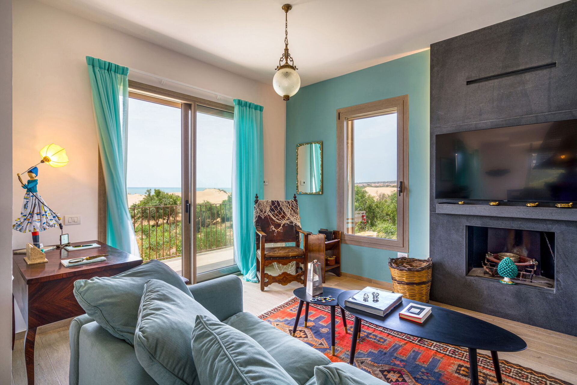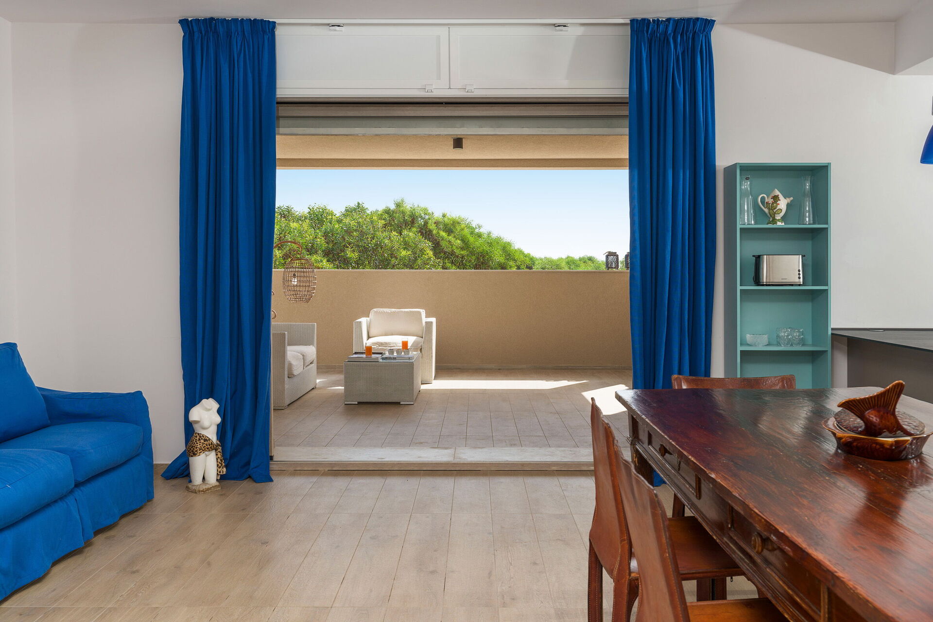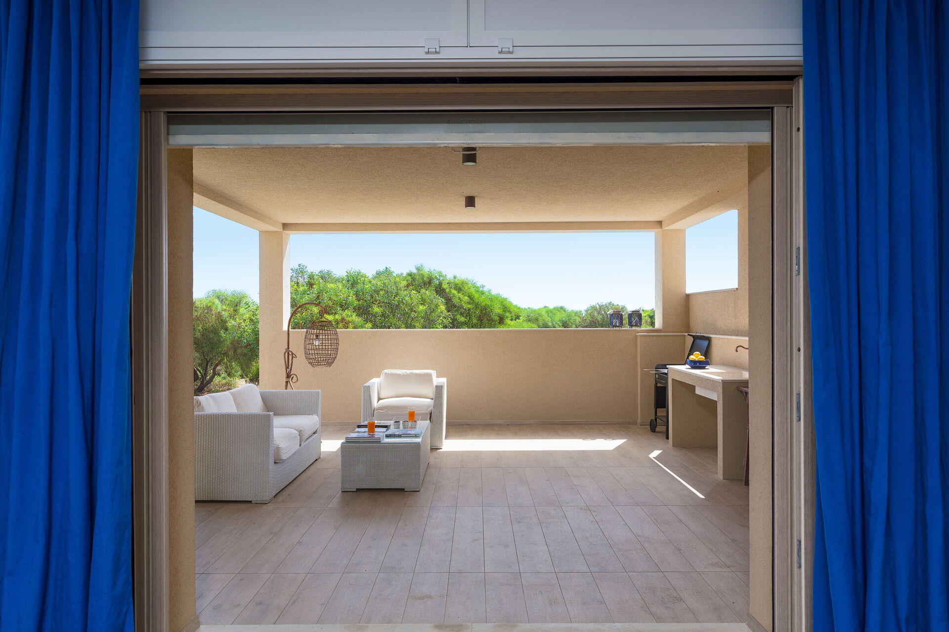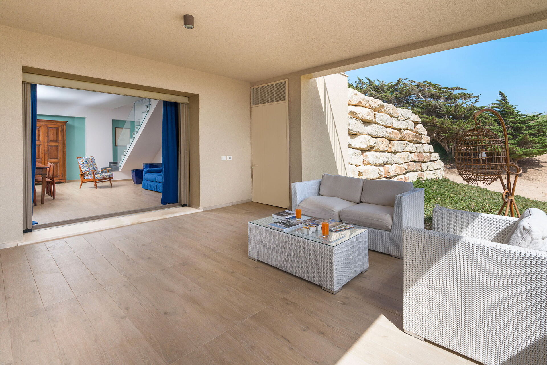 Den store terrasse med udsigt over havet er indrettet til at kunne spise udenfor; her kan du slappe af og nyde en fantastisk panoramaudsigt over landsbyen Sampieri og havet.