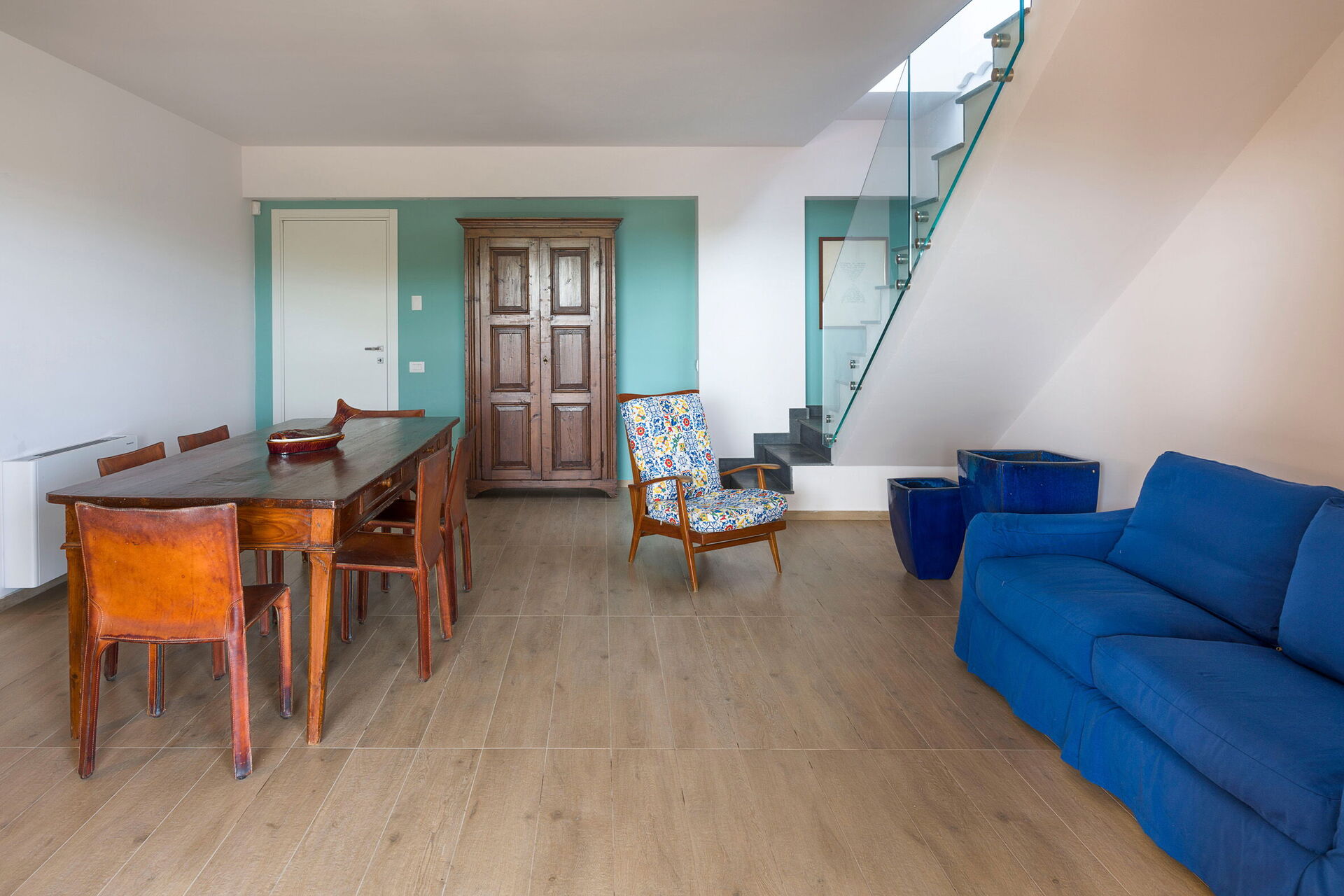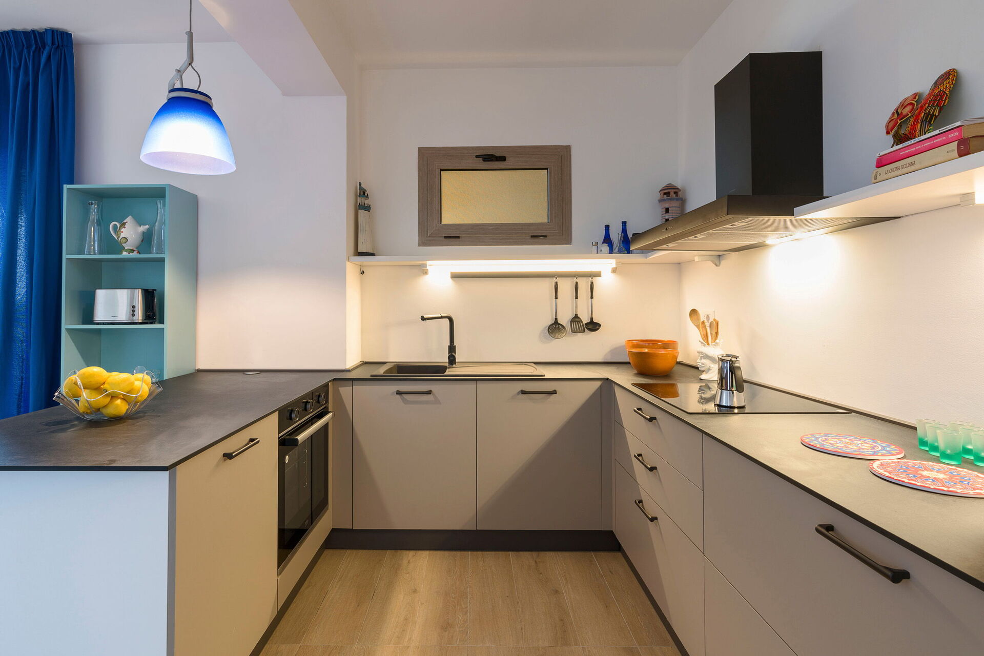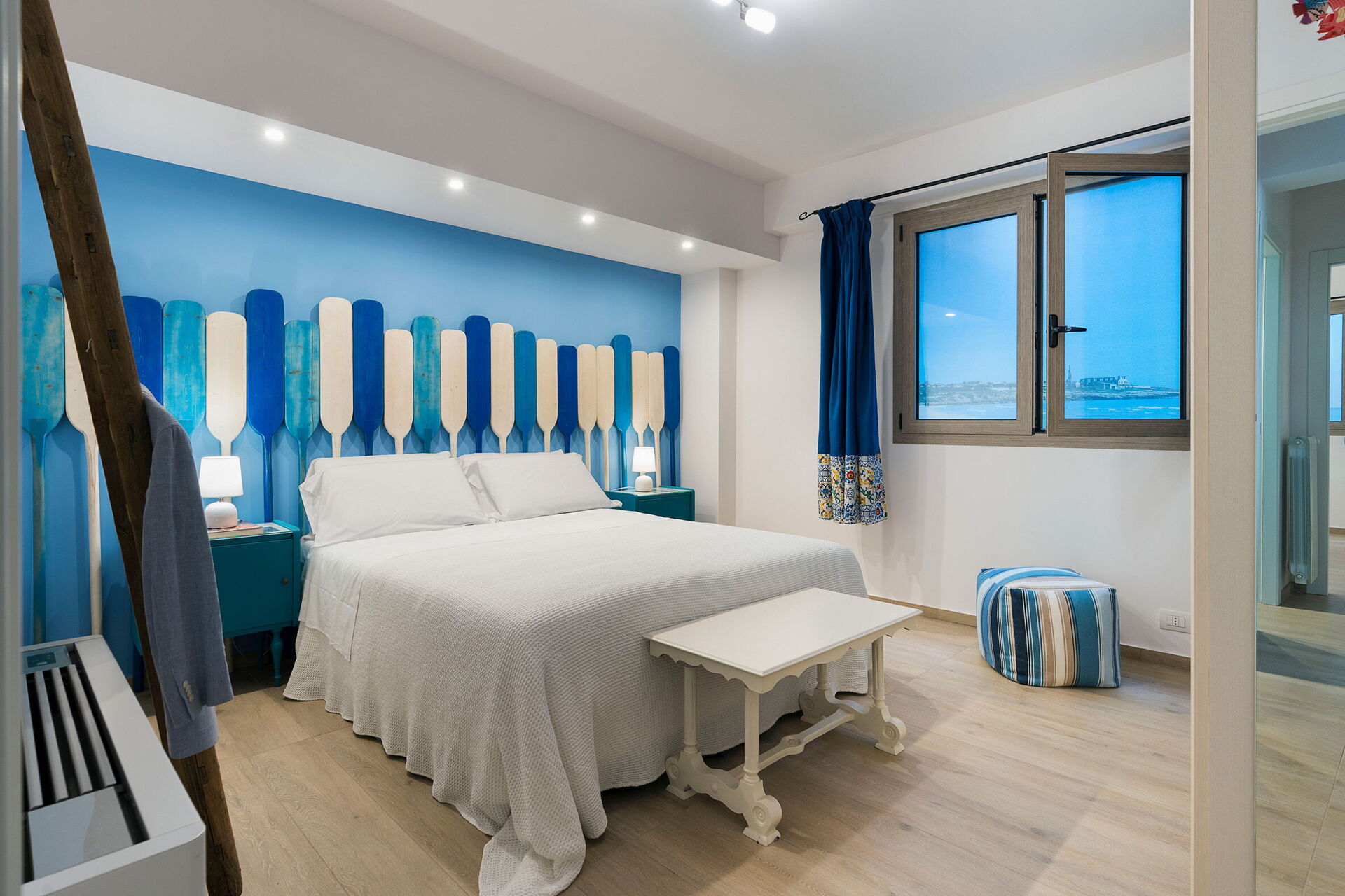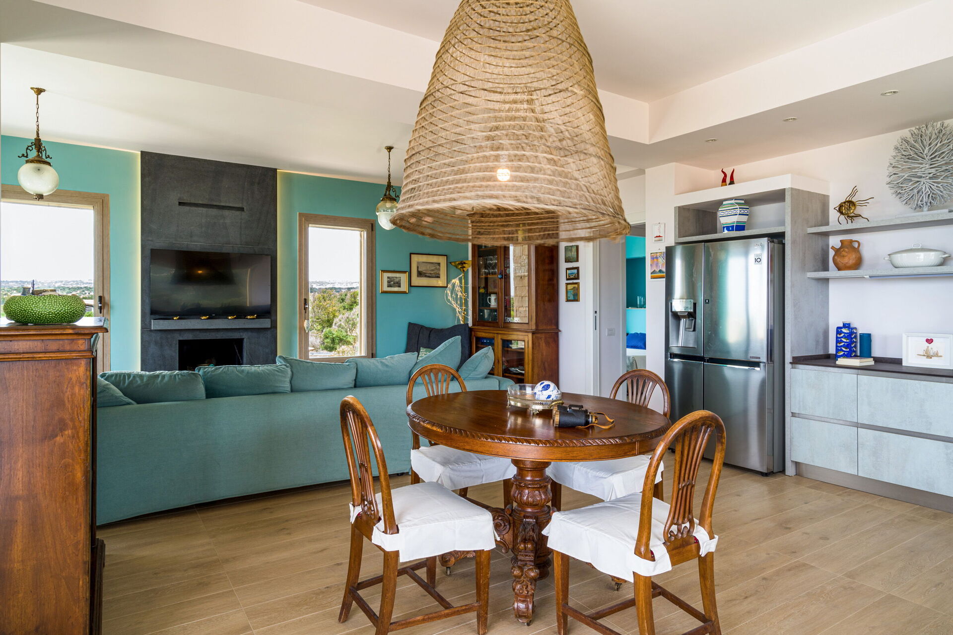 Den store terrasse med udsigt over havet er indrettet til at kunne spise udenfor; her kan du slappe af og nyde en fantastisk panoramaudsigt over landsbyen Sampieri og havet.