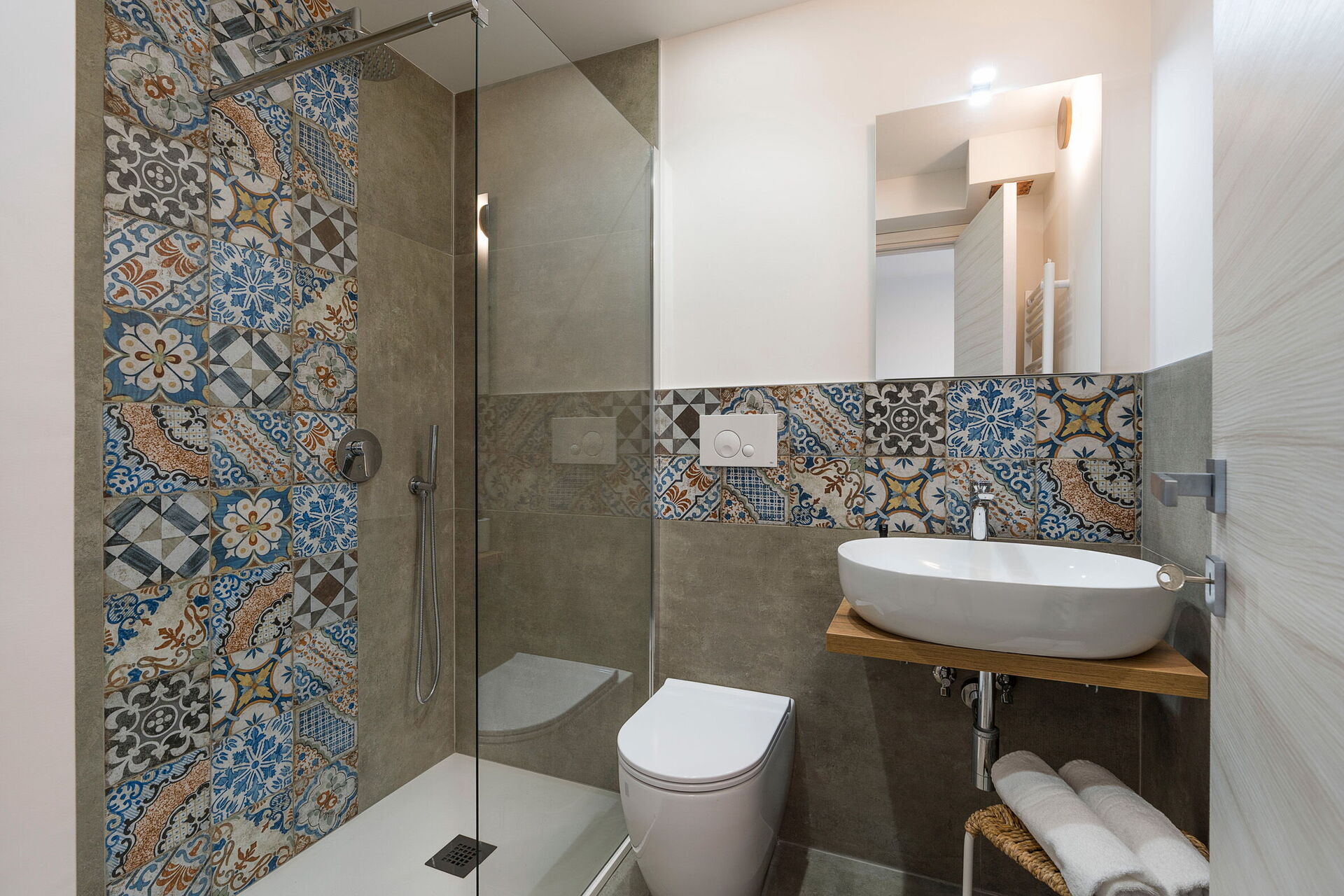 Første sal: køkken (kogeplade, fryser, køleskab, air fryer, espressomaskine) med spiseplads og adgang til terrasse, dobbeltværelse (160 x 200 cm) med privat badeværelse med bruser, dobbeltværelse (160/80 x 200 cm; kan opdeles i 2 enkeltsenge efter anmodning), badeværelse med bruser.