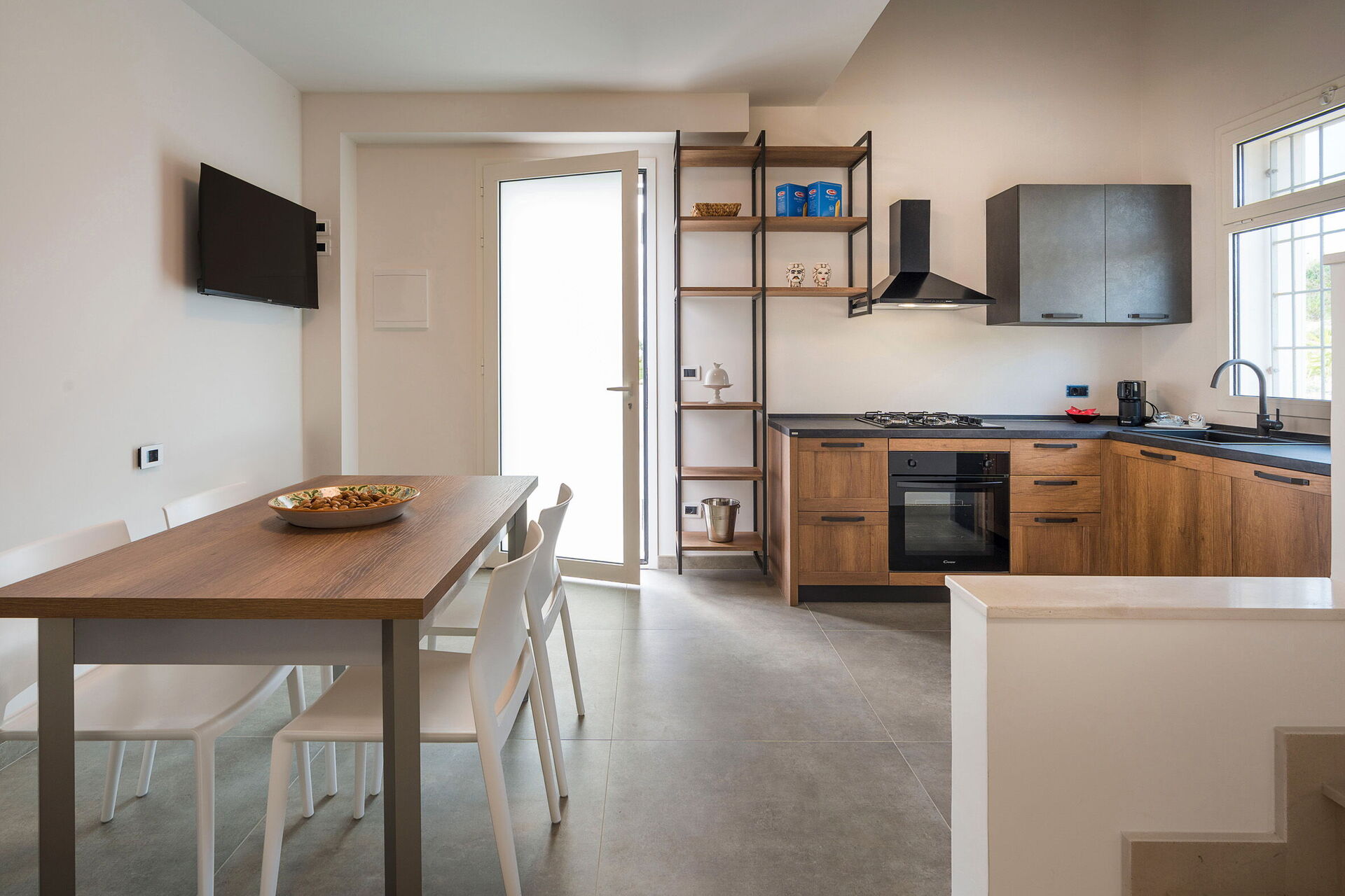 Stueetage: køkken (kogeplade, fryser, køleskab, espressomaskine) med spiseplads og adgang til veranda, dobbeltværelse (160 x 200 cm) med privat badeværelse med bruser, dobbeltværelse (160/80 x 200 cm; kan opdeles i 2 enkeltsenge efter anmodning), badeværelse med bruser.