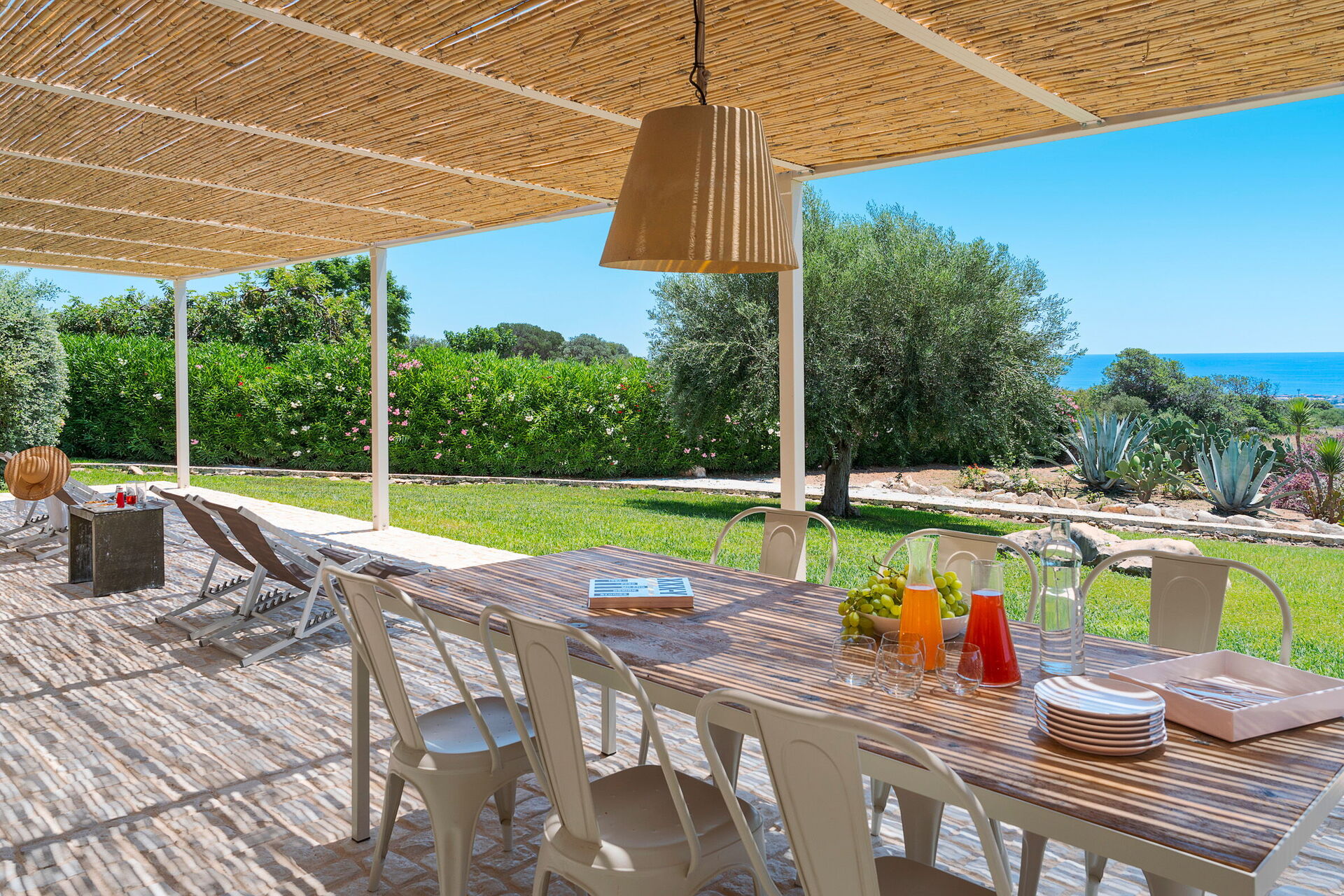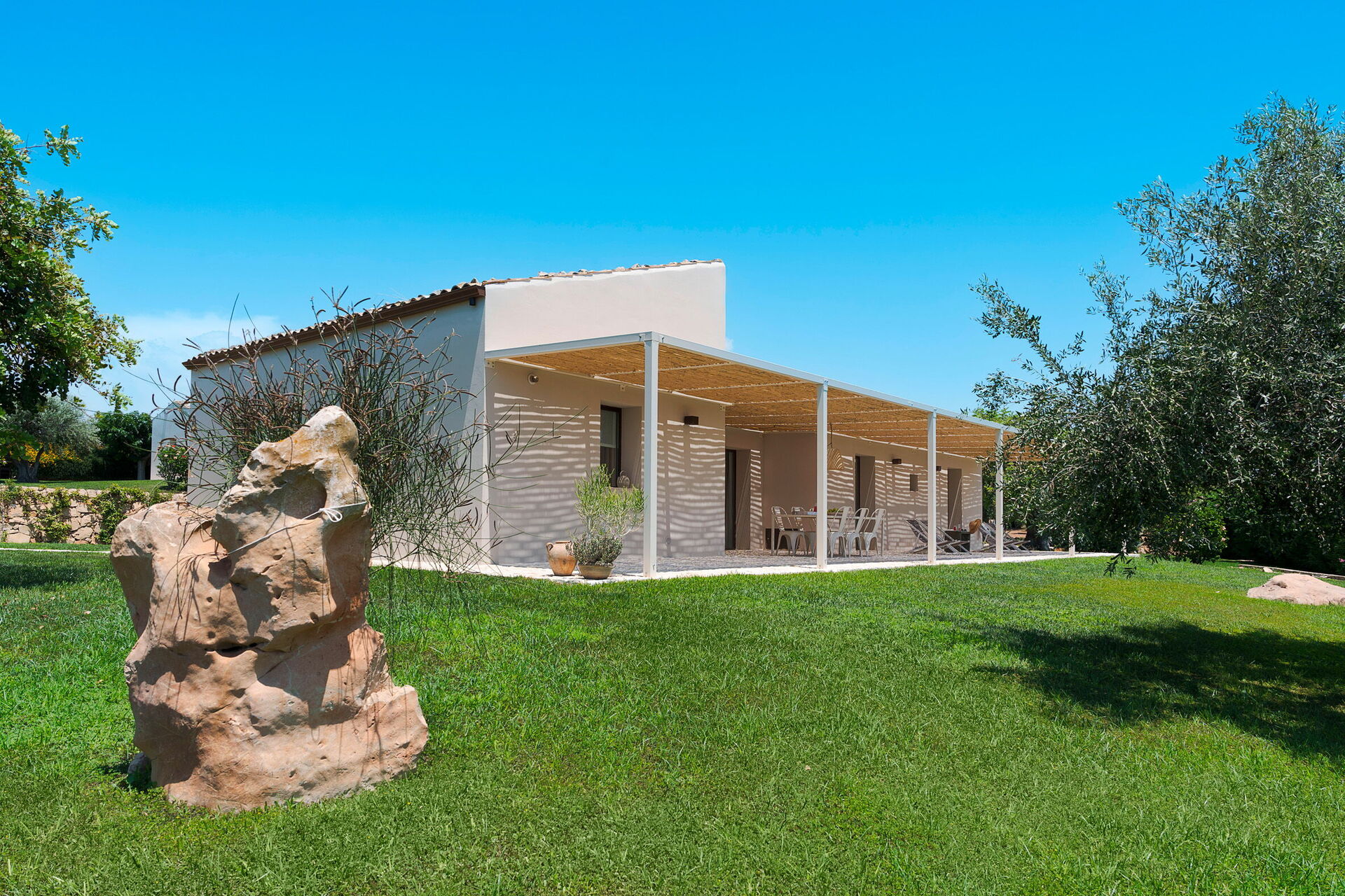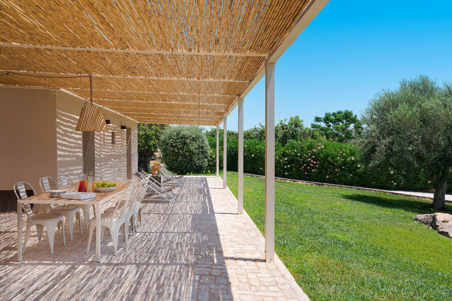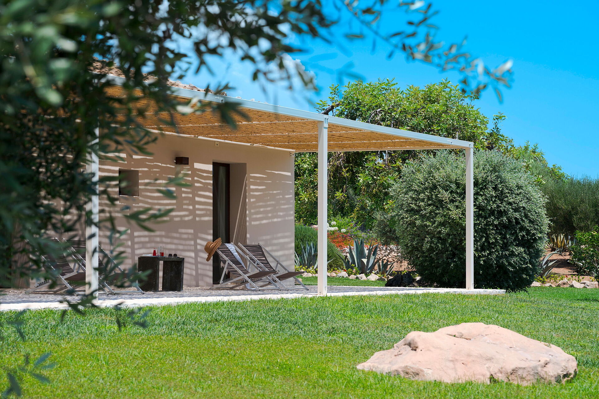 Terrasse med pergola, have, fælles pool