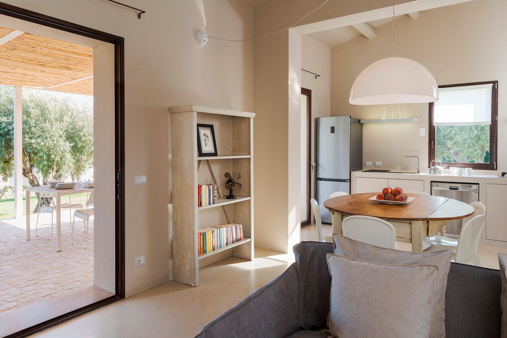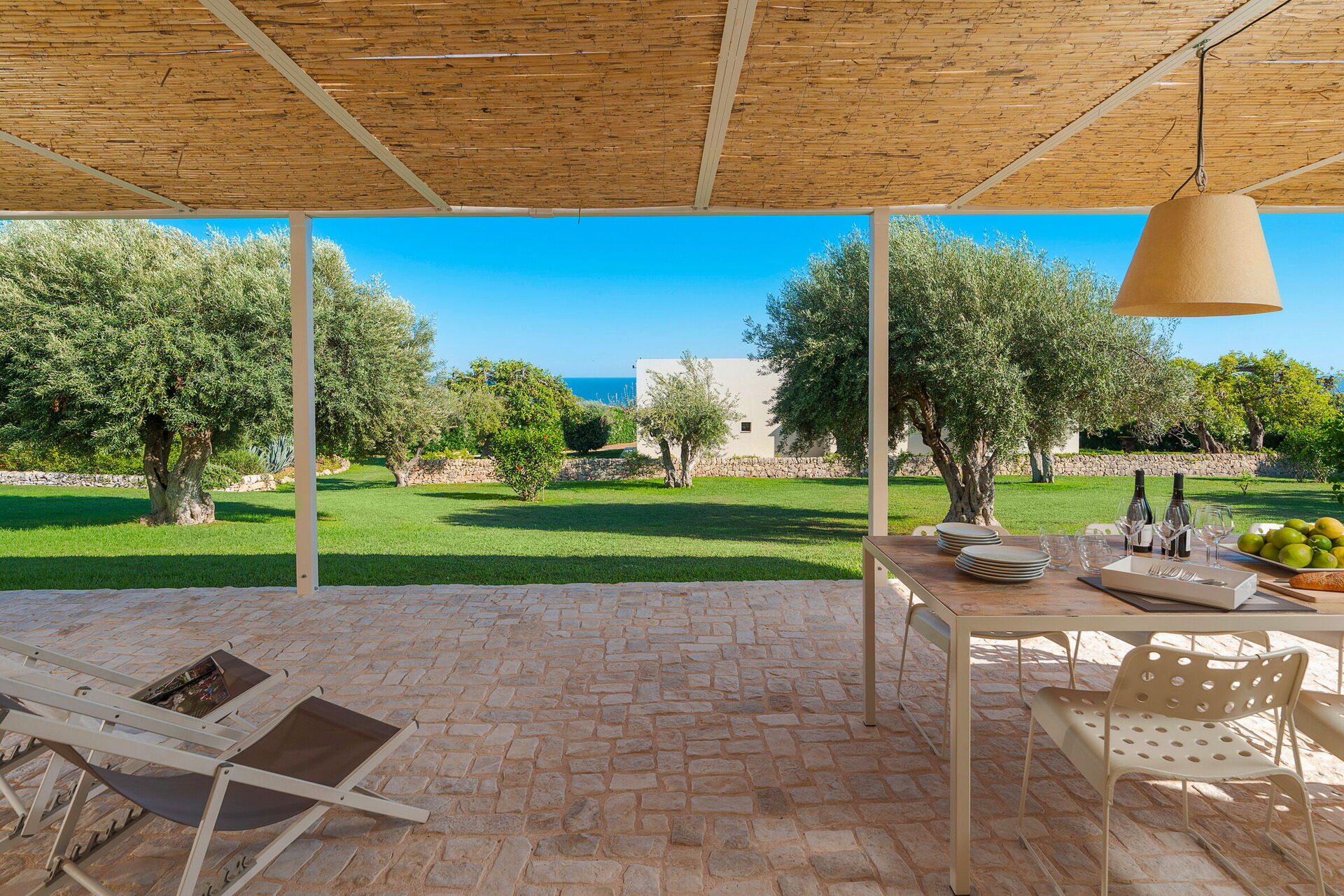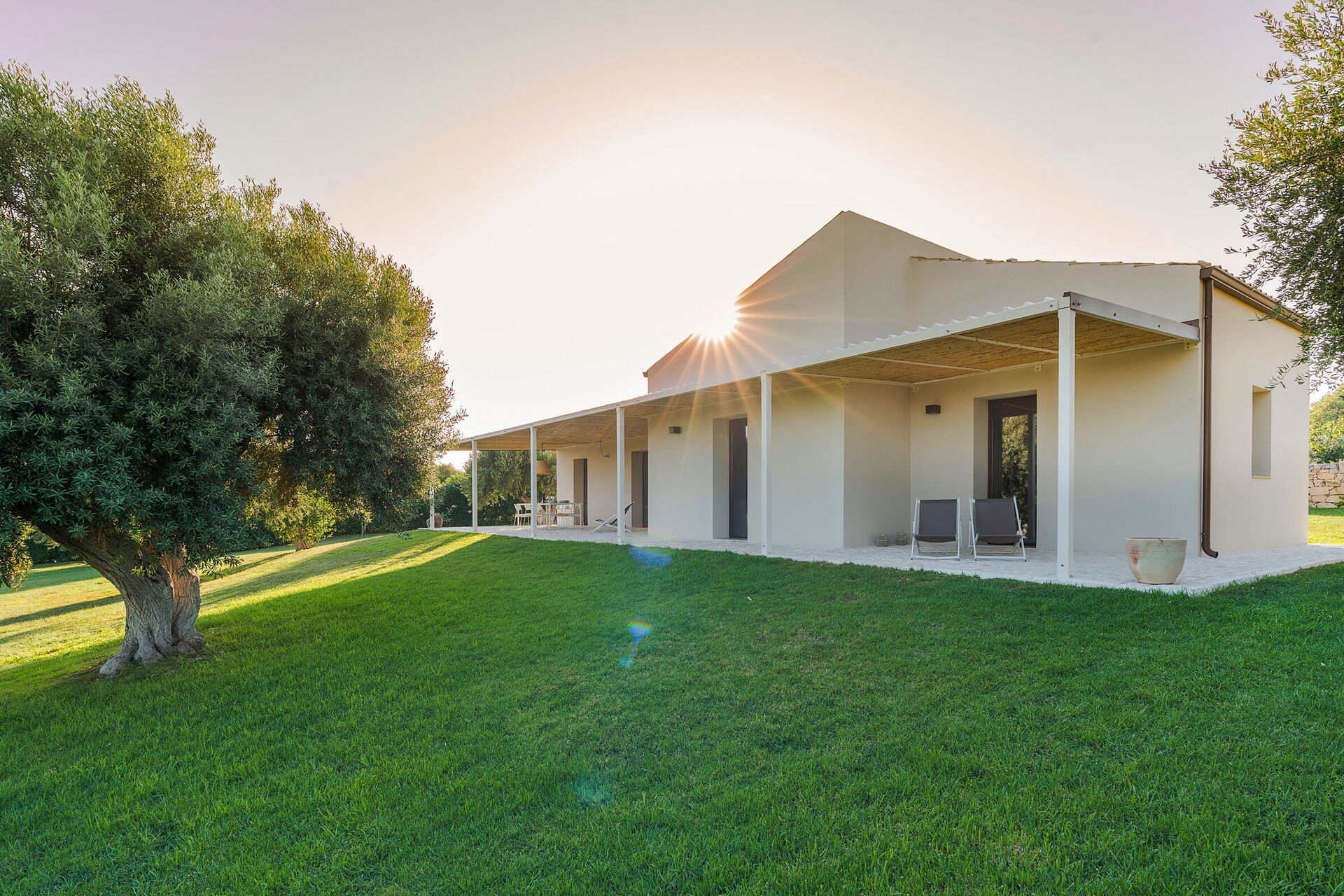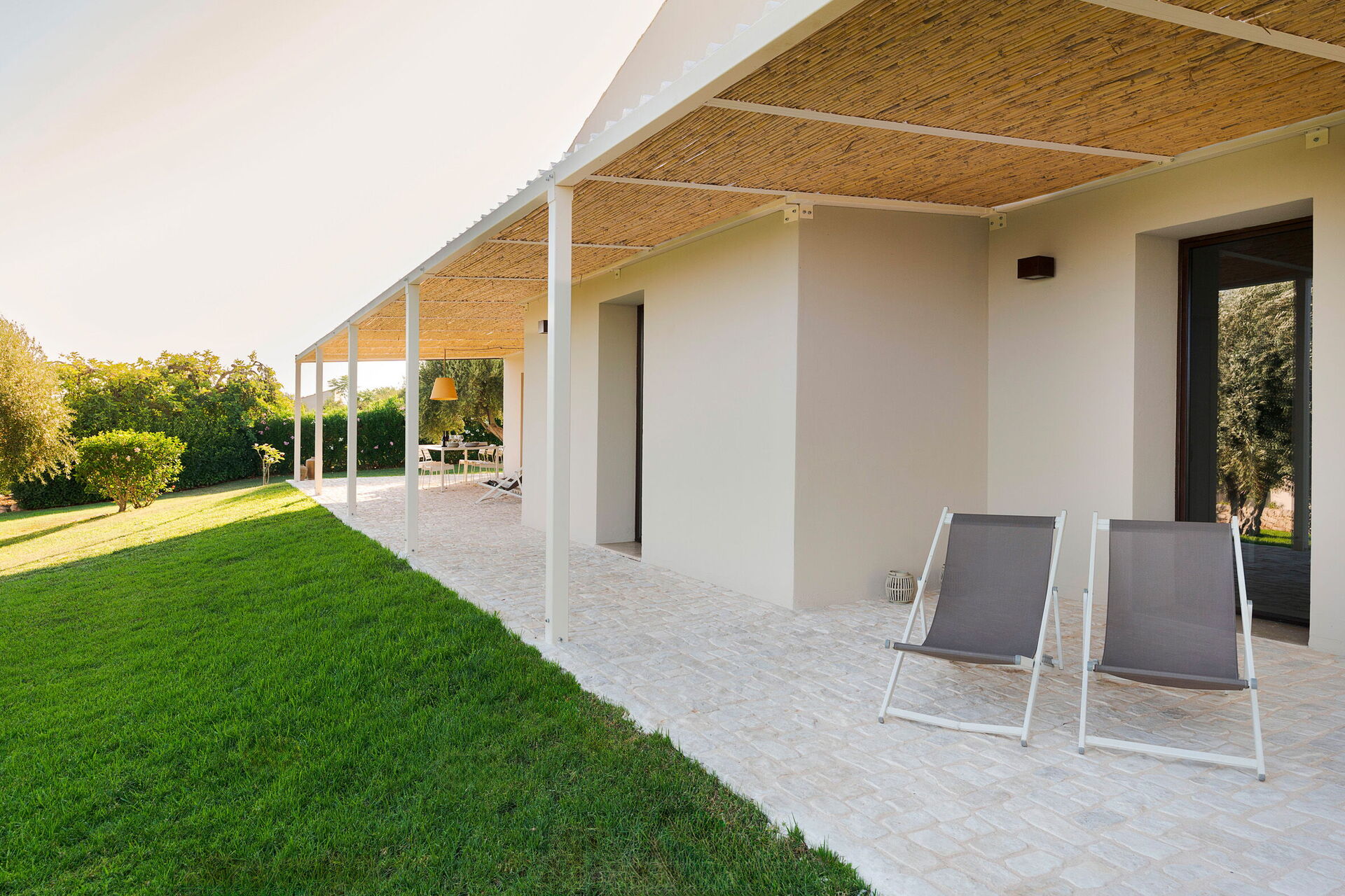 Terrasse med pergola, have, fælles pool