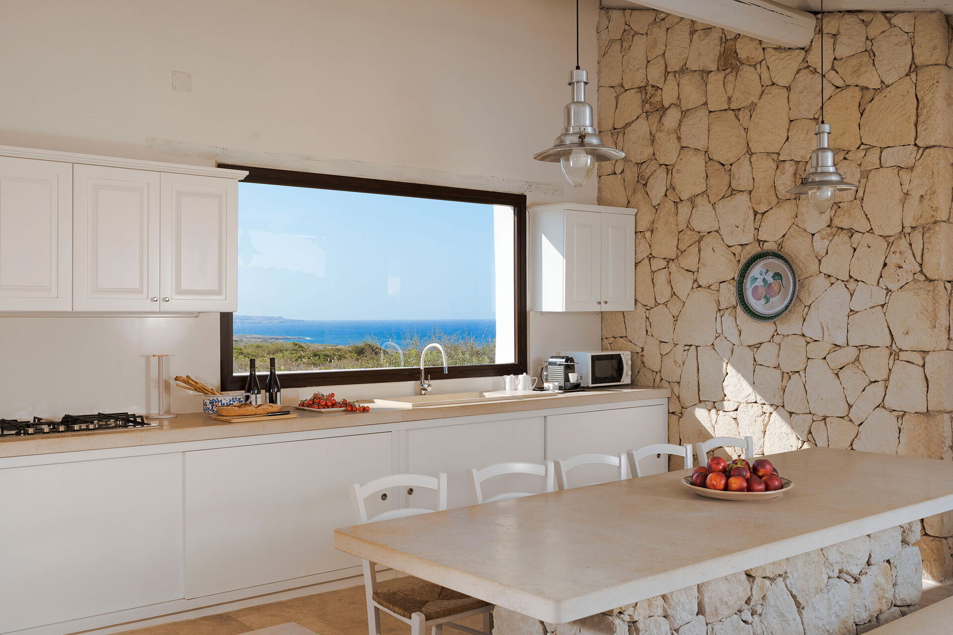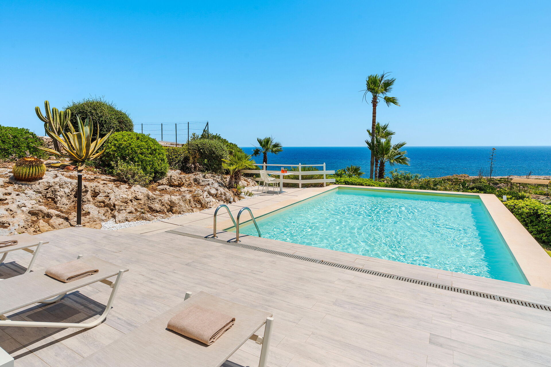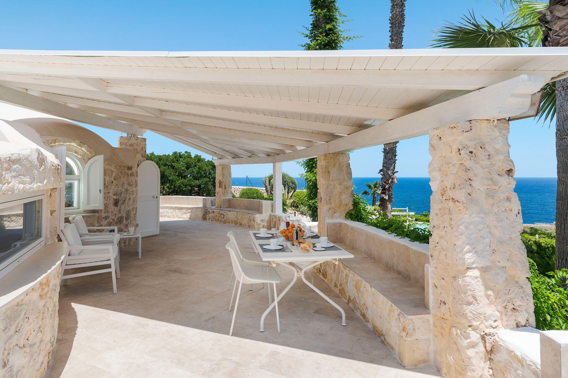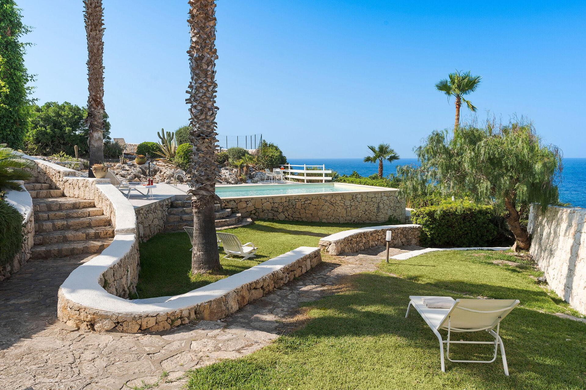 Ejendommen ligger kun få skridt fra havet og klipperne nedenfor. Huset er omgivet af en velplejet have med græsplæne, rummelige terrasser, og på ydersiden er der også en veranda udstyret med et udendørs køkken og spiseplads (tekøkken, ovn, køleskab og grill).