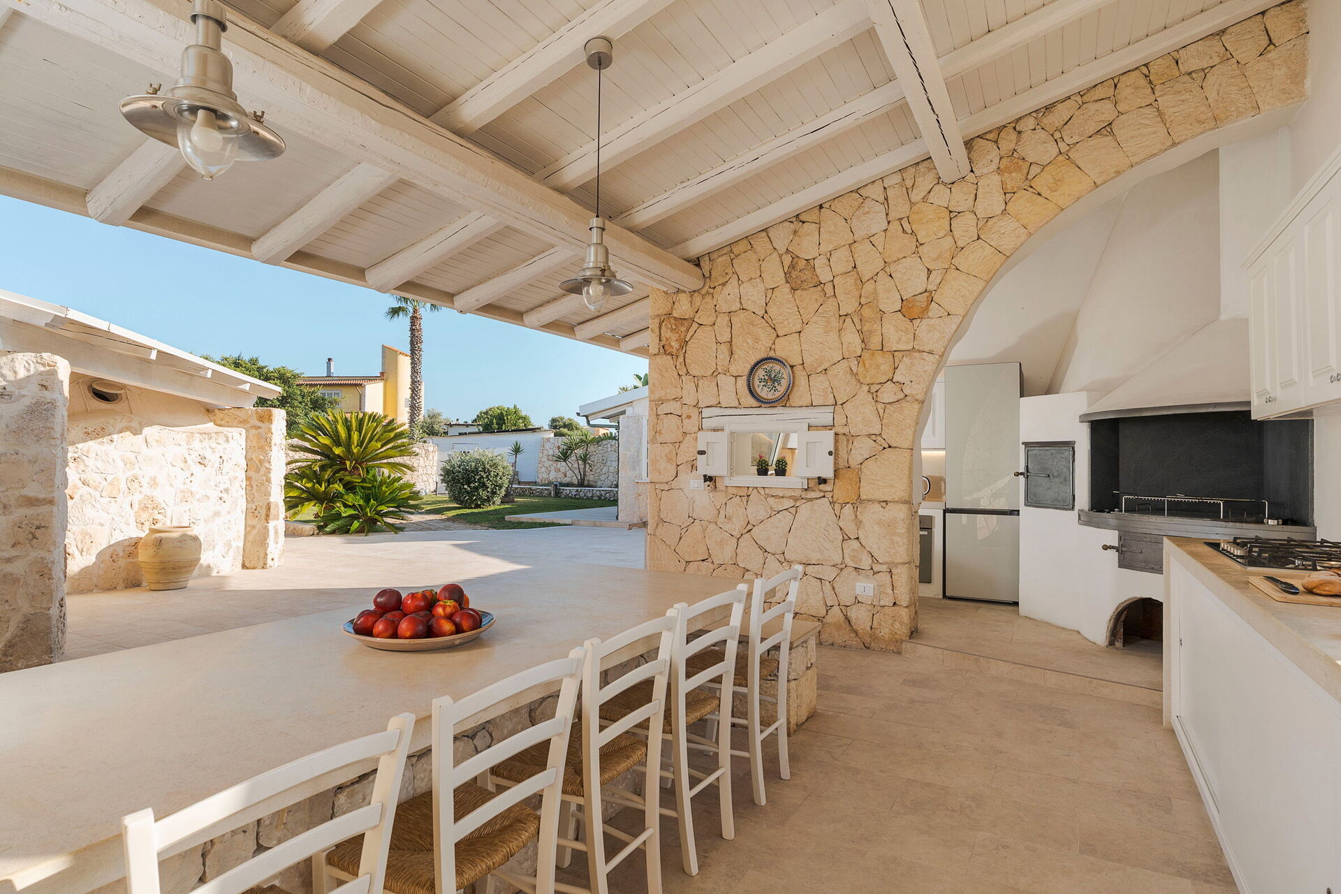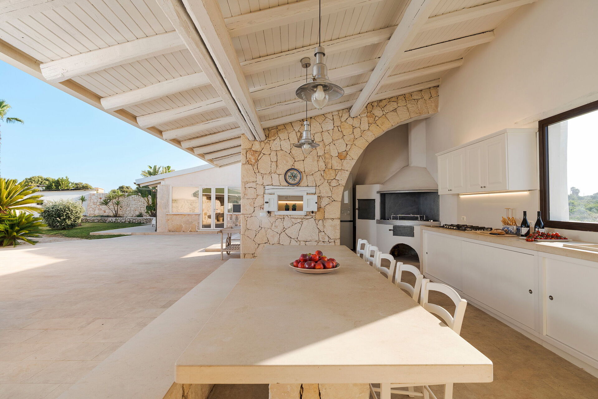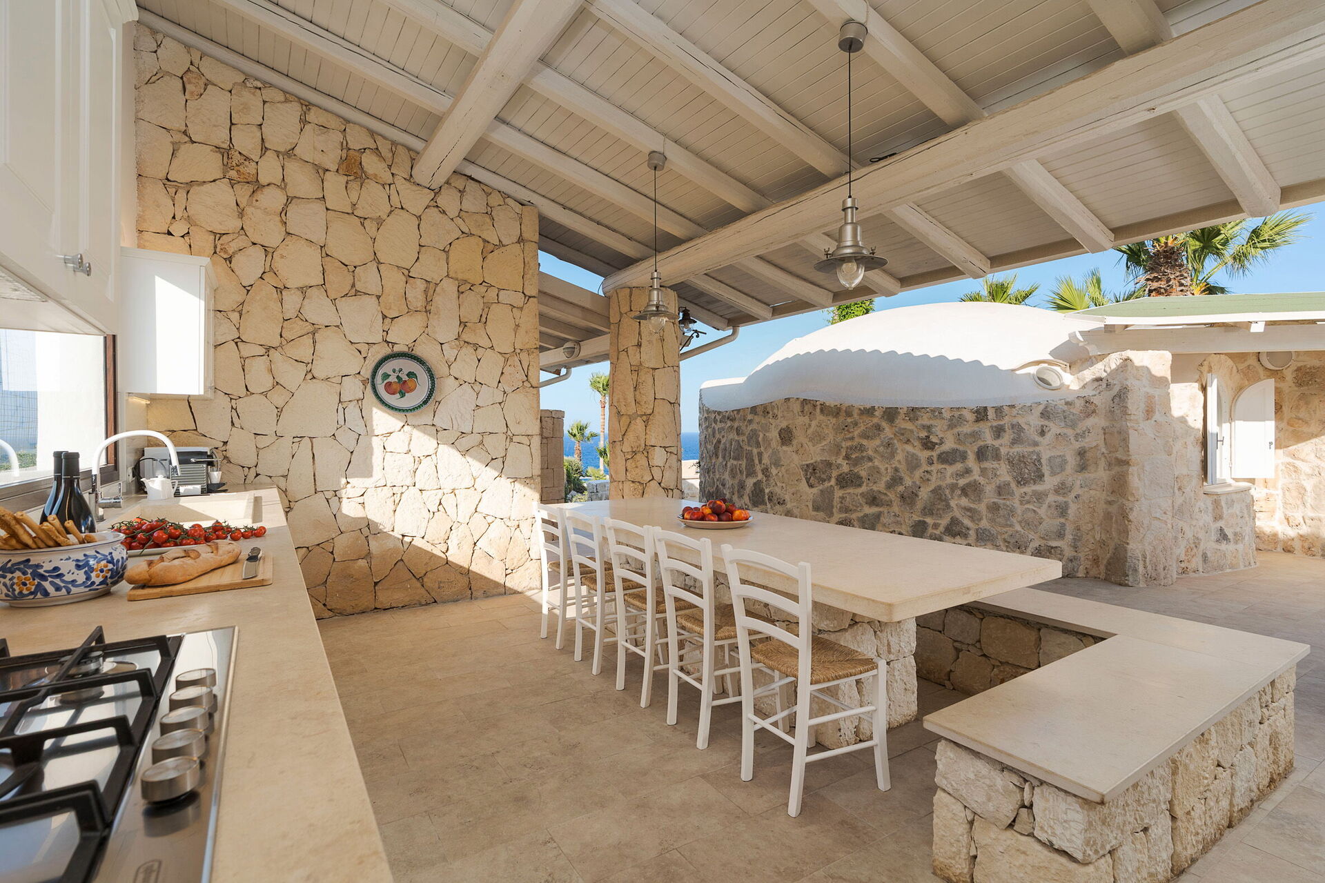 Lovely outdoor kitchen, fully equipped with BBQ and wood-burning oven, also a regular oven and dishwasher.