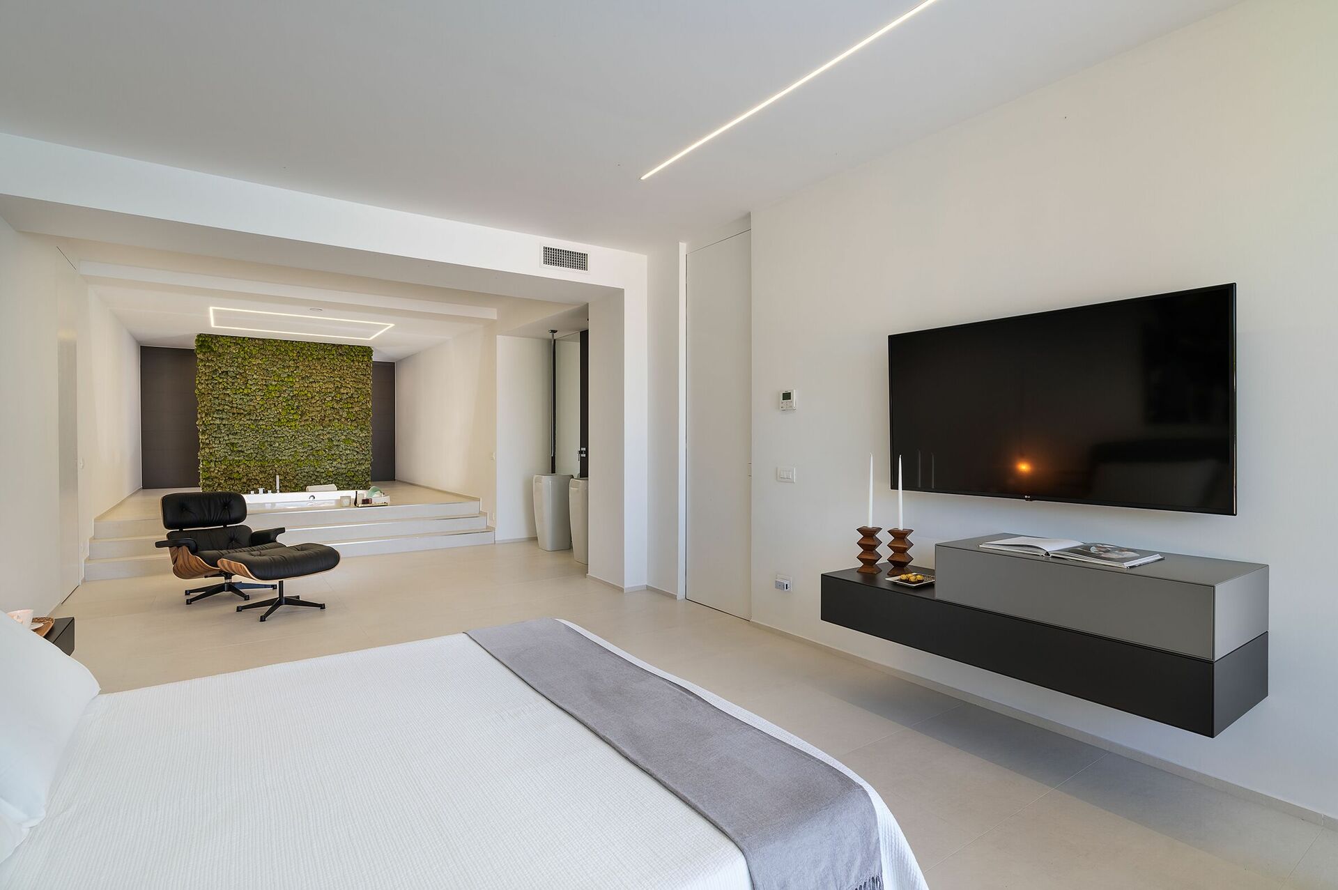 Opholdsstue, spiseplads, køkken (ovn, fryser, opvaskemaskine og kaffemaskiner), soveværelse med dobbeltseng (med kingsize seng) med privat badeværelse med bruser , soveværelse med dobbeltseng, 1 badeværelse (vask og toilet).
