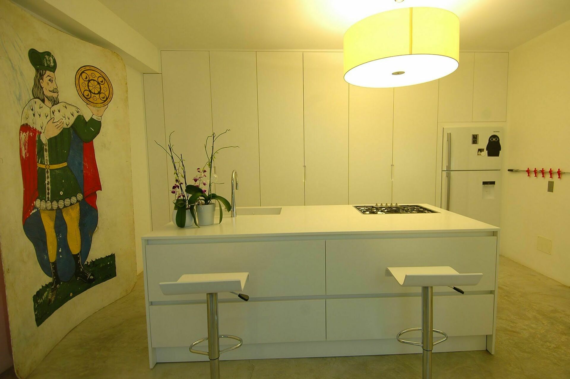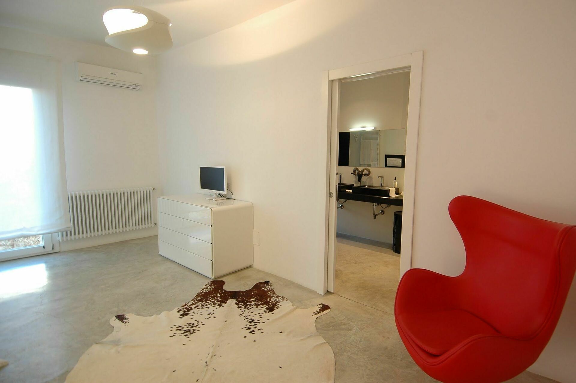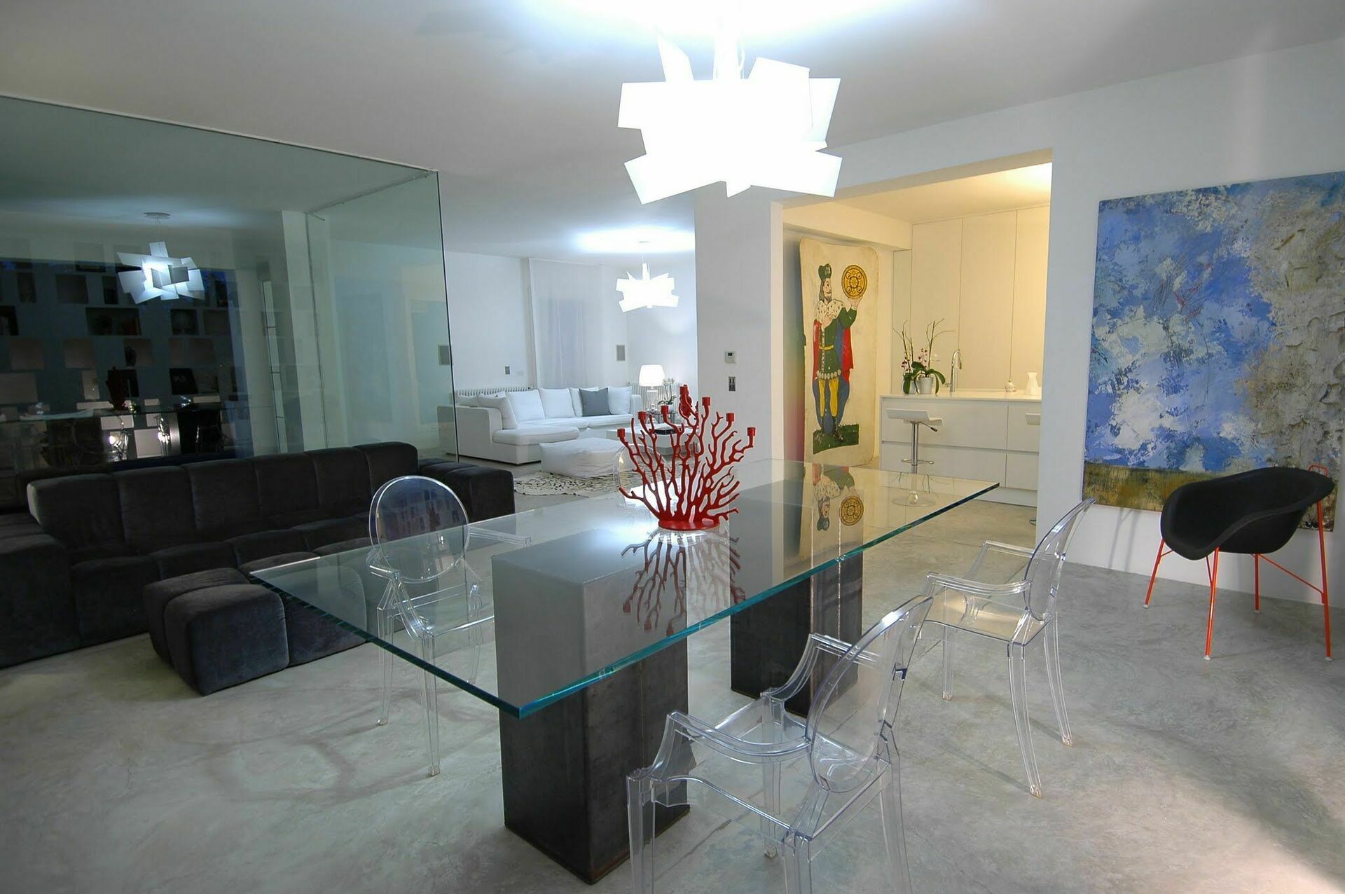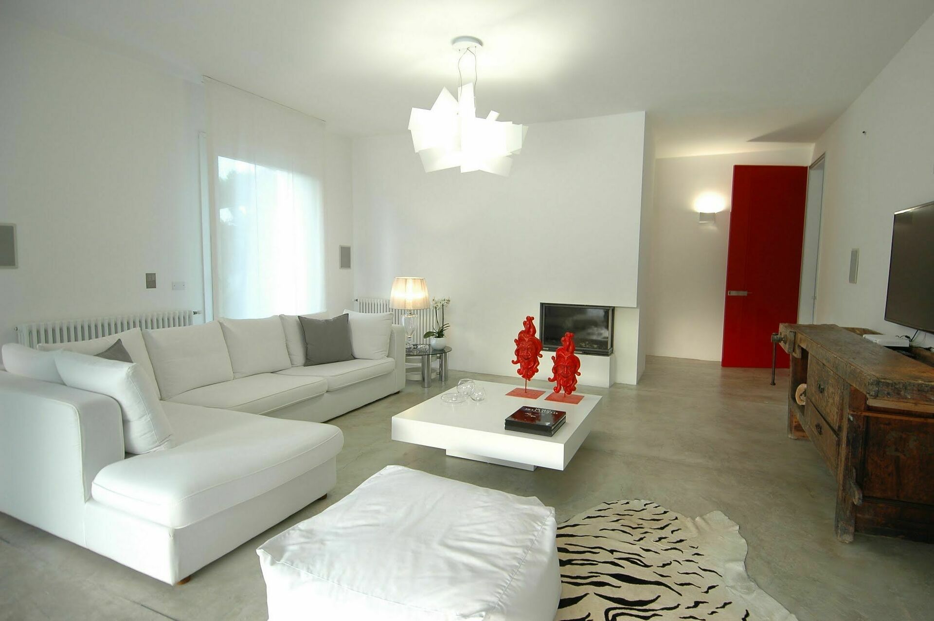 Huset er indrettet i moderne minimalistisk stil med store lyse overflader.