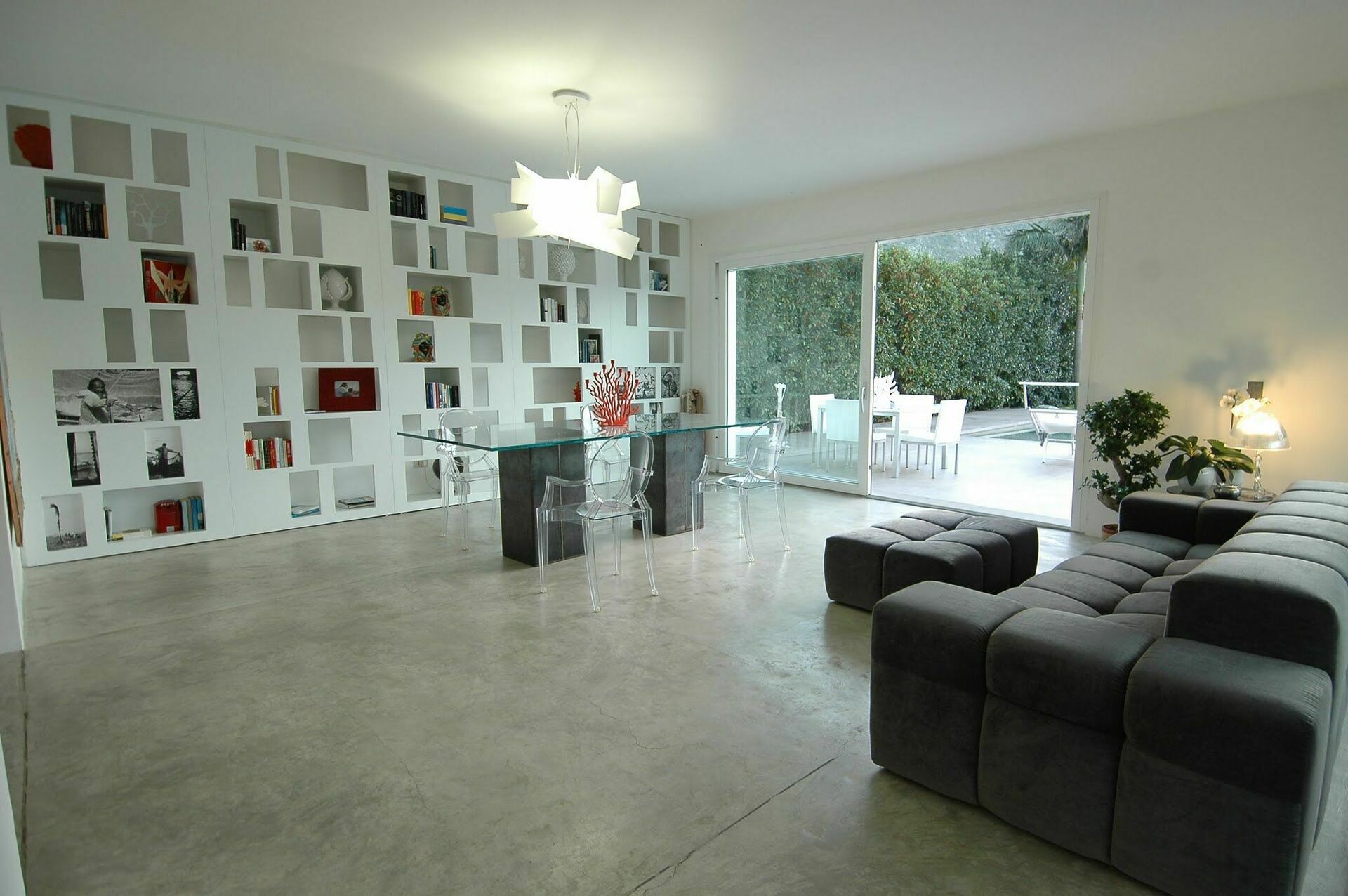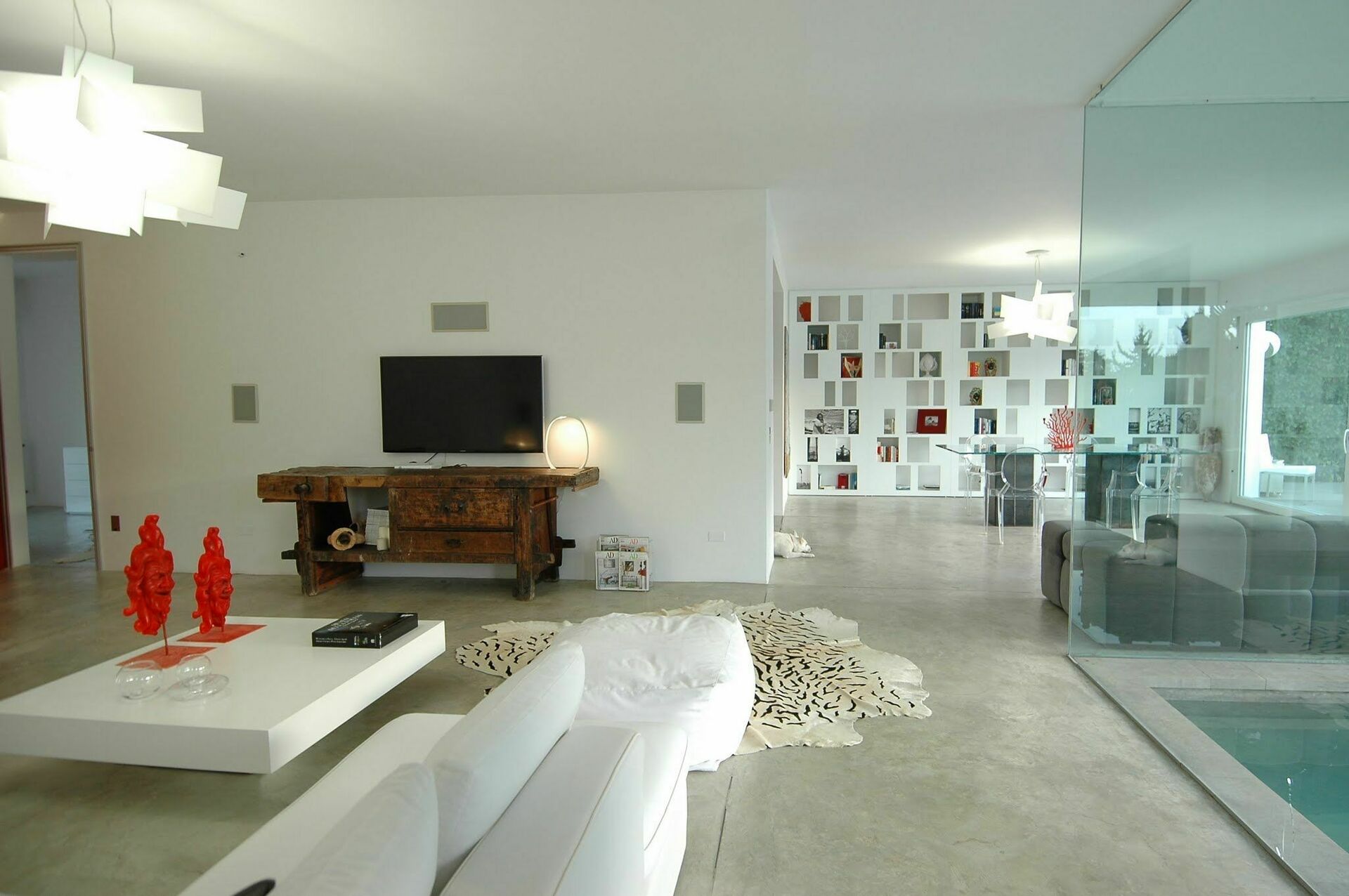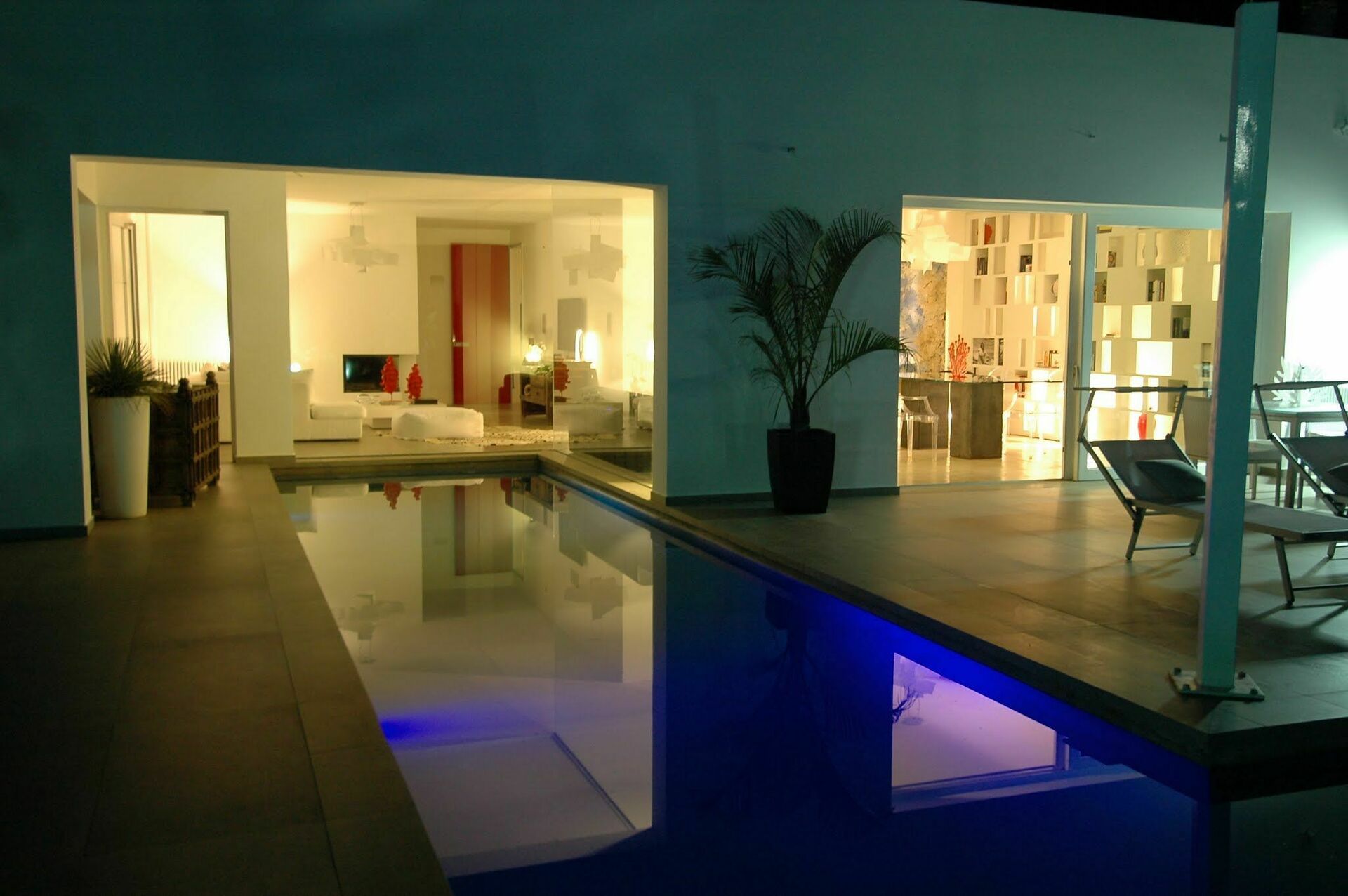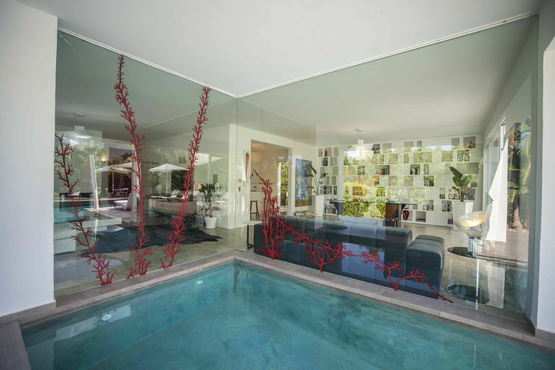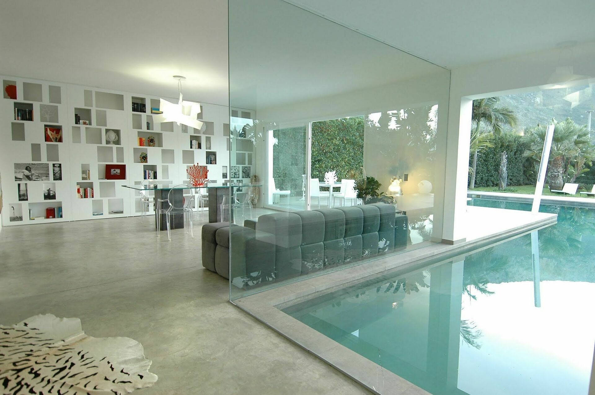 Den store stue skaber en glidende overgang til udendørsområdet med sine store vinduer, så det ser ud som om poolen strækker sig ind i stuen.
