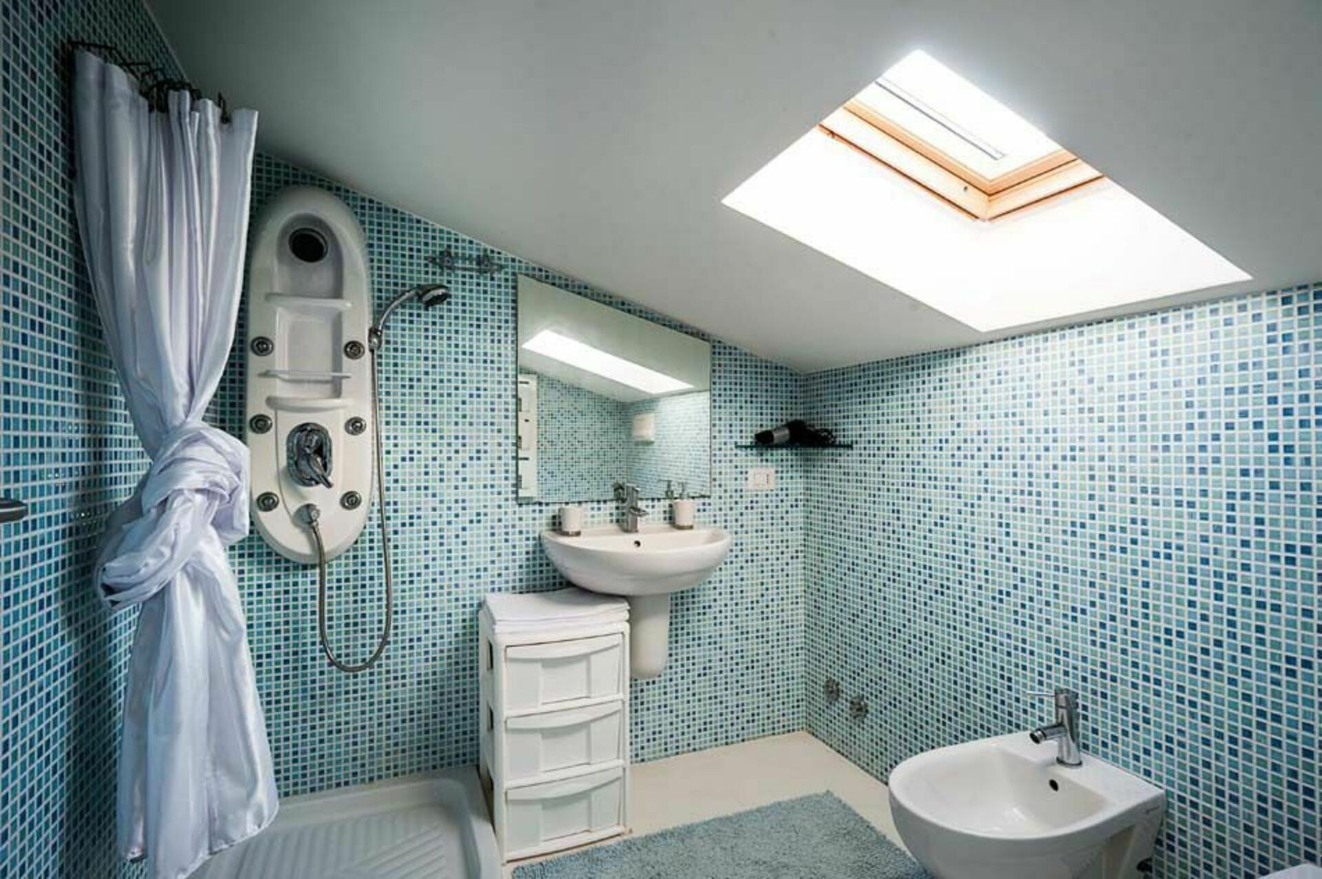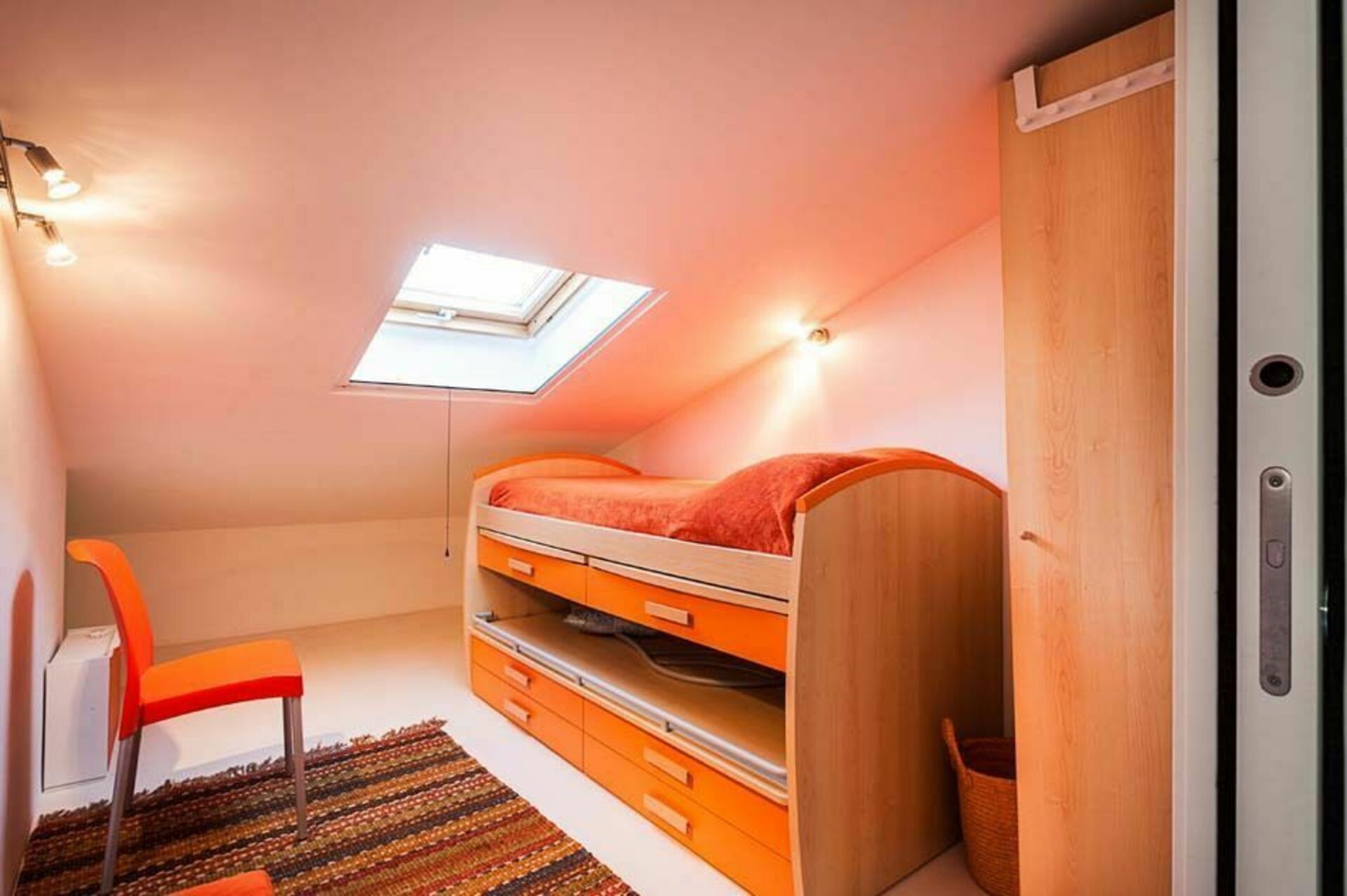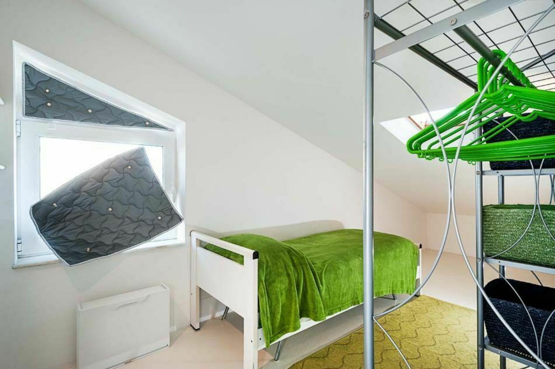 - free designer stairs leading upstairs (to the bedrooms) without handrail (difficult for disabled people or small children), adults cannot stand upright everywhere in the bedrooms and the bathroom upstairs