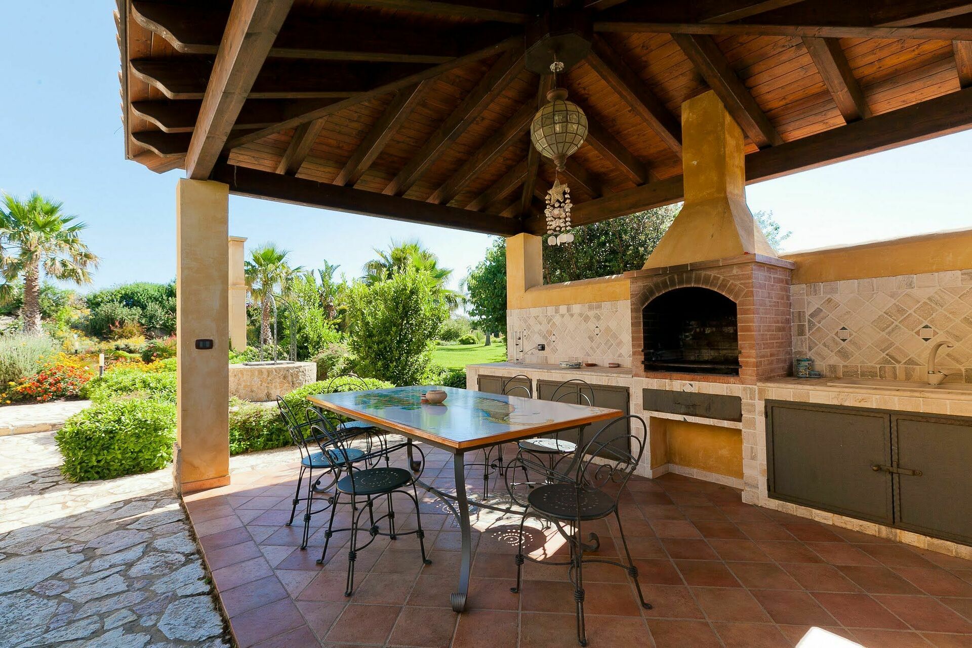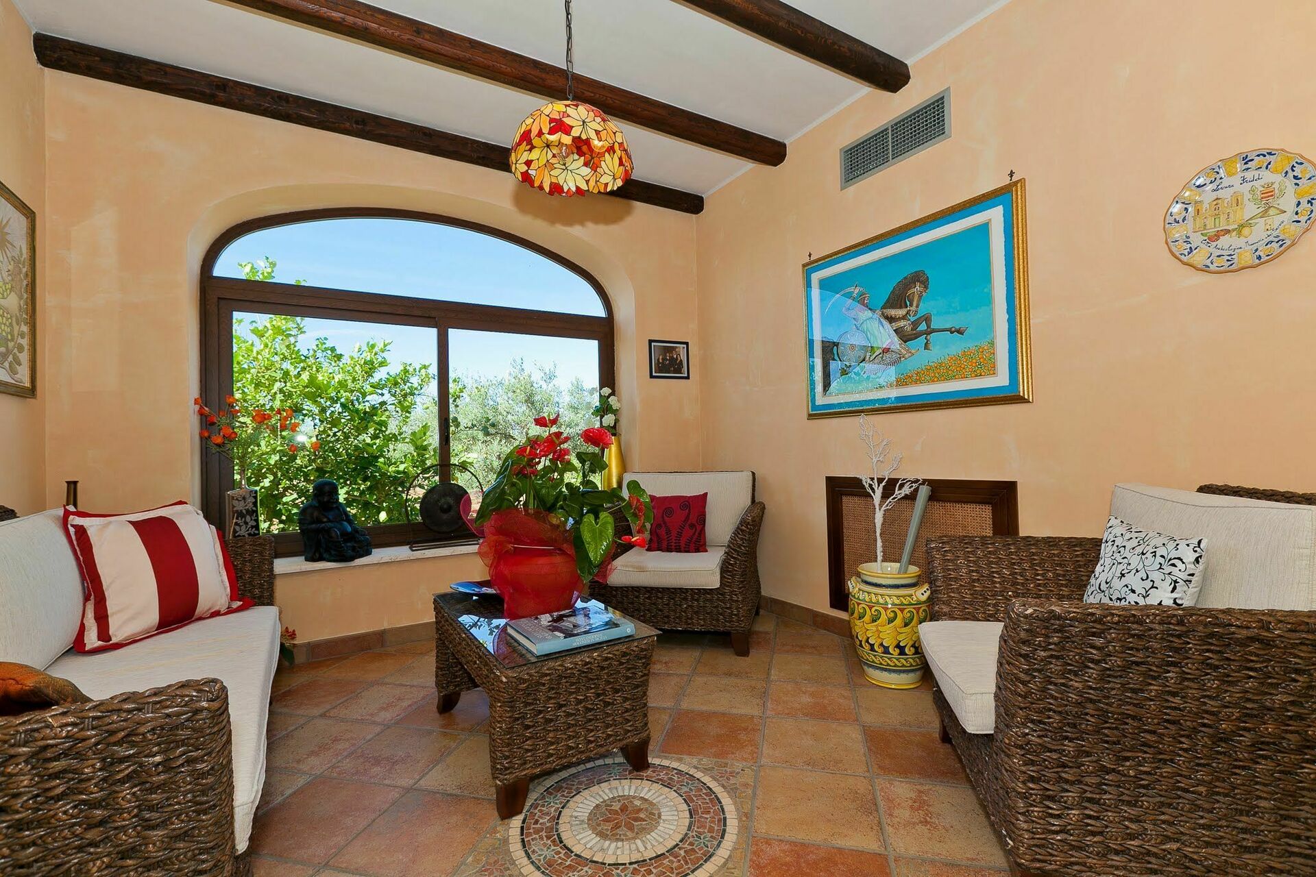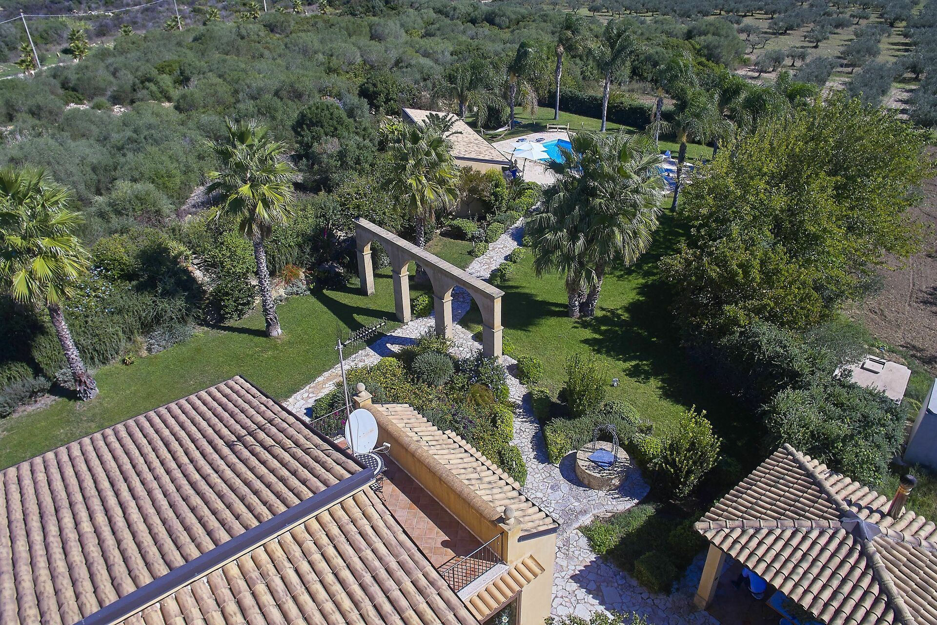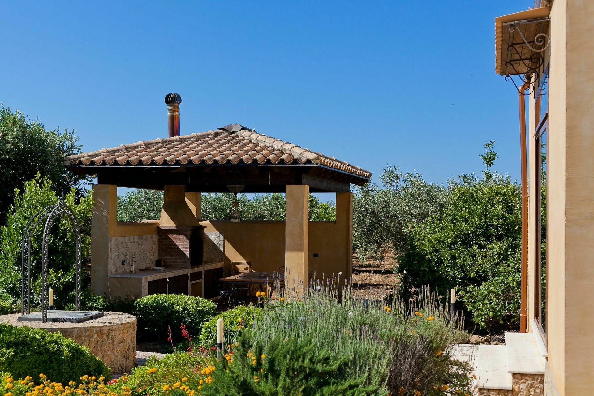 I haven er der også en gårdhave med udekøkken, grill og et dejlig siciliansk majolica bord hvor du kan nyde lækre udendørs middage. Huset er en del af en større ejendom på 14.000 kvadratmeter jord dyrket med olivenlunde, vinmarker og frugttræer.
