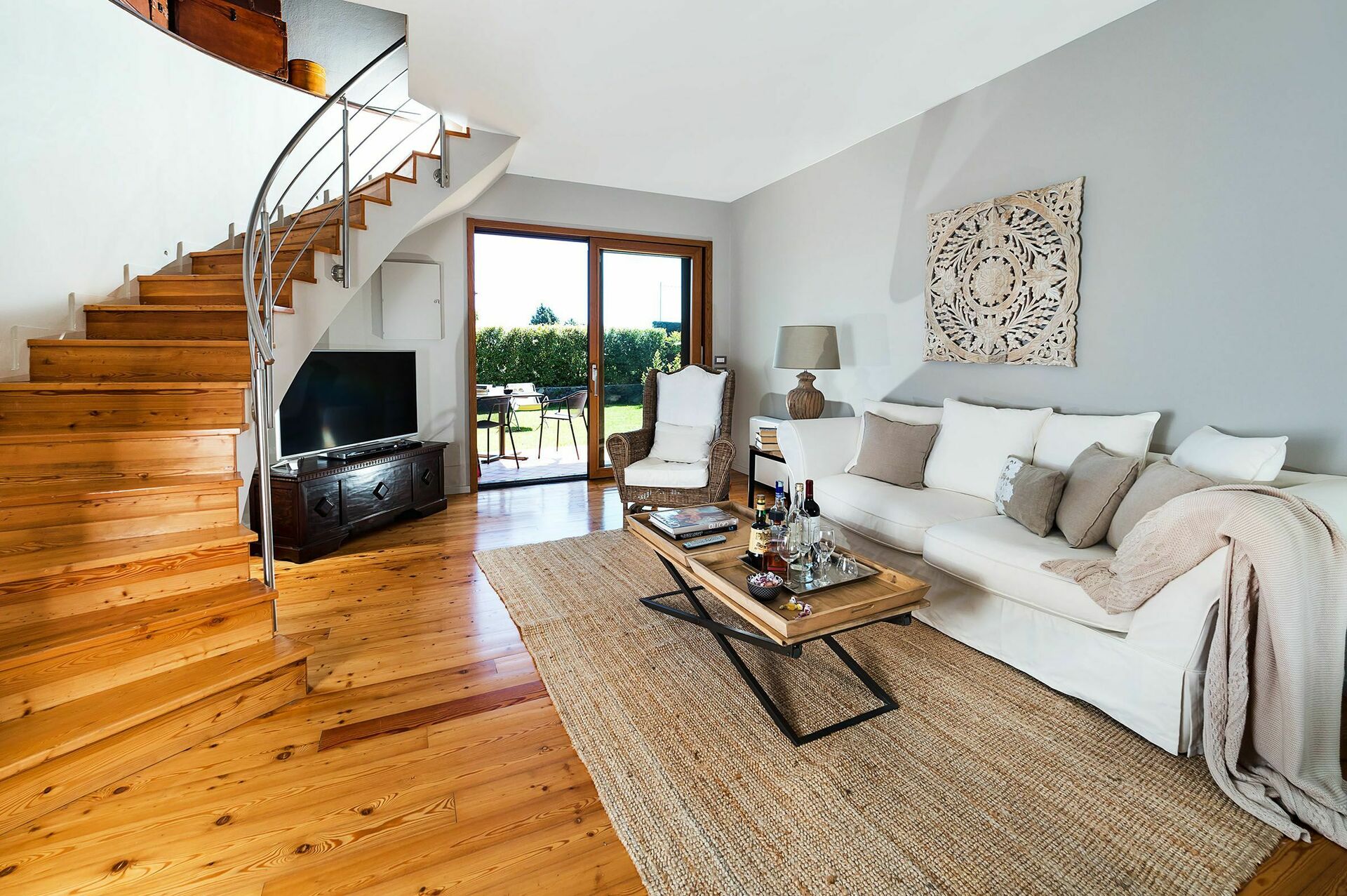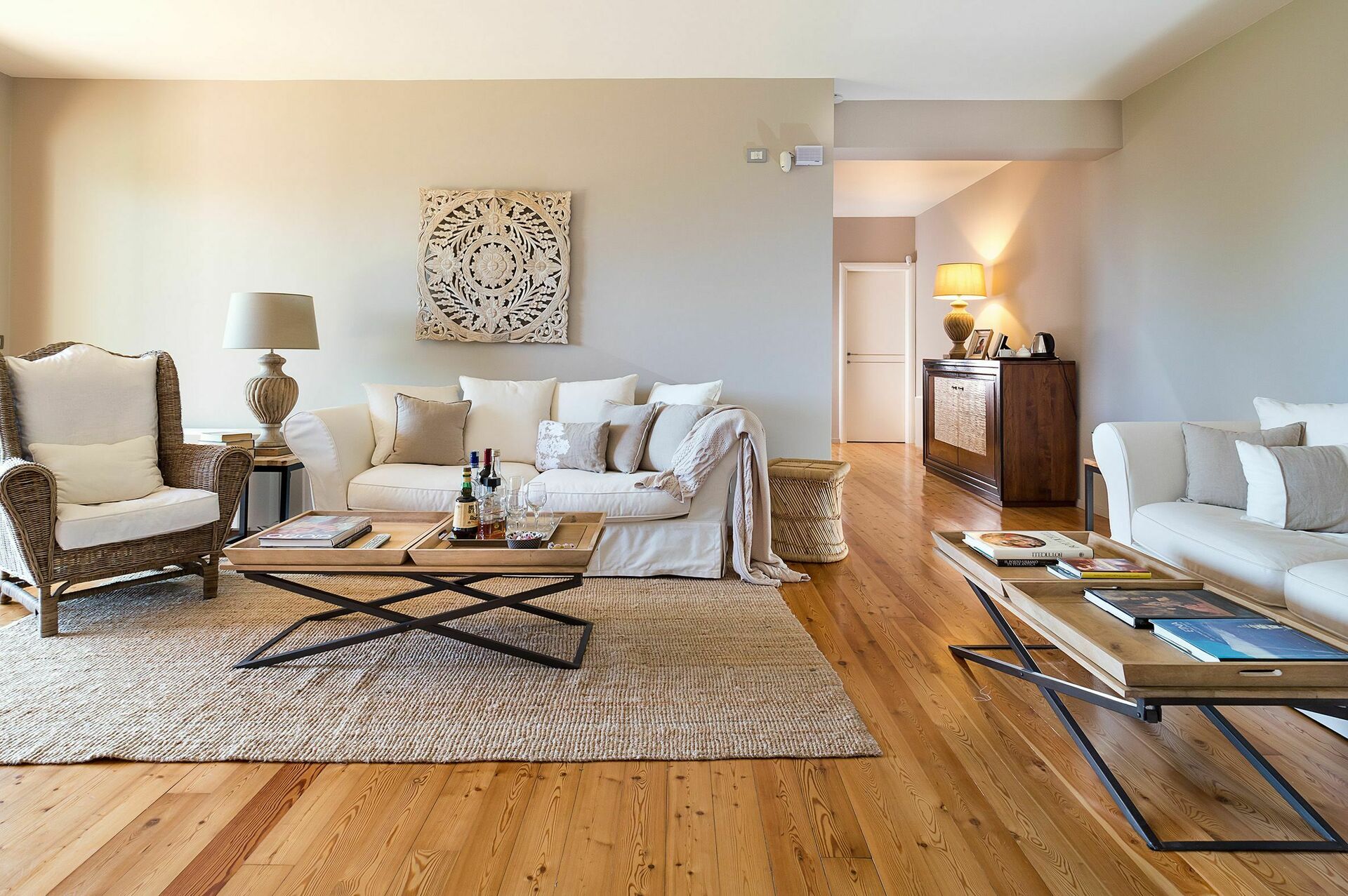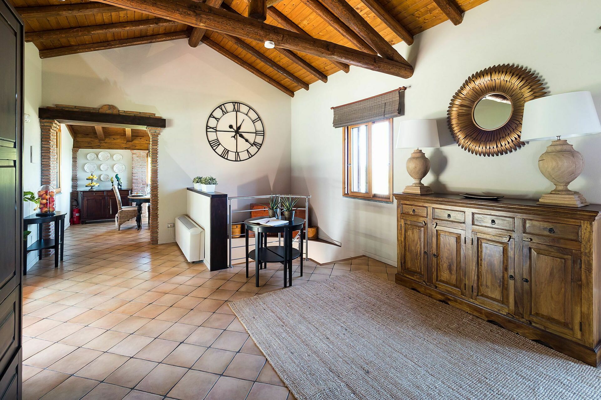 Denne smukke bolig tilbyder gæsterne raffinerede, elegante værelser indrettet til perfekt komfort med de bedste materialer, indretning og møblering, såsom parketgulve og smukke tekstiler. I stueetagen er den varme hyggelig opholdsstue, med en spisestue og et fuldt udstyret murkøkken. Fra spisestuen fører en trappe til nederste etage med tre vidunderlige soveværelser med eget badeværelse, en gang med en sovesofa og en lys stue.