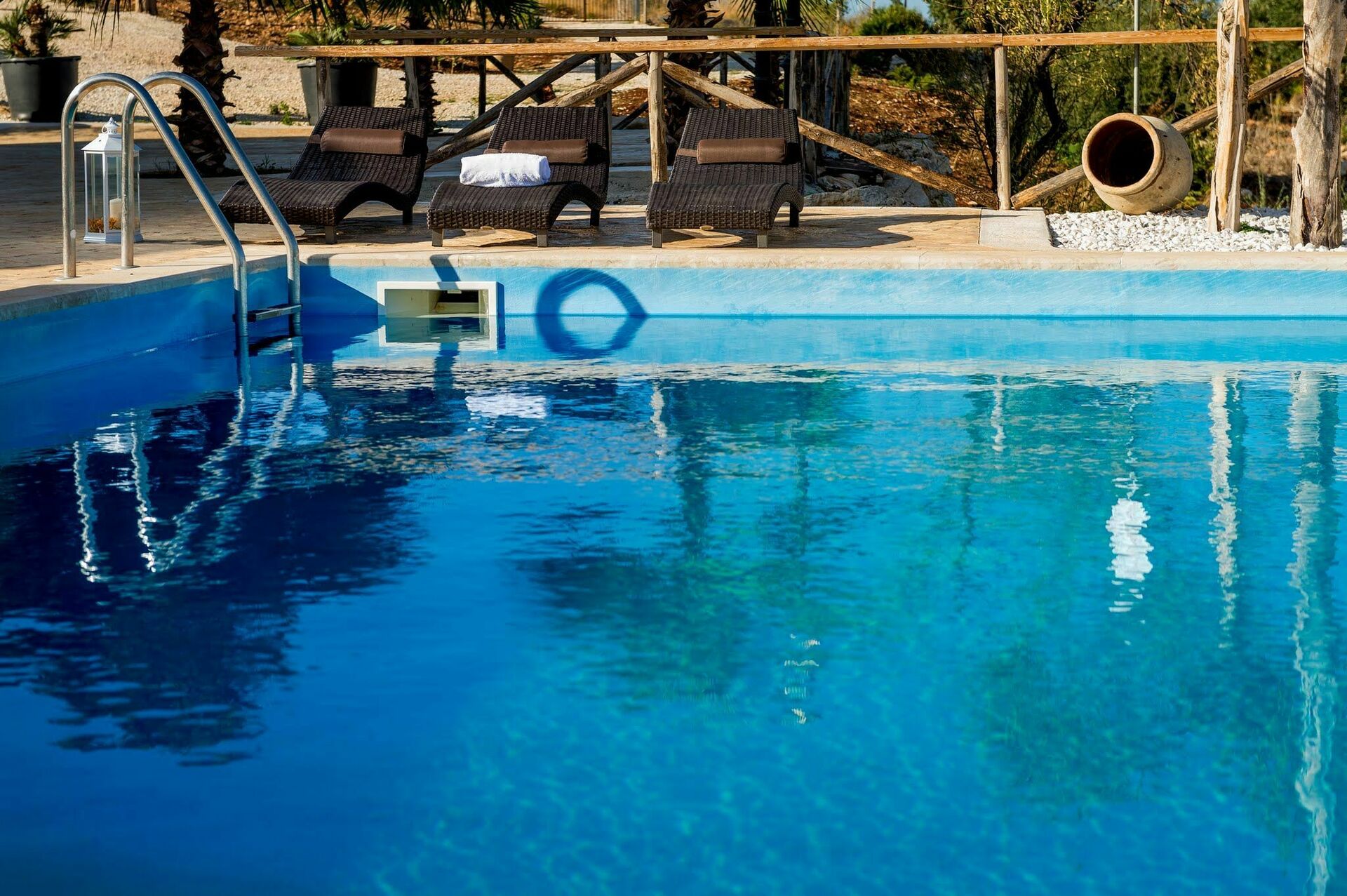 Ejendommen har en ankomst, en stor naturlig have mellem mælkehvide klipper og en smukt oplyst privat pool med havestole og parasoller.