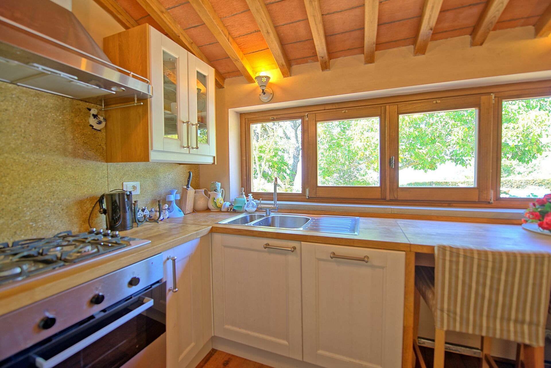 Feriehuset er smagfuldt indrettet med romantisk interiør. Udenfor er der en velholdt have med dejlig privat pool og tennisbane. Til de køligere aftener er der en udendørs pejs.
