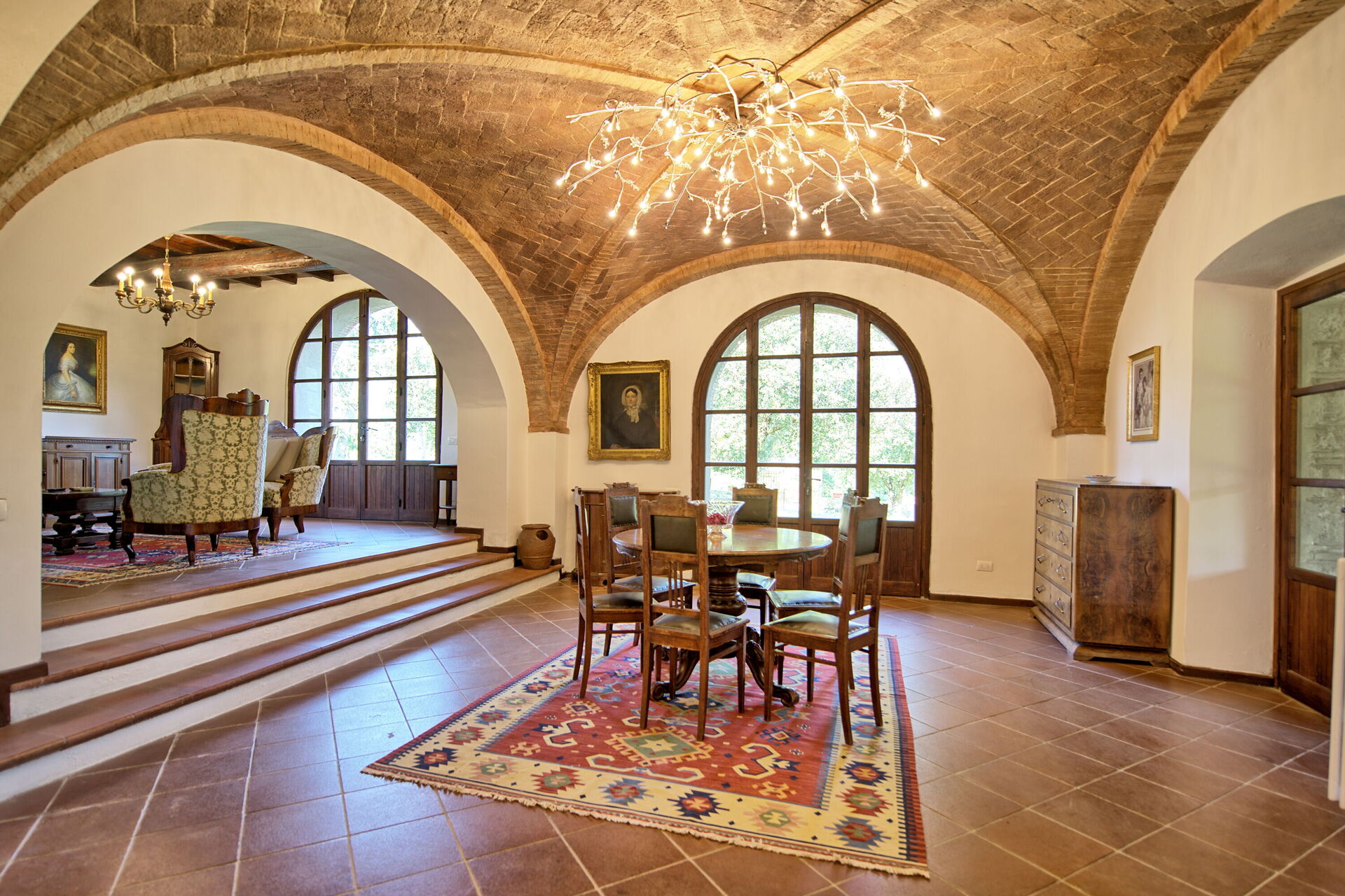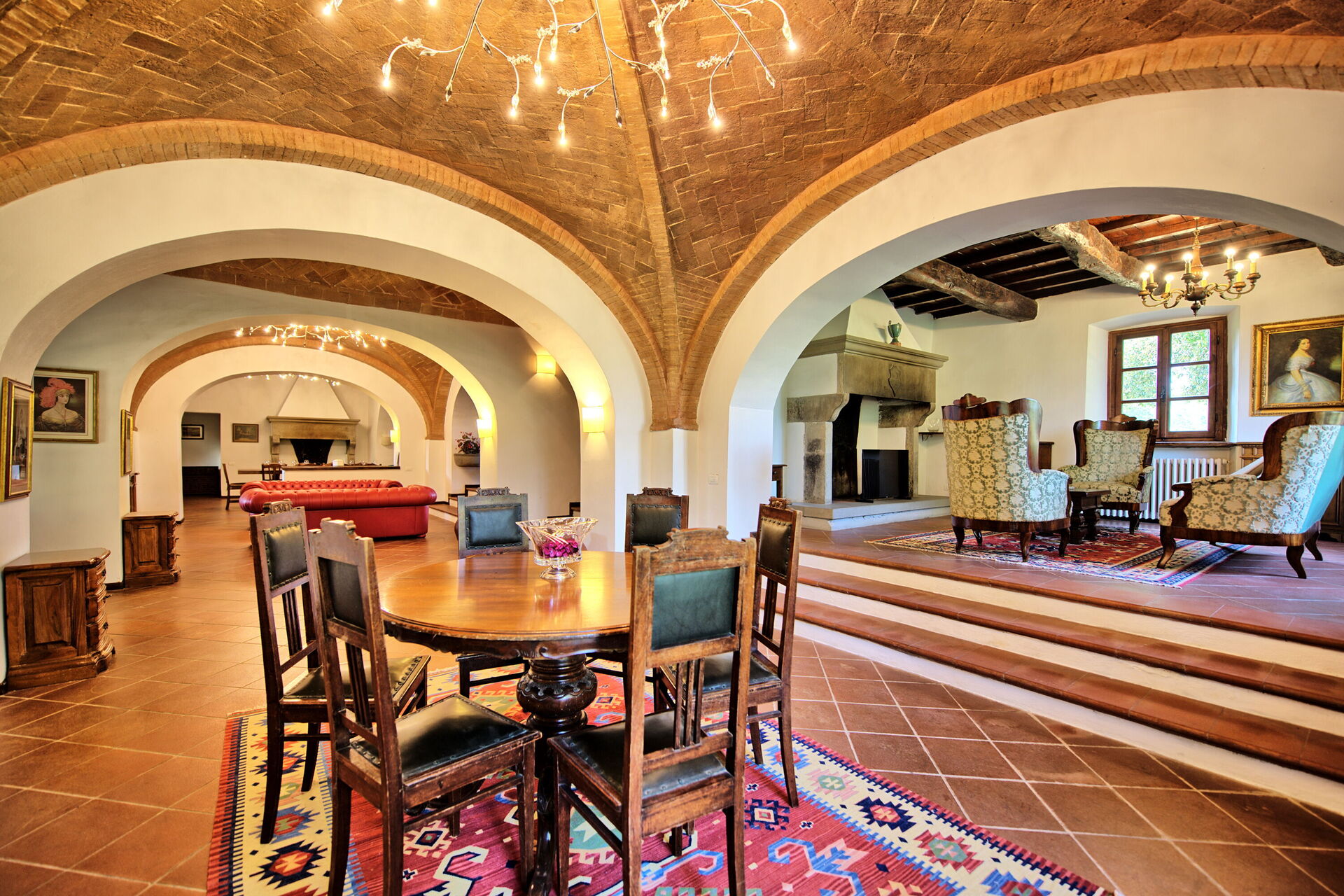 Stor stue fordelt som tre forskellige stuer, to af dem med åben pejs og en stor spisestue med plads til at alle kan sidde sammen.