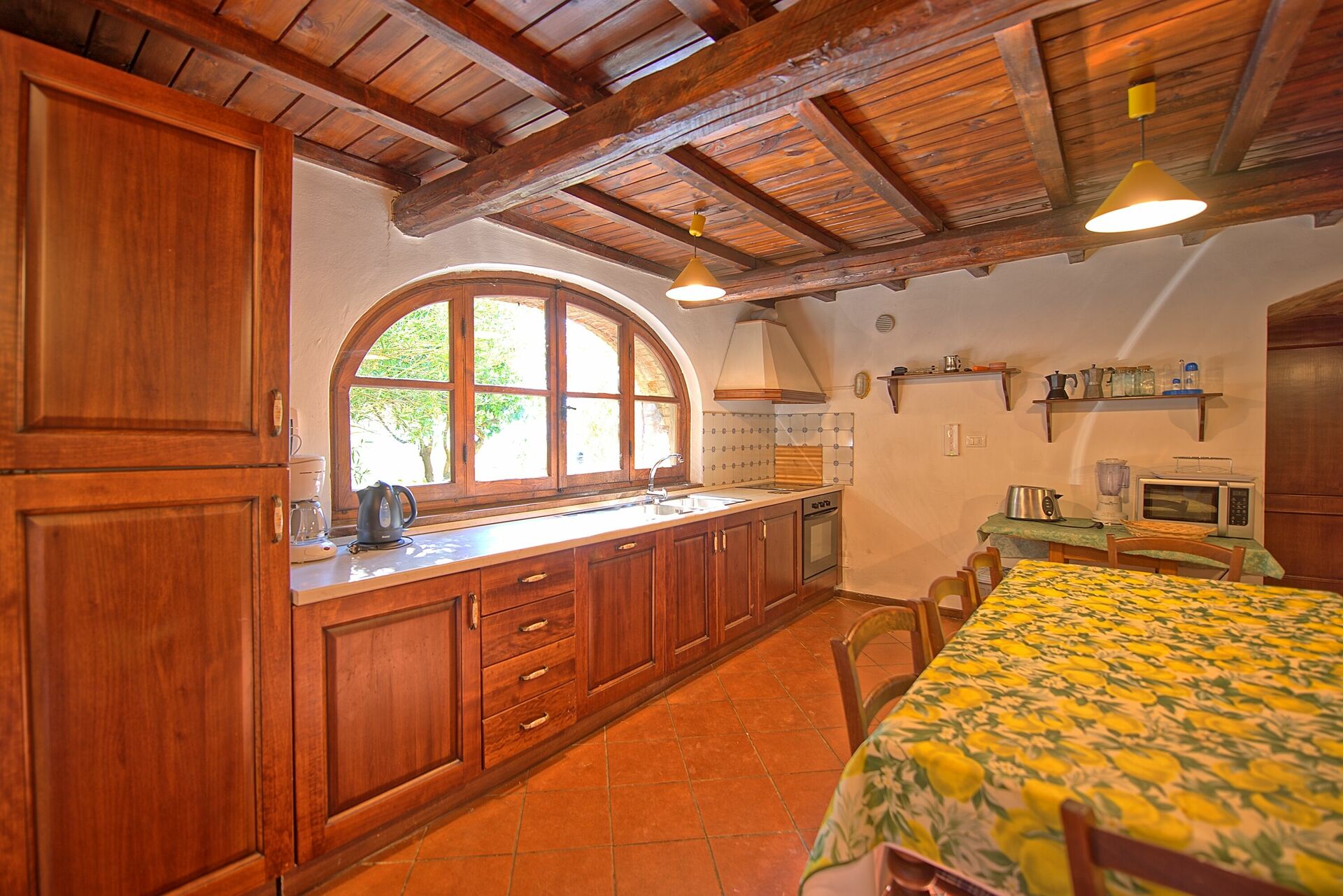 Køkkenet har direkte udgang til haven og overdækket terrasse til udendørs spisning. I køkkenet finder du et stort 6-brænder komfur med ovn og grill. Der er 2 store køleskabe, det ene i køkkenet og det andet i depotrummet.
