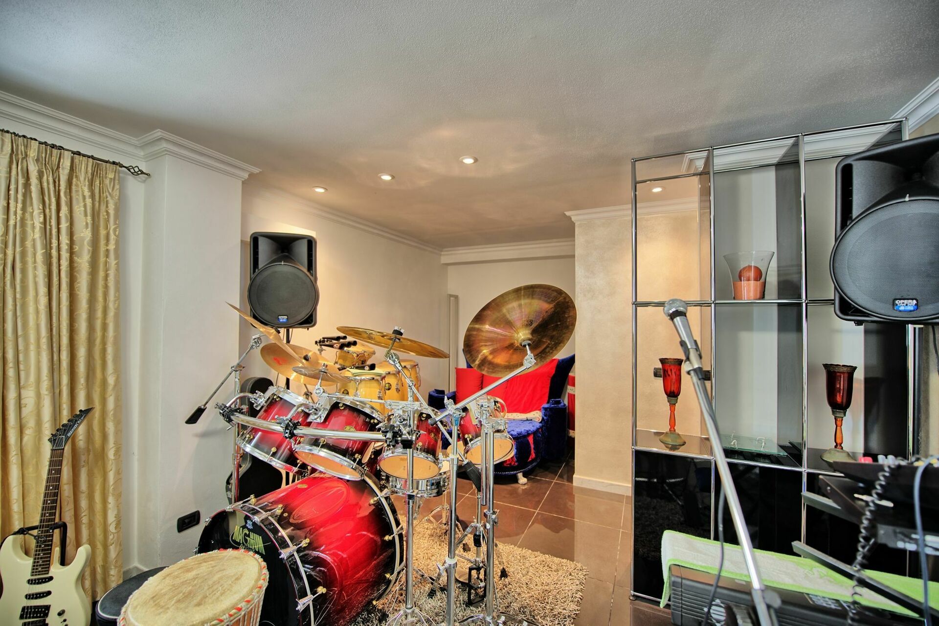 Der er også trommer, et keyboard, mikrofon og karaoke stereo.