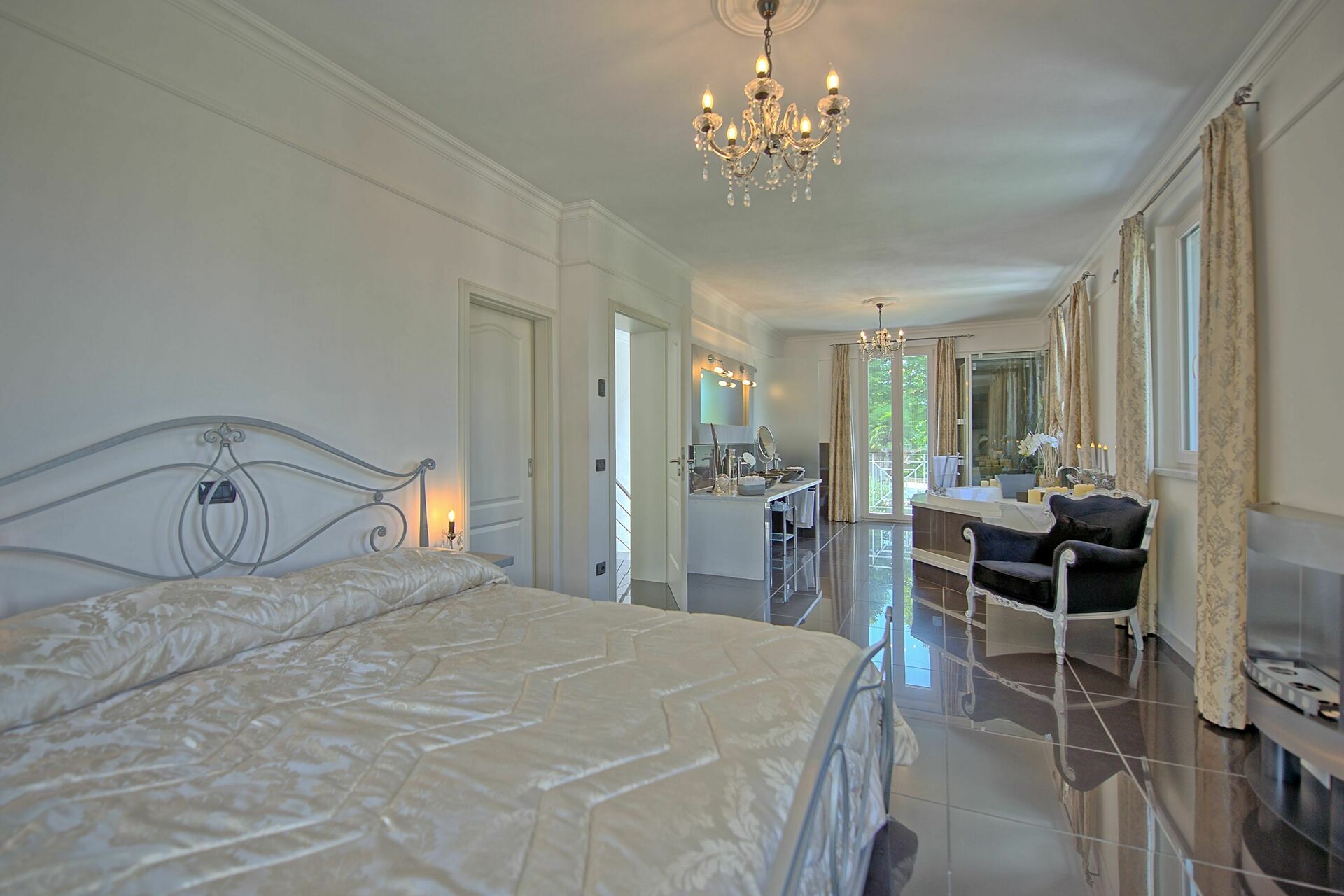 Første sal: suite med privat bad med sauna, jacuzzi, garderobe og tv med hifi.