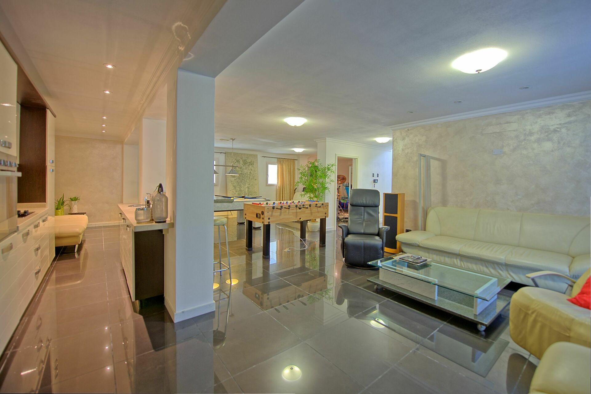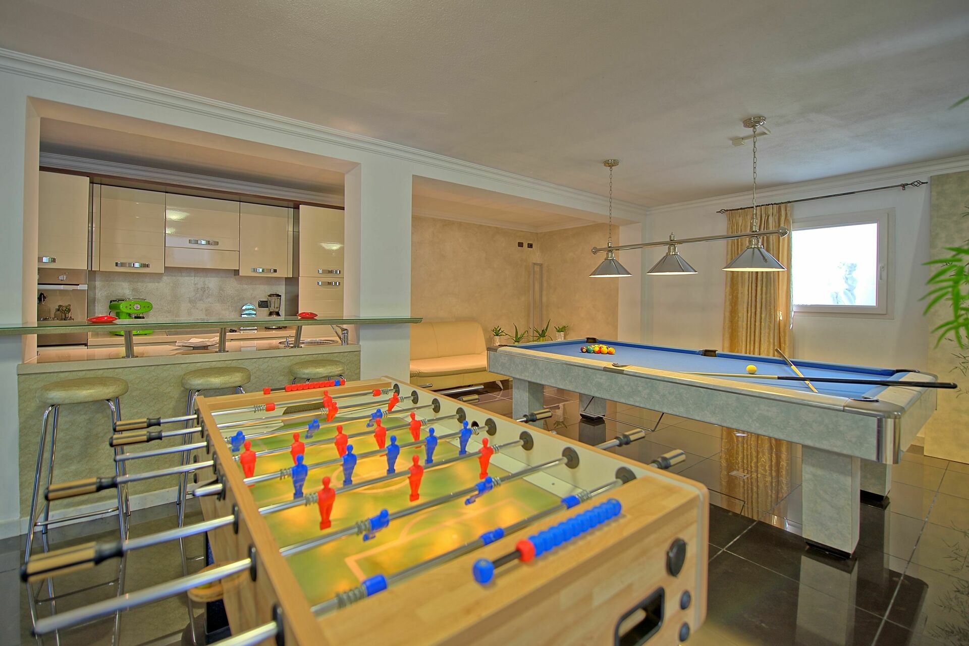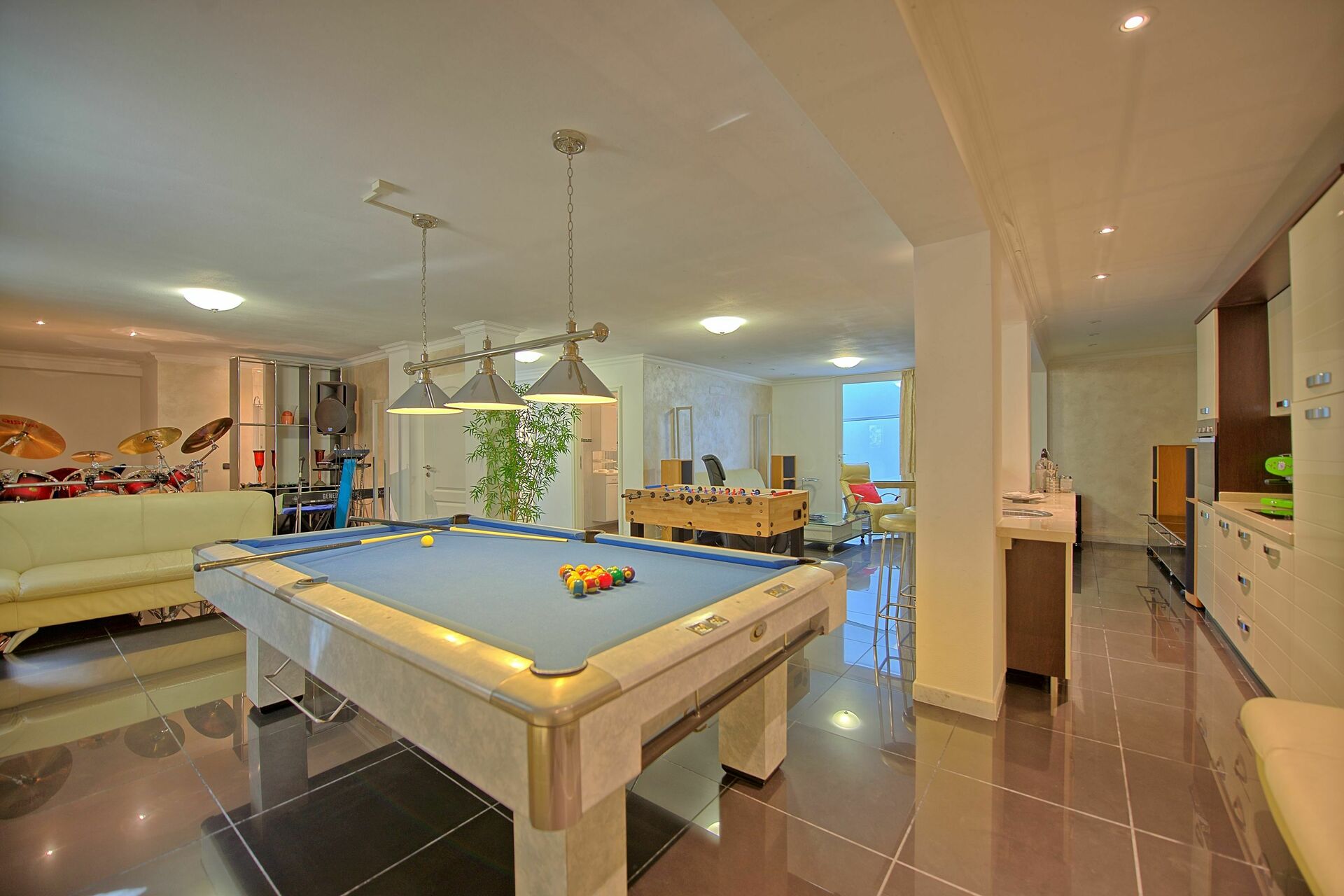 I kælderen finder du et poolbord og bordfodbold, biograf, hi-fi.