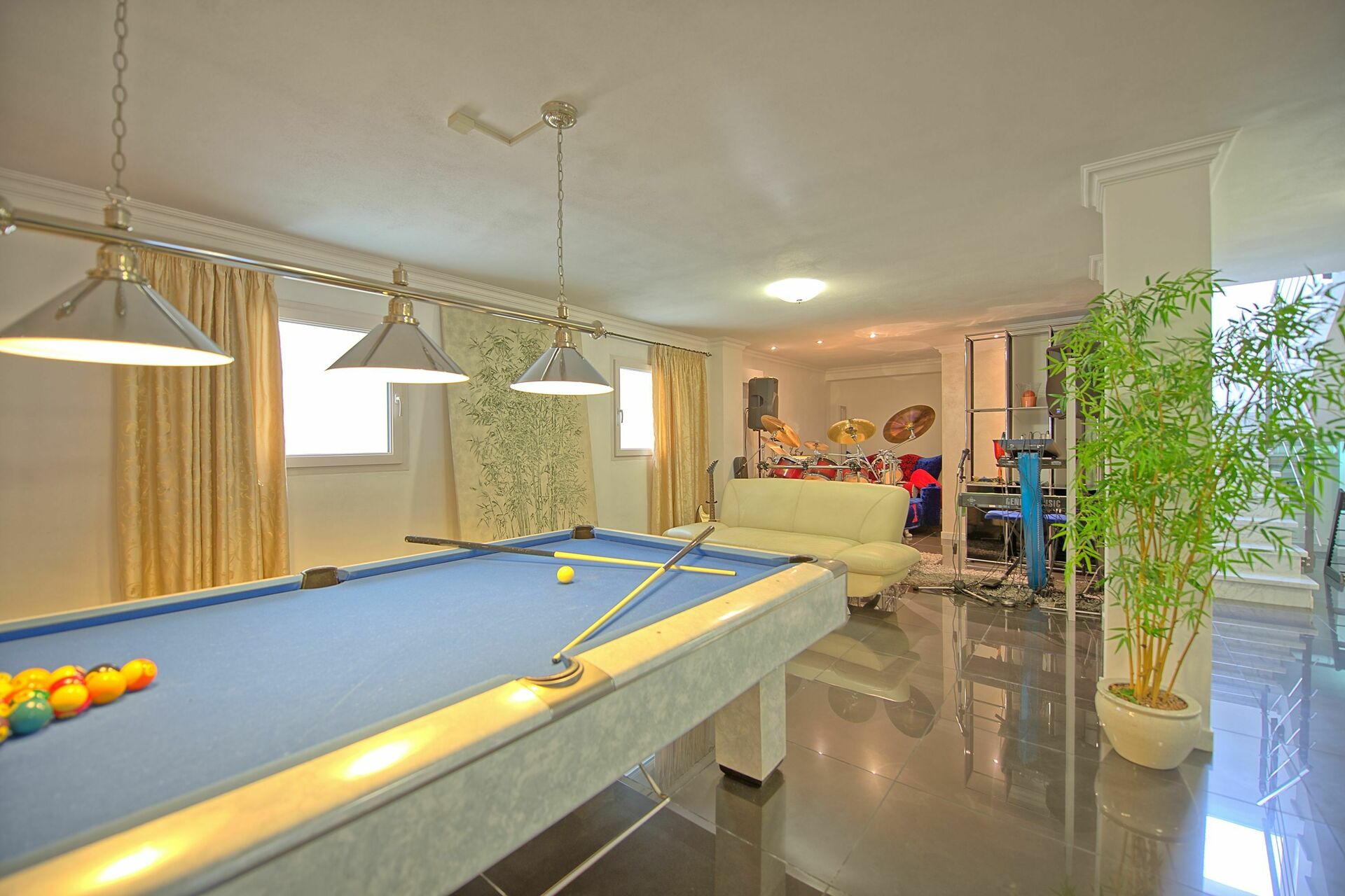 We found the Villa to be lovely, with lots of space for all of us. The bedrooms are very spacious, as were the bathrooms. There are a few seating areas - inside the main entrance there were two couches and a large dining area. Outside, there is a seating area facing the mountains - which was lovely to sit in the morning or an evening chatting, and also a large outdoor table which was covered and is lovely to eat lunch or dinner. There is a downstairs basement with a lot more couches, and entertainment. There is a foos-ball table; a pool table and a drum kit with keyboard and microphone! Very entertaining and great fun!