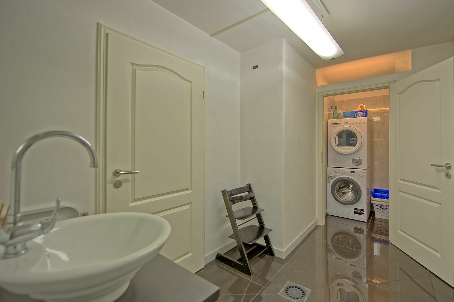 The basement also has a utility room with sink, washing machine and tumble dryer, with equipment to hang washings.
