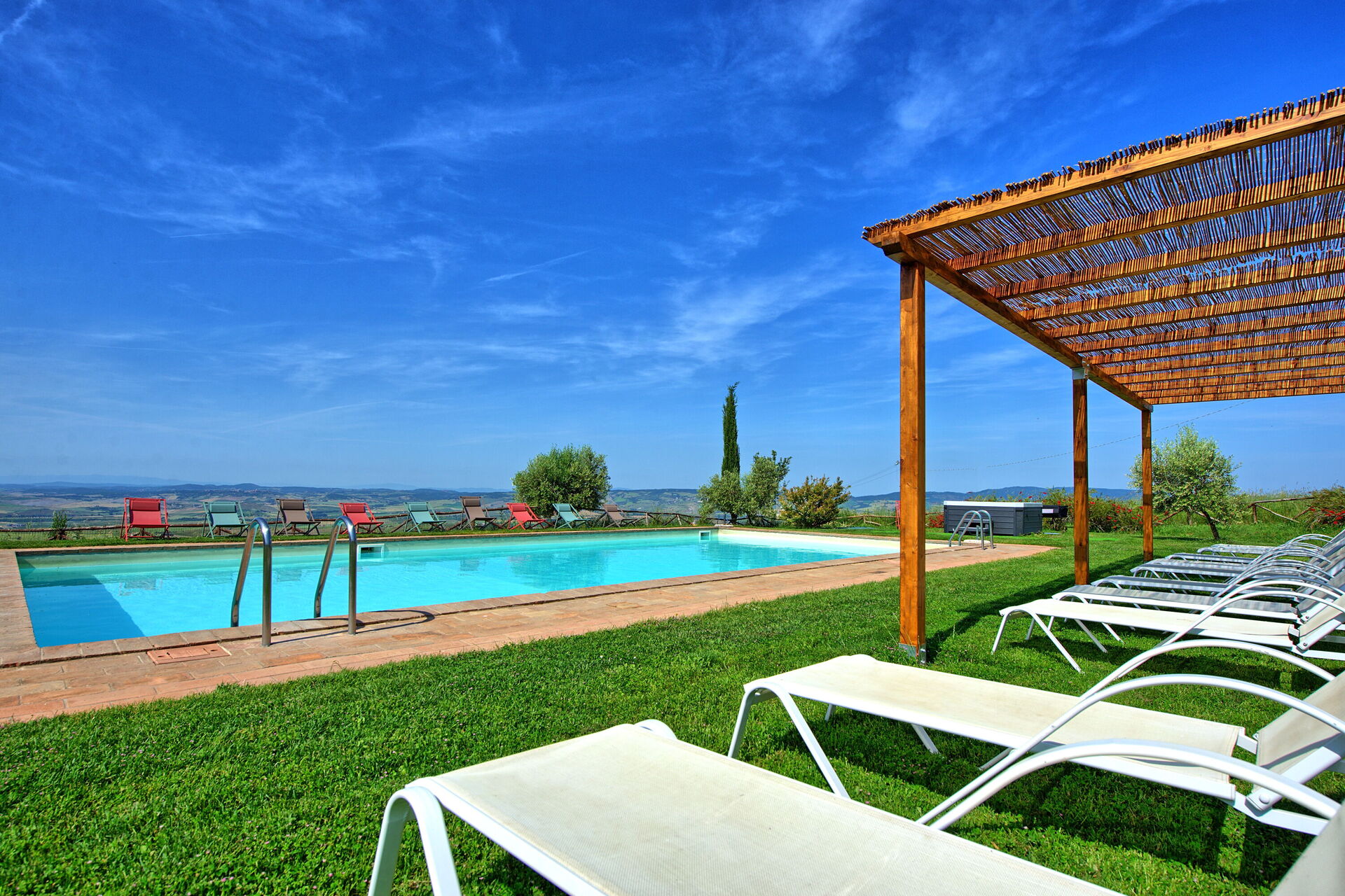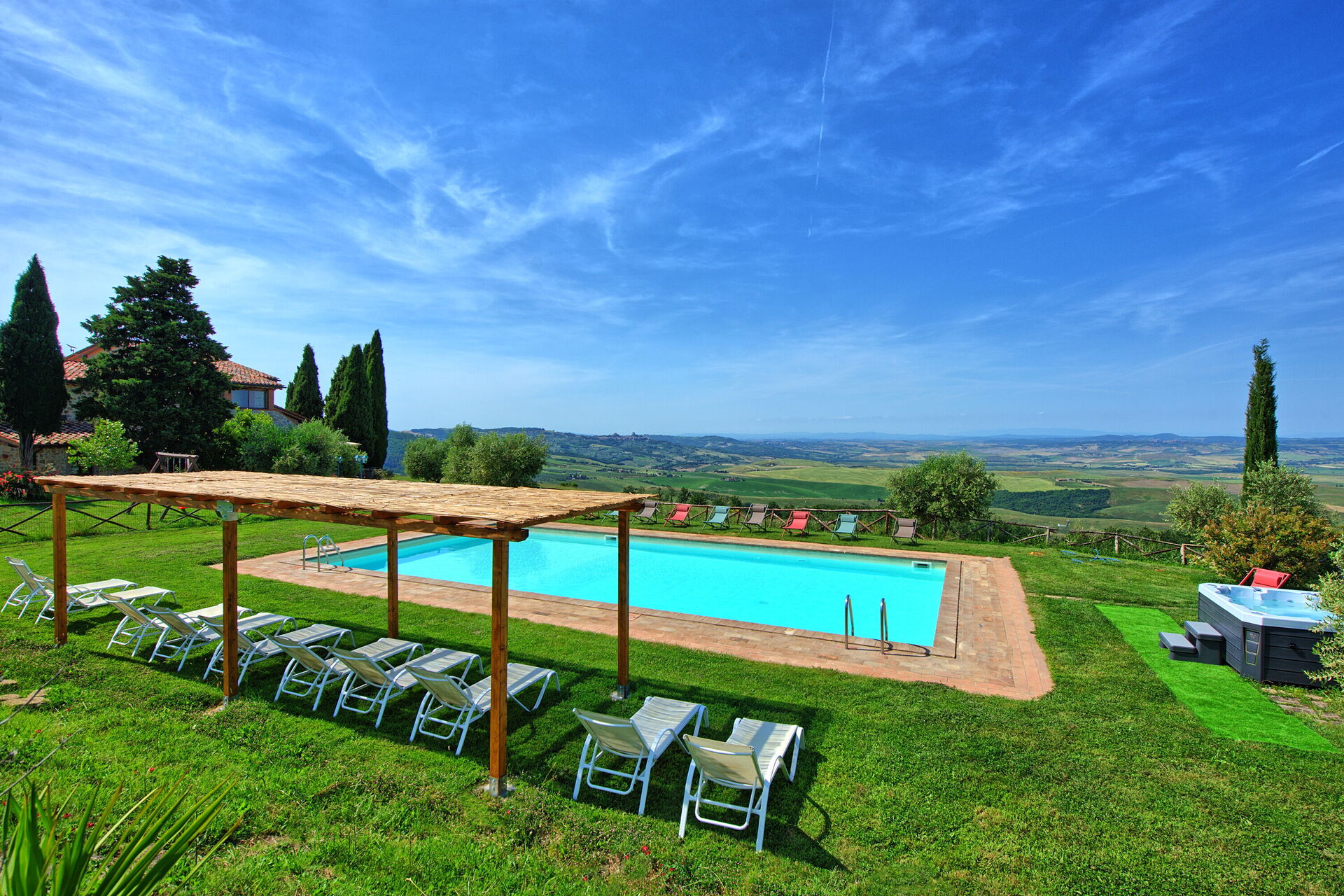 Villa til leje med privat swimmingpool og jacuzzi i Val d'Orcia syd i Toscana. Feriehuset er omgivet af en stor have og tilbyder panoramaudsigt over dalen nedenfor.