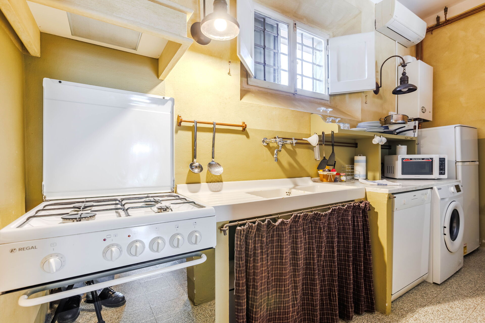 Stueetage: studielejlighed med dobbeltseng (aircondition) og spiseområde med tekøkken (kogeplader, køleskab, ovn, mikrobølgeovn, kaffemaskine, opvaskemaskine), badeværelse med bruser.