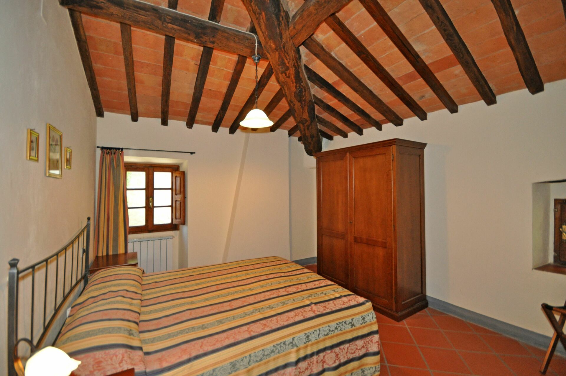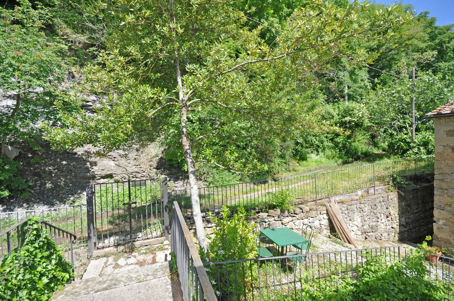 1st floor (small, nice access door – access via a personal furnished outdoor area): living-room with fireplace, dining area (satellite TV) and kitchen corner (2 electric plates), bathroom with bathtub (hairdryer), bedroom with a single bed.