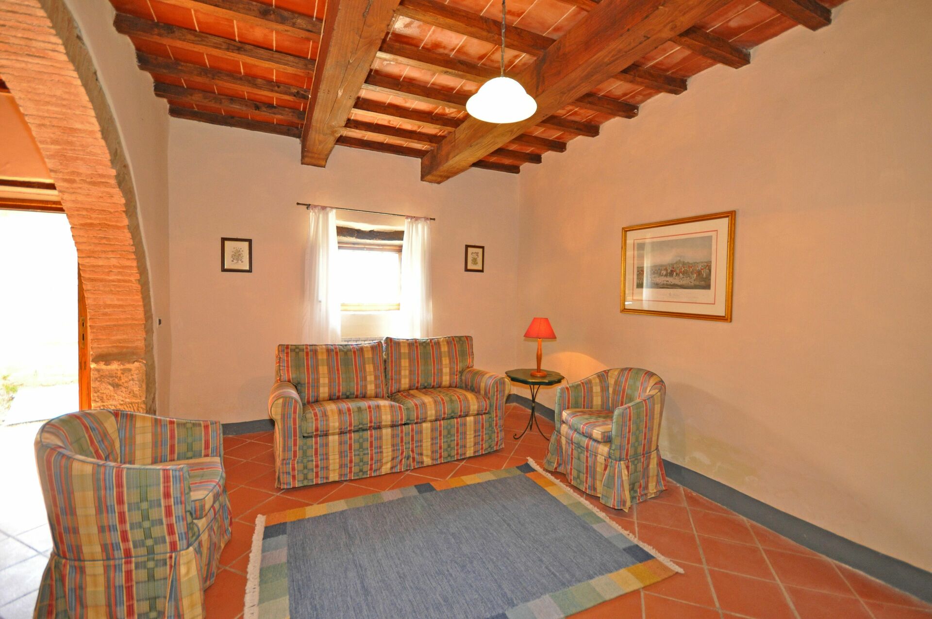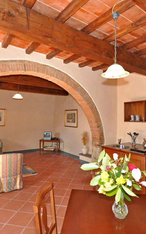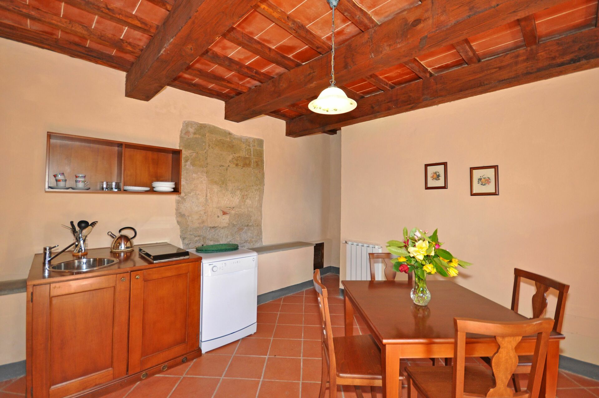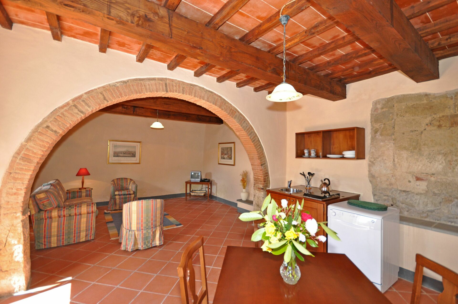 Stueetage: stue (satellit-tv), køkkenhjørne (opvaskemaskine, 4 elektriske plader), spiseplads og udgang udad med et personligt møbleret område.